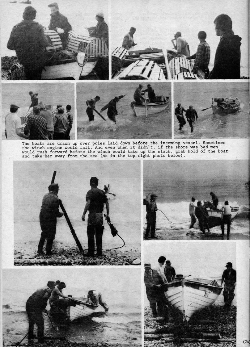 Published by Ronald Caplan on 1980/6/1 (413 reads)The boats are drawn up over poles laid down before the incoming vessel. Sometimes the winch engine would fail. And even when it didn't, if the shore was bad men would rush forward before the winch could take up the slack, grab hold of the boat and take her away from the sea (as in the top right photo below).