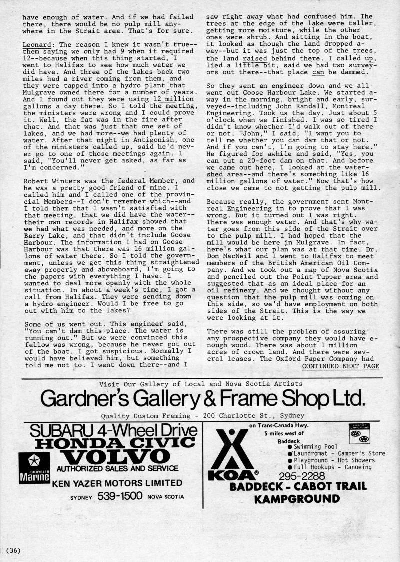 Published by Ronald Caplan on 1980/6/1 (323 reads)have enough of water. And if we had failed there, there would be no pulp mill any? where in the Strait area. That's for sure. Leonard: The reason I knew it wasn't true-- them saying we only had 9 when it required 12--because when this thing started, I went to Halifax to see how much water we did have. And three of the lakes back two miles had a river coming from them, and they were tapped into a hydro plant that Mulgrave owned there for a niamber of years . And I found out they were using 12''illion gallons a day there. So I told the meeting, the ministers were wrong and I could prove it. Well, the fat was in the fire after that. And that was just that one set of lakes, and we had more--we had plenty of water. After that night in Antigonish, one of the ministers called up, said he'd nev? er go to one of those meetings again, I said, "You'll never get asked, as far as I'm concerned." Robert Winters was the federal Member, and he was a pretty good friend of mine. I called him and I called one of the provin? cial Members--I don't remember which--and I told them that I wasn't satisfied with that meeting, that we did have the water-- their own records in Halifax showed that we had what was needed, and more on the Barry Lake, and that didn't include Goose Harbour. The information I had on Goose Harbour was that there was 16 million gal? lons of water there. So I told the govern? ment, unless we get this thing straightened away properly and aboveboard, I'm going to the papers with everything I have. I wanted to deal more openly with the whole situation. In about a week's time, I got a call from Halifax, They were sending down a hydro engineer, Would I be free to go out with him to the lakes? Some of us went out. This engineer said, "You can't dam this place. The water is running out." But we were convinced this fellow was wrong, because he never got out of the boat. I got suspicious. Normally I would have believed him, but something told me not to. I went down there--and I saw right away what had confused him. The trees at the edge of the lake were taller, getting more moisture, while the other ones were shrub. And sitting in the boat, it looked as though the land dropped a- way--but it was just the top of the trees, the land raised behind there. I called up, lied a little bit, said we had two survey? ors out there--that place can be dammed. So they sent an engineer down and we all went out Goose Harbour Lake. We started a- way in the morning, bright and early, sur? veyed- -including John Randall, Montreal Engineering. Took us the day. Just about 5 o'clock when we finished. I was so tired I didn't know whether I'd walk out of there or not, "John," I said, "I want you to tell me whether you can dam that or not. And if you can't, I'm going to stay here." He figured for awhile and said, "Yes, you can put a 20-foot dam on that. And before we came out here, I looked at the water? shed area--and there's something like 16 million gallons of water." Now that's how close we came to not getting the pulp mill. Because really, the government sent Mont? real Engineering in to prove that I was wrong. But it turned out I was right. There was enough water. And that's why wa? ter goes from this side of the Strait over to the pulp mill. I had hoped that the mill would be here in Mulgrave. In fact, here's what our plan was at that time. Dr. Don MacNeil and I went to Halifax to meet members of the British American Oil Com? pany, And we took out a map of Nova Scotia and penciled out the Point Tupper area and suggested that as an ideal place for an oil refinery. And we thought without any question that the pulp mill was coming on this side, so we'd have employment on both sides of the Strait. This is the way we were looking at it. There was still the problem of assuring any prospective company they would have e- nough wood. There was about 1 million acres of crown land. And there were sev? eral leases. The Oxford Paper Company had CONTINUED NEXT PAGE Visit Our Gallery of Local and Nova Scotia Artists Gardner's Gallery & Frame Shop Ltd. Quality Custom Framing - 200 Charlotte St., Sydney SUBARU 4-Wheel Drive HOltf DA. CIVIC VOXATO AUTHORIZED SALES AND SERVICE KEN YAZER MOTORS LIMITED SYDNEY 539-1500 NOVA SCOTIA Marine on Trans'Canada Hwy. 'Vk Wj'jT 5 miles west of '''F Baddeck 'w'' • Swimming Pool '''''L • Laundromat - Camper's Store '''L'' • Playground - Hot Showers Jw 'Bi>' 'i' • Full Hookups - Canoeing 295-2288 BADDECK - CABOT TRAIL KAMPGROUND (36)