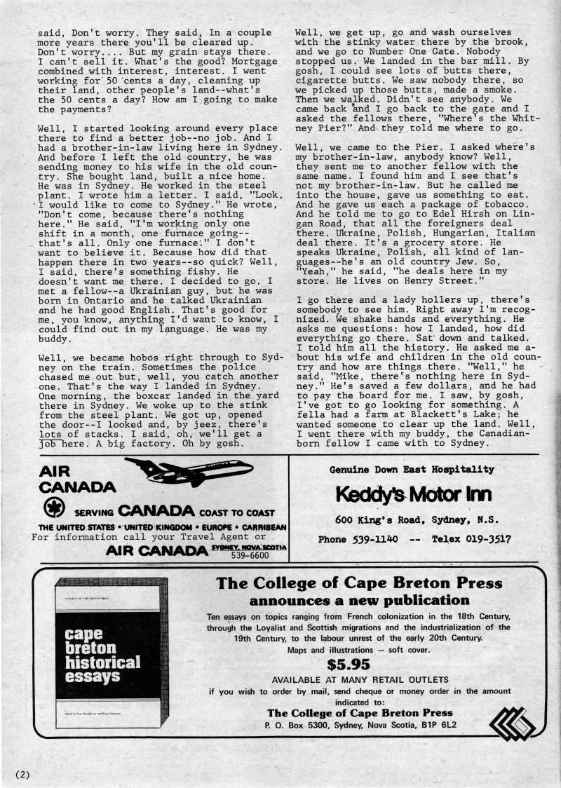 said, Don't worry. They said, In a couple more years there you'll be cleared up. Don't worry.... But my grain stays there. I can't sell it. What's the good? Mortgage combined with interest, interest. I went working for 50 cents a day, cleaning up their land, other people's land--what's the 50 cents a day? How am I going to make the payments? Well, I started looking around every place there to find a better job--no job. And I had a brother-in-law living here in Sydney, And before I left the old country, he was sending money to his wife in the old coun? try. She bought land, built a nice home. He was in Sydney. He worked in the steel plant. I wrote him a letter. I said, "Look, 'I would like to come to Sydney." He wrote, "Don't come, because there's nothing here." He said, "I'm working only one shift in a month, one furnace going-- that's all. Only one furnace"." I don't want to believe it. Because how did that happen there in two years--so quick? Well, I said, there's something fishy. He doesn't want me there. I decided to go, I met a fellow--a Ukrainian guy, but he was born in Ontario and he talked Ukrainian and he had good English. That's good for me, you know, anything I'd want to know, I could find out in my language, He was my buddy, Well, we became hobos right through to Syd? ney on the train. Sometimes the police chased me out but, well, you catch another one. That's the way I landed in Sydney, One morning, the boxcar landed in the yard there in Sydney. We woke up to the stink from the steel plant. We got up, opened the door--I looked and, by jeez, there's lots of stacks. I said, oh, we'll get a job here, A big factory. Oh by gosh. VJell, we get up, go and wash ourselves with the stinky water there by the brook, and we go to Number One Gate, Nobody stopped us. We landed in the bar mill. By gosh, I could see lots of butts there, cigarette butts. We saw nobody there, so we picked up those butts, made a smoke. Then we walked. Didn't see anybody. We came back *and I go back to the gate and I asked the fellows there, "Where's the Whit? ney Pier?" And they told me where to go. Well, we came to the Pier. I asked where's my brother-in-law, anybody know? Well, they sent me to another fellow with the same name, I found him and I see that's not my brother-in-law. But he called me into the house, gave us something to eat. And he gave us each a package of tobacco. And he told me to go to Edel Hirsh on Lin? gan Road, that all the foreigners deal there. Ukraine, Polish, Hungarian, Italian deal there. It's a grocery store. He speaks Ukraine, Polish, all kind of lan? guages --he's an old country Jew. So, "Yeah," he said, "he deals here in my store. He lives on Henry Street." I go there and a lady hollers up, there's somebody to see him. Right away I'm recog? nized. We shake hands and everything. He asks me questions: how I landed, how did everything go there. Sat down and talked. I told him all the history. He asked me a- bout his wife and children in the old coun? try and how are things there. "Well," he said, "Mike, there's nothing here in Syd? ney." He's saved a few dollars, and he had to pay the board for me. I saw, by gosh, I've got to go looking for something. A fella had a farm at Blackett's Lake; he wanted someone to clear up the land. Well, I went there with my buddy, the Canadian- born fellow I came with to Sydney. AIR CANADA 3y SERVING CANADA COAST TO COAST THE UMITEO STATES • UNITED KINGOOM • EUAOPE • CABmSEAN For information call your Travel Agent or AIR CANADA ??f|f?''?* Genuine Down East Hospitality Keddy' Motor Inn 600 King's Road, Sydney, N.S. Phone 539-1140 • Telex 019-351? cape breton historical essays I The College of Cape Breton Press announces a new public:ation Ten essays on topics ranging from French colonization in the 18th Century, through the Loyalist and Scottish migrations and the industrialization of the 19th Century, to the labour unrest of the early 20th Century. Maps and illustrations • soft cover. $5.95 AVAILABLE AT MANY RETAIL OUTLETS if you wish to order by mail, send cheque or money order in the amount indicated to: The College of Cape Breton Press P. O. Box 5300, Sydney, Nova Scotia, BIP 6L2 (2)