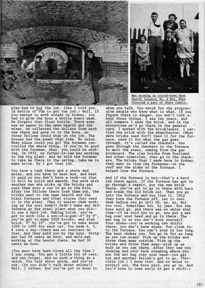 pies had to buy the job, like I told you. (A bottle of rum to get the job.) Well, if you wanted to work steady in Sydney, you had to give the boss a bottle every week. He forgets that first bottle. There even was an agent in the open hearth and the mixer, he collected two dollars from each one there and gave it to the boss, so those fellows could stay on the job. The bosses had the power that time. No union. What place could you go? The foremen con? trolled the whole thing. If you're in good with the foreman, okay, you could be work? ing. In 1933, my-father-in-law was working in the big plant. And he told the foreman to take me there in the spring, take me to make brick. So I got that job. You have a tank there and a chute and molds, and you have to beat mud, and beat it good so you don't have a rock--so that it will be solid and smooth. You work with another man who picks up the bricks and puts them onto a car to go to the kiln. After the fellows there took them out, the bricks went to the open hearth and the blast furnaces and other places they used it in the plant. (Was it easier than work? ing on the coal bank?) Didn't make any dif? ference at the steel plant what you did-- it was a hard job. Making brick, you've got to work like a son-of-a-gun--4" by 9", you've got to make 2000 bricks, and slab brick, 9" by 10", you've got to make about 1200 to 1400 for each car. You made 4, 5, 6 cars a day--there was no contract on that. And they paid you by the hour. Strip? per had 28 cents an hour, and mold man working at the beater there, he had 30 cents an hour. (You must have been tired all the time.) I was young. You get a little bit of rest, and you forget. And no such a thing as a union. You talk about union, and you're out. (So you didn't talk about unions?) Well, I talked. But you've got to know to Men working In cooled-down Open Hearth furnace; Mr. & Mrs. Mike Oleschuk & part of their family. whom you talk. You watch for the progres? sive people who know what is what. If you figure there is danger, you don't talk a- bout those things. I was two years, and all summers I made the brick. And in the wintertime we'd go there in the general yard. I worked with the bricklayers. I car? ried the brick with the wheelbarrow. (What were bricks used for?) Used it for the fur? nace, used it for what the gas goes through, it's called the checkers. Gas goes through the checkers to the furnace to melt the steel, coming from the gas producers. The clay bricks from Scotland and other countries, they go in the check? ers. The bricks that I made here in Sydney, they went to line the furnaces--in the roof and the sides of the furnace. I helped line the furnace. And if the furnace is hot--that's a hard job there again. If the furnace has got to go through a repair, put the new brick there, you've got to go in there with bars and break the old brick out. Then you go into the furnace and you line it. (Did they tum the furnace off, let it cool down before you go in?) Oh, no, no. Not too cool. Sometimes hot, by jeez. But the boss said go, and there was no union that time--if he told you to go, you put a wet bag over your head and go in there. The wet bag is so you don't burn yourself. Your shoes--you're working two shifts there, you don't have shoes. You climb in? to the furnace. You can't stay in too long. The heat chokes you. You go in for as long as you can stand. Pick up the bricks and throw them away outside. Pick up the bricks and throw them away--pick up as much as you can there. After they see you choking and your back steaming where you put the wet bag over your head--you get out and another fellow's got to go. (Ter? rible job.) I know that. And no union to protect you. The boss said, you go in. And you'd have to come early to get a shift-- (5)