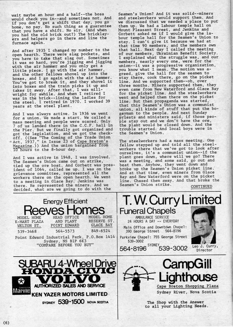 wait maybe an hour and a half--the boss would check you in--and sometimes not. And if you don't get a shift that day, you go home, no pay. No such thing as a guarantee that you have a shift. No sir. (And when you had the old brick out?) The bricklay? ers and helpers go in there and line the furnace again. And after 1935 I changed my number to the open hearth. There were slag pockets, and you have to take that slag out. Sometimes it was so hard, you're jigging and jigging with the air hammer and you only get a little piece. I go with the air hammer, and the other fellows shovel up into the boxes, and I go again with the air hammer. You've got to break it, and they shovel it into boxes and the train picks it up and takes it away. After that, I was mill? wright for awhile. And when I retired I was in the brick--lining the.ladles for the steel. I retired in 1970. I worked 39 years at the steel plant. And I was always active. In 1936 we went for a union. We made a start. We called a mass meeting and people were scared. Only 7 of us landed there in the C.C.F. hall in the Pier. But we finally got organized and got the legislation, and we got the check? off. ((See "The Coming of the Trade Union 'Act, 1937," in Issue 23 of Cape Breton's Magazine.)) And the union bargained from 10 hours to the 8-hour day. And I was active in 1948, I was involved. The Seamen's Union came out on strike, tied up the ore boat. And Corbett was pres? ident of 1064, called me up. I was on the grievance committee, represented all the workers there on the open hearth. We went to a meeting in Glace Bay.' Jenkins was there. He represented the miners. And we decided, what are we going to do with the Seamen's Union? And it was solid--miners and steelworkers would support them. And we discussed that we needed a place to put them up. We had a labour temple hall on Mount Pleasant Street, and Jenkins and Corbett asked me if I would give the la? bour temple hall for the Seamen's Union to stay. I can't give it because we had at that time 90 members, and the members own that hall. Next day I called the meeting of our members, Ukrainian Benefit Society. I explained what the struggle was, and our members, nearly every one, were for the union--it was a progressive organization, you know what I mean. The motion was a- greed, give the hall for the seamen to stay there, cook there, go on the picket line. And we supported them--oh, over three months. Miners supported them, they even came from New Waterford and Glace Bay for the picket line. And the steelworkers went and helped them there on the picket line. But then propaganda was started, that this Seamen's Union was a communist union, all kinds of stuff that put the bo? geyman to the people. And next Sunday priests and ministers said, if those peo? ple stay out and we don't have the ore, the plant would be closed down. And the trouble started. And local boys were in the Seamen's Union. The steelworkers had a mass meeting. One fellow stepped up and told all the steel? workers there that we've got to look after ourselves, it's a communist union--if the plant goes down, where will we go? There was a meeting, and some said, go out and beat them. Anyhow, they went down and broke up the Seamen's Union picket line. And at that time, even miners from Glace Bay and New Waterford were on the picket line. Chased them away. And that broke the Seamen's Union strike. CONTINUED Energy Efficient Reeves Homes MODEL HOME K-MART PLAZA WELTON ST. HEAD OFFICE AND PLANT POINT EDWARD MODEL HOME RESERVE ST. GLACE BAY 539-3468 564-5573 " 849-6524 Point Edward Industrial Park, P.O.Box 1414 Sydney, NS BIP 6K3 "COMPARE BEFORE YOU BUY" T W Curry Limited Funeral Chapels AMBULANCE SERVICE 24 HOURS A DAY • EVERYDAY Main Office and Downtown Chapel: 390 George Street 564-8196 Parkview Chapel: 755 George Street 539-3002 564-8196 ''?'"'539-3002 ''Sirector'' SUBARU 4-Wheel Drive HON-DA. CIVIC AUTHORIZED SALES AND SERVICE KEN YAZER MOTORS LIMITED SYDNEY 539*1500 NOVA SCOTIA Z' .-'.._ CampGill rU Lighthouse Cape Breton Shopping Plaza Sydney River, Nova Scotia The Shop with the Answer to all your Lighting Needs.