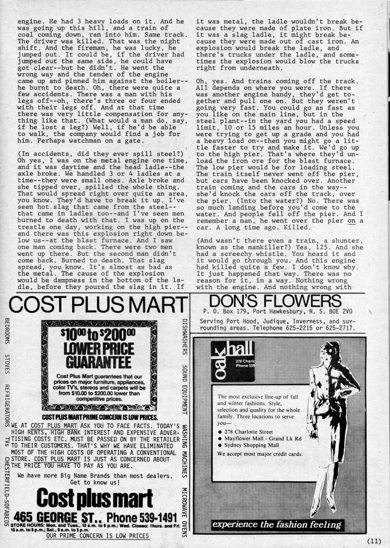 engine. He had 3 heavy loads on it. And he was going up this hill, and a train of coal coming down, ran into him. Same track. The driver was killed. That was the night shift. And the fireman, he was lucky, he jumped out. It could be, if the driver had jumped out the same side, he could have got clear--but he didn't. He went the wrong way and the tender of the engine came up and pinned him against the boiler-- he burnt to death. Oh, there were quite a few accidents. There was a man with his legs off--oh, there's three or four ended with their legs off. And at that time there was very little compensation for any? thing like that. (What would a man do, say, if he lost a leg?) Well, if he'd be able to walk, the company would find a job for him. Perhaps watchman on a gate. (In accidents, did they ever spill steel?) Oh yes, I was on the metal engine one time, and it was daytime and the head ladle--the axle broke. We handled 3 or 4 ladles at a time--they were small ones. Axle broke and she tipped over, spilled the whole thing. That would spread right over quite an area, you know. They'd have to break it up, I've seen hot slag that came from the steel-- that came in ladles too--and I've seen men burned to death with that, I was up on the trestle one day, working on the high pier-- and there was this explosion right down be? low us--at the blast furnace. And I saw one man coming back. There were two men went up there. But the second man didn't come back. Burned to death. That slag spread, you know. It's almost as bad as the metal. The cause of the explosion would be dampness in the bottom of the la? dle, before they poured the slag in it. If it was metal, the ladle wouldn't break be? cause they were made of plate iron. But if it was a slag ladle, it might break be? cause they were made out of cast iron. An explosion would break the ladle, and there's trucks under the ladle, and some? times the explosion would blow the trucks right from underneath. Oh, yes. And trains coming off the track. All depends on where you were. If there was another engine handy, they'd get to? gether and pull one on. But they weren't going very fast. You could go as fast as you like on the main line, but in the steel plant--in the yard you had a speed limit, 10 or 15 miles an hour. Unless you were trying to get up a grade and you had a heavy load on--then you might go a lit? tle faster to try and make it. We'd go up to the high pier. That's where they'd un? load the iron ore for the blast furnace. The low pier would be for loading steel. The train itself never went off the pier, but cars have been knocked over. Another train coming and the cars in the way-- she'd knock the cars off the track, over the pier. (Into the water?) No. There was so much landing before you'd come to the water. And people fell off the pier. And I remember a man, he went over the pier on a car, A long time ago. Killed, (And wasn't there even a train, a shunter, known as the mankiller?) Yes, 125, And she had a screechy whistle. You heard it and it would go through you. And this engine had killed quite a few. I don't know why. It just happened that way. There was no reason for it, in a way. Nothing wrong with the engine. And nothing wrong with COST PLUS MART $10?to$200? LOWER PRICE GUARANTEE Cost Plus Mart guarantees that our prices on major furniture, appliances, color TV's, stereos and carpets will be from $10.00 to $200.00 lower than competitive prices. ' COSTPIUSMARTPRIMECONCERN IS IDW PRICES. 'WE AT COST plus" MART ASK YOU TO FACE FACTS. TODAY'S : HIGH RENTS, HIGH BANK INTEREST AND EXPENSIVE ADVER- < HTISIN6 COSTS ETC. MUST BE PASSED ON BY THE RETAILERS ?/> TO THEIR CUSTOMERS. THAT'S WHY WE HAVE ELIMINATED i MOST OF THE HIGH COSTS OF OPERATING A CONVENTIONAL : oSTORE. COST PLUS MART IS JUST AS CONCERNED ABOUT I mTHE PRICE YOU HAVE TO PAY AS YOU ARE. [ rn We have more Big Name Brands than most dealers. < ;i! Get to know us! 1 Costphisiiiail I 1465 GEORGE ST.. Phone 539-1491; (y' STORE HOURS: Man. and Tues., 10 a.m, to 6 p.m.; Wed, Closea: Thurs. and Fri. • 10 a.m, to 9 p,m.; Sat,. 9 a.m. to 5p.m. [ OUR PRIME CONCERN IS LOW PRICES < DON'S FLOWERS p. 0. Box 179, Port Hawkesbury, N. S. BOE 2V0 Serving Port Hood, Judique, Inverness, and sur? rounding areas. Telephone 625-2215 or 625-2717. The most exclusive line-up of fall and winter fashions. Style, selection and quality for the whole family. Three locations to serve you • • 278 Charlotte Street • Mayflower Mall - Grand Lk Rd • Sydney Shopping Mall We accept most major credit cards. experience the fashion feeling (11)