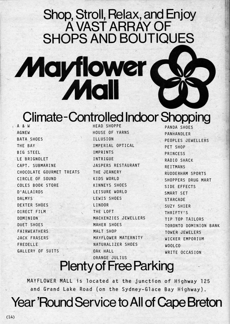 Shop, Stroll, Relax, and Enjoy A VAST ARRAY OF SHOPS AND BOUTIQUES Alayflower vMall Climate-Controlled Indoor Shopping A & W AGNEW BATA SHOES THE BAY BIG STEEL LE BRI6N0LET CAPT. SUBMARINE CHOCOLATE GOURMET TREATS CIRCLE OF SOUND COLES BOOK STORE D'ALLAIRDS DALMYS DEXTER SHOES DIRECT FILM DOMINION DUET SHOES FAIRWEATHERS JACK FRASERS FREDELLE GALLERY OF SUITS HEAD SHOPPE HOUSE OF YARNS ILLUSION IMPERIAL OPTICAL IMPRINTS INTRIGUE JASPERS RESTAURANT THE JEANERY KIDS WORLD KINNEYS SHOES LEISURE WORLD LEWIS SHOES LINDOR THE LOFT MACKENZIES JEWELLERS MAHER SHOES MALT SHOP MAYFLOWER MATERNITY NATURALIZER SHOES OAK HALL ORANGE JULIUS PANDA SHOES PANHANDLER PEOPLES JEWELLERS PET SHOP PRINCESS RADIO SHACK REITMANS RUDDERHAM SPORTS SHOPPERS DRUG MART SIDE EFFECTS SMART SET STARCADE SUZY SHIER - THRIFTY'S TIP TOP TAILORS TORONTO DOMINION BAN TOWER JEWELERS WICKER EMPORIUM WOOLCO WRITE OCCASION Plenty of Free Parking MAYFLOWER MALL is located at the junction of Highway 125 and Grand Lake Road (on the Sydney-Glace Bay Highway). Year 'Round Service to All of Cape Breton (14)