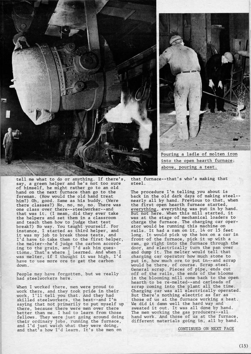 Published by Ronald Caplan on 1980/12/1 (346 reads)tell me what to do or anything. If there's say, a green helper and he's not too sure of himself, he might rather go to an old hand on the next furnace than go to the foreman. (How would the old hand treat him?) Oh, good. Same as his buddy. (Were there classes?) No, no, no, no. There was one class over there--steelworker--and that was it. (I mean, did they ever take the helpers and set them in a classroom and teach them how to judge that test break?) No way. You taught yourself. For instance, I started as third helper, and it was my job to break those tests, and I'd have to take them to the first helper, the melter--he'd judge the carbon accord? ing to the grain, and I'd ask him ques? tions. That's where I_ learned. And when I was melter, if I thought it was high, I'd have to use more ore to get the carbon down. People may have forgotten, had steelworkers here. but we really When I worked there, men were proud to work there, and they took pride in their v7ork, I'll tell you that. And they had skilled steelworkers, the best--and I'm saying that not primarily to put myself up there, because there were men over there better than me. I had to learn from those fellows. They were just going around doing their ordinary jobs, running the furnace, and I'd just watch what they were doing, and that's how I'd learn. It's the men on Pouring a ladle of molten iron into the open hearth furnace; above, pouring a test. that furnace--that's who's making that steel. The procedure I'm telling you about is back in the old dark days of making steel-- nearly all by hand. Previous to that, when the first open hearth furnace started, everything, everything was put in by hand. But not here. When this mill started, it was at the stage of mechanical loaders to charge the furnace. The charging car oper? ator would be running this machine on rails. It had a ram on it, 14 or 15 feet long. It would pick up the box on a car in front of the furnace, pick it up with a ram, go right into the furnace through the door, and electrically turn the pan over and dump it. The melter would tell that charging car operator how much stone to put in, how much ore to put in--and scrap would be there, of course. Scrap steel. General scrap. Pieces of pipe, ends cut off of the rails, the ends of the blooms in the blooming mill come back to the open hearth to be re-melted--and carloads of scrap coming into the plant all the time. Charging car was all electrically operated. But there's nothing electric as far as those of us at the furnace working a heat. We did it damn well the hard way and sweated it out. It was all done by hand. The men working the gas producers--all hand work. And those of us at the furnace, different materials going in, all by hand. CONTINUED ON NEXT PAGE (15)