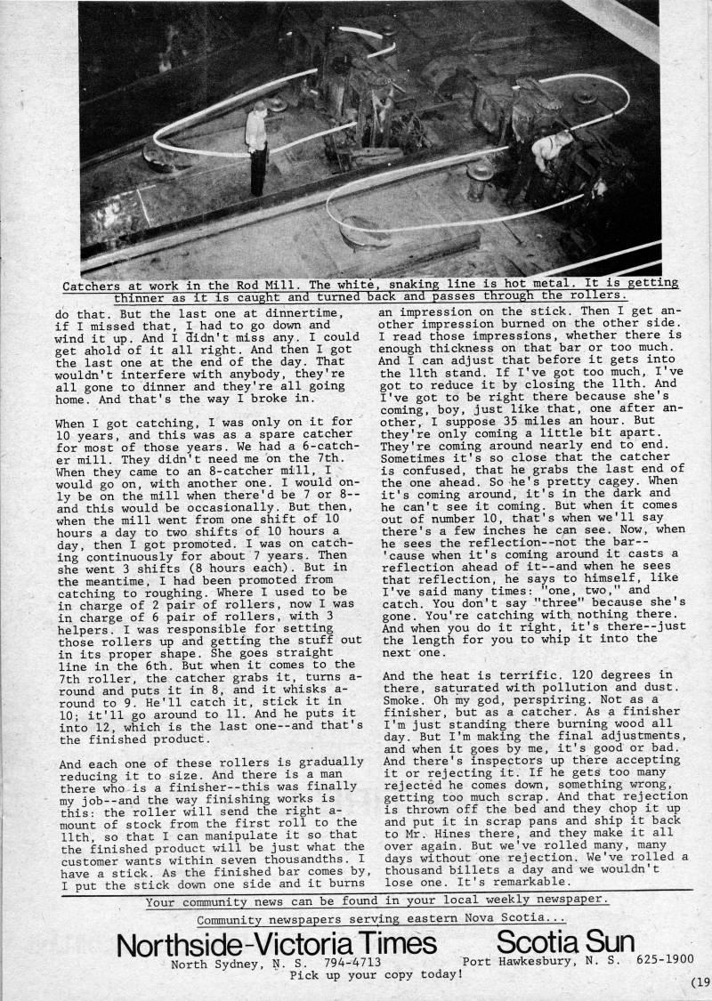 Published by Ronald Caplan on 1980/12/1 (310 reads)''' ,.'' Catchers at work in the Rod Mill. The white, snaking line is hot metal. It is getting thinner as it is caught and turned back and passes through the rollers. do that. But the last one at dinnertime, if I missed that, I had to go down and wind it up. And I Hidn't miss any. I could get ahold of it all right. And then I got the last one at the end of the day. That wouldn't interfere with anybody, they're all gone to dinner and they're all going home. And that's the way I broke in. When I got catching, I was only on it for 10 years, and this was as a spare catcher for most of those years. We had a 6-catch- er mill. They didn't need me on the 7th. "Jhen they came to an 8-catcher mill, I would go on, with another one. I would on? ly be on the mill when there'd be 7 or 8-- and this would be occasionally. But then, when the mill went from one shift of 10 hours a day to two shifts of 10 hours a day, then I got promoted, I was on catch? ing continuously for about 7 years. Then she went 3 shifts (8 hours each), But in the meantime, I had been promoted from catching to roughing. Where I used to be in charge of 2 pair of rollers, now I was in charge of 6 pair of rollers, with 3 helpers, I was responsible for setting those rollers up and getting the stuff out in its proper shape. She goes straight line in the 6th. But when it comes to the 7th roller, the catcher grabs it, turns a- round and puts it in 8, and it whisks a- round to 9. He'll catch it, stick it in 10; it'll go around to 11. And he puts it into 12, which is the last one--and that's the finished product. And each one of these rollers is gradually reducing it to size. And there is a man there who is a finisher--this was finally my job--and the way finishing works is this: the roller will send the right a- mount of stock from the first roll to the 11th, so that I can manipulate it so that the finished product will be just what the customer wants within seven thousandths. I have a stick. As the finished bar comes by, I put the stick down one side and it burns an impression on the stick. Then I get an? other impression burned on the other side. I read those impressions, whether there is enough thickness on that bar or too much. And I can adjust that before it gets into the 11th stand. If I've got too much, I've got to reduce it by closing the 11th. And I've got to be right there because she's coming, boy, just like that, one after an? other, I suppose 35 miles an hour. But they're only coming a little bit apart. They're coming around nearly end to end. Sometimes it's so close that the catcher is confused, that he grabs the last end of the one ahead. So he's pretty cagey. When it's coming around, it's in the dark and he can't see it coming. But when it comes out of number 10, that's when we'll say there's a few inches he can see. Now, when he sees the reflection--not the bar-- 'cause when it's coming around it casts a reflection ahead of it--and when he sees that reflection, he says to himself, like I've said many times: "one, two," and catch. You don't say "three" because she's gone. You're catching with nothing there. And when you do it right, it's there--just the length for you to whip it into the next one. And the heat is terrific. 120 degrees in there, saturated with pollution and dust. Smoke. Oh my god, perspiring. Not as a finisher, but as a catcher. As a finisher I'm just standing there burning wood all day. But I'm making the final adjustments, and when it goes by me, it's good or bad. And there's inspectors up there accepting it or rejecting it. If he gets too many rejected he comes down, something wrong, getting too much scrap. And that rejection is thrown off the bed and they chop it up and put it in scrap pans and ship it back to Mr, Hines there, and they make it all over again. But we've rolled many, many days without one rejection. We've rolled a thousand billets a day and we wouldn't lose one. It's remarkable. Your community news can be found in your local weekly newspaper. Community newspapers serving eastern Nova Scotia... Northside-Victoria Times Scotia Sun North Sydney, N. S. 794-4713 Port Hawkesbury, N. S. 625-1900 Pick up your copy today! (19