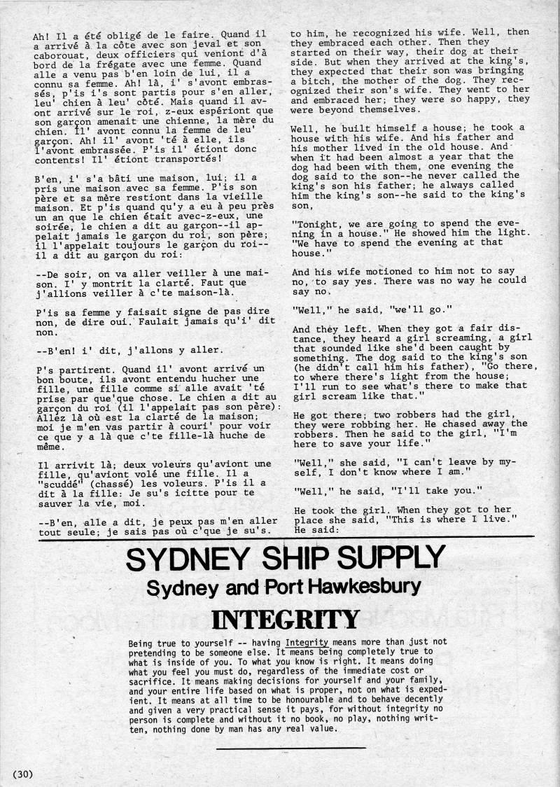 Published by Ronald Caplan on 1980/12/1 (306 reads)Ah! II a ete oblige de le faire. Quand il a arrive a la cote avec son jeval et son caborouat, deux officiers qui veniont d'a bord de la fregate avec une femme. Quand alle a venu pas b'en loin de lui, il a connu sa femme. Ah! la, i' s'avont embras- ses, p'is i's sont partis pour s'en aller, leu' chien a leu' cote. Mais quand il av? ont arrive sur le roi, z-eux esperiont que son garcon amenait une chienne, la mere du chien. II' avont connu la femme de leu' garcon. Ah! il' avont 'te a elle, ils 1'avont embrassee. P'is il' etiont done contents! II' etiont transportes! B'en, i' s'a bati une maison, lui; il a pris une maison avec sa femme. P'is son pere et sa mere restiont dans la vieille maison. Et p'is quand qu'y a eu a peu pres un an que le chien etait avec-z-eux, une soiree, le chien a dit au garcon--il ap- pelait jamais le garcon du roi, son pere; il I'appelait toujours le garcon du roi-- il a dit au garcon du roi: --De soir, on va aller veiller a une mai? son. I' y montrit la clarte. Faut que j'alliens veiller a c'te maison-la. P'is sa femme y faisait signe de pas dire non, de dire oui. Faulait jamais qu'i' dit non. --B'en! i' dit, j'allons y aller. P's partirent. Quand il' avont arrive un bon boute, ils avont entendu hucher une fille, une fille comme si alle avait 'te prise par que'que chose. Le chien a dit au garcon du roi (il I'appelait pas son pere): Allez la ou est la clarte de la maison; moi je m'en vas partir a couri' pour voir ce que y a la que c'te fille-la huche de meme. II arrivit la; deux voleurs qu'aviont une fille,'qu'aviont vole une fille. II a "scudde" (chasse) les voleurs. P'is il a dit a la fille: Je su's icitte pour te sauver la vie, moi. --B'en, alle a dit, je peux pas m'en aller tout seule; je sais pas ou c'que je su's. to him, he recognized his wife. Well, then they embraced each other. Then they started on their way, their dog at their side. But when they arrived at the king's, they expected that their son was bringing a bitch, the mother of the dog. They rec? ognized their son's wife. They went to her and embraced her; they were so happy, they were beyond themselves. Well, he built himself a house; he took a house with his wife. And his father and his mother lived in the old house. And when it had been almost a year that the dog had been with them, one evening the dog said to the son--he never called the king's son his father; he always called him the king's son--he said to the king's "Tonight, we are going to spend the eve? ning in a house." He showed him the light. "We have to spend the evening at that house." And his wife motioned to him not to say no, to say yes. There was no way he could say no. "Well," he said, "we'll go." And they left. When they got a fair dis? tance, they heard a girl screaming, a girl that sounded like she'd been caught by something. The dog said to the king's son (he didn't call him his father), "Go there, to where there's light from the house; I'll run to see what's there to make that girl scream like that." He got there; two robbers had the girl, they were robbing her. He chased away the robbers. Then he said to the girl, "I'm here to save your life." "Well," she said, "I can't leave by my? self, I don't know where I am." "Well," he said, "I'll take you." He took the girl. When they got to her place she said, "This is where I live." He said: SYDNEY SHIP SUPF??LY Sydney and Port Hawkesbury INTEGRITY Being true to yourself -- having Integrity means more than just not pretending to be someone else. It means being completely true to what is inside of you. To what you know is right. It means doing what you feel you must do, regardless of the immediate cost or sacrifice. It means making decisions for yourself and your family, and your entire life based on what is proper, not on what is exped? ient. It means at all time to be honourable and to behave decently and given a wery practical sense it pays, for without integrity no person is complete and without it no book, no play, nothing writ? ten, nothing done by man has any real value. (30)