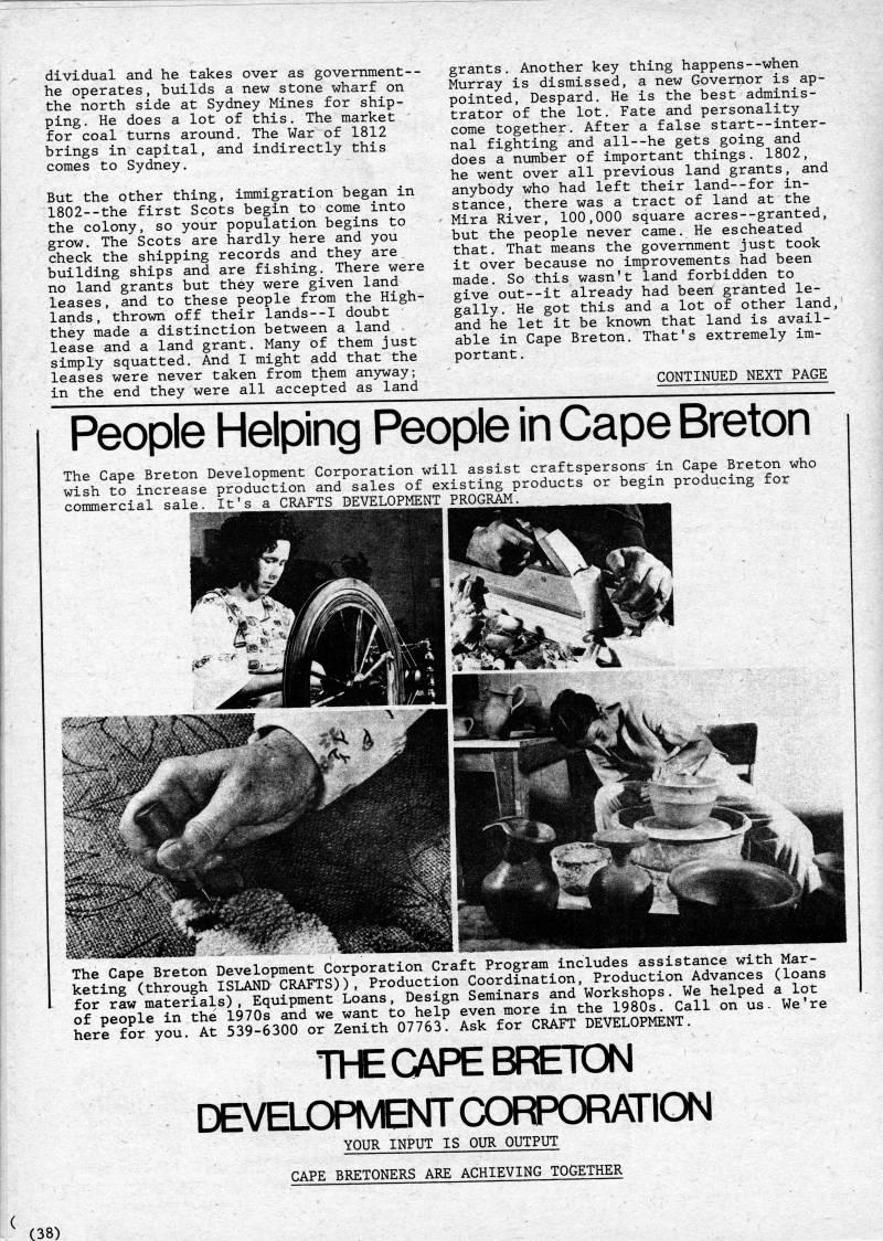 Published by Ronald Caplan on 1980/12/1 (334 reads)dividual and he takes over as government-- he operates, builds a new stone wharf on the north side at Sydney Mines for ship? ping. He does a lot of this. The market for coal turns around. The War of 1812 brings in capital, and indirectly this comes to Sydney. But the other thing, immigration began in 1802--the first Scots begin to come into the colony, so your population begins to grow. The Scots are hardly here and you check the shipping records and they are building ships and are fishing. There were no land grants but they were given land leases, and to these people from the High? lands, thrown off their lands--I doubt they made a distinction between a land lease and a land grant. Many of them just simply squatted. And I might add that the leases were never taken from them anyway; in the end they were all accepted as land grants. Another key thing happens--when Murray is dismissed, a new Governor is ap? pointed, Despard. He is the best adminis? trator of the lot. Fate and personality come together. After a false start--inter- nal fighting and all--he gets going and does a number of important things. 1802, he went over all previous land grants, and anybody who had left their land--for in? stance, there was a tract of land at the Mira River, 100,000 square acres--granted, but the people never came. He escheated that. That means the government just took it over because no improvements had been made. So this wasn't land forbidden to give out--it already had been granted le? gally. He got this and a lot of other land, and he let it be known that land is avail? able in Cape Breton. That's extremely im? portant . CONTINUED NEXT PAGE People Helping People in Cape Breton The Cape Breton Development Corporation will assist craftspersons' in Cape Breton who wish to increase production and sales of existing products or begin producing for commercial sale. It's a CRAFTS DEVELOPMENT PROGRAM. The Cape Breton Development Corporation Craft Program includes assistance with Mar? keting (through ISLAND CRAFTS)), Production Coordination, Production Advances (loans for raw materials), Equipment Loans, Design Seminars and Workshops. We helped a lot of people in the 1970s and we want to help even more in the 1980s. Call on us. We're here for you. At 539-6300 or Zenith 07763. Ask for CRAFT DEVELOPMENT. THE CAPE BRETON DEVELOPMENT COFPORATION YOUR INPUT IS OUR OUTPUT CAPE BRETONERS ARE ACHIEVING TOGETHER (38)