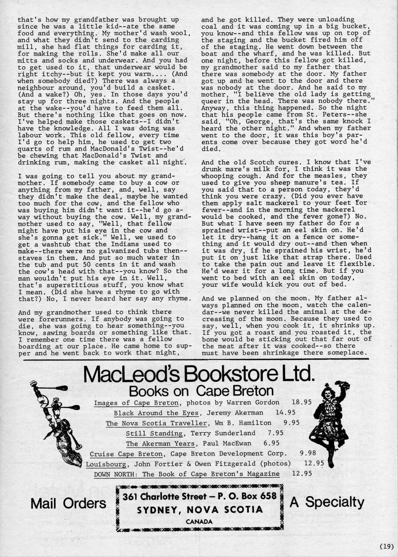 that's how my grandfather was brought up since he was a little kid--ate the same food and everything. My mother'd wash wool, and what they didn't send to the carding mill, she had flat things for carding it, for making the rolls. She'd make all our mitts and socks and underwear. And you had to get used to it, that underwear would be right itchy--but it kept you warm.... (And when somebody died?) There was always a neighbour around, you'd build a casket. (And a wake?) Oh, yes. In those days you'd stay up for three nights. And the people at the wake--you'd have to feed them all. But there's nothing like that goes on now. I've helped make those caskets--I didn't have the knowledge. All I was doing was labour work. This old fellow, every time I'd go to help him, he used to get two quarts of rum and MacDonald's Twist--he'd be chewing that MacDonald's Twist and drinking rum, making the casket all night. I was going to tell you about my grand? mother. If somebody came to buy a cow or anything from my father, and, well, say they didn't make the deal, maybe he wanted too much for the cow, and the fellow who was buying him didn't want it--he'd go a- way without buying the cow. Well, my grand? mother used to say, "Well, that fellow might have put his eye in the cow and she's gonna get sick." Well, we used to get a washtub that the Indians used to make--there were no galvanized tubs then-- staves in them. And put so much water in the tub and put 50 cents in it and wash the cow's head with that--you know? So the man wouldn't put his eye in it. Well, that's superstitious stuff, you know what I mean. (Did she have a rhyme to go with that?) No, I never heard her say any rhyme. And my grandmother used to think there were forerunners. If anybody was going to die, she was going to hear something--you know, sawing boards or something like that. I remember one time there was a fellow boarding at our place. He came home to sup? per and he went back to work that night, and he got killed. They were unloading coal and it was coming up in a big bucket, you know--and this fellow was up on top of the staging and the bucket fired him off of the staging. He went down between the boat and the wharf, and he was killed. But one night, before this fellow got killed, my grandmother said to my father that there was somebody at the door. My father got up and he went to the door and there was nobody at the door. And he said to my mother, "I believe the old lady is getting queer in the head. There was nobody there." AnjHA'ay, this thing happened. So the night that his people came from St. Peters--she said, "Oh, George, that's the same knock I heard the other night." And when my father went to the door, it was this boy's par? ents come over because they got word he'd died. And the old Scotch cures. I know that I've drunk mare's milk for, I think it was the whooping cough. And for the measles, they used to give you sheep manure's tea. If you said that to a person today, they'd think you were crazy. (Did you ever have them apply salt mackerel to your feet for fever--and in the morning the mackerel would be cooked, and the fever gone?) No. But what I have seen my father do for a sprained wrist--put an eel skin on. He'd let it dry--hang it on a fence or some? thing and it would dry out--and then when it was dry, if he sprained his wrist, he'd put it on just like that strap there. Used to take the pain out and leave it flexible. He'd wear it for a long time. But if you went to bed with an eel skin on today, your wife would kick you out of bed. And we planned on the moon. My father al? ways planned on the moon, watch the calen? dar- -we never killed the animal at the de? creasing of the moon. Because they used to say, well, when you cook it, it shrinks up. If you got a roast and you roasted it, the bone would be sticking out that far out of the meat after it was cooked--so there must have been shrinkage there someplace. MacLeod's Bookstore Ltd. Books on Caoe Breton Images of Cape Breton, photos by Warren Gordon 18.95 Black Around the Eyes, Jeremy Akerman 14.95 The Nova Scotia Traveller, Wm B. Hamilton 9.95 Still Standing, Terry Sunderland 7.95 The Akerman Years, Paul MacEwan 6.95 Cruise Cape Breton, Cape Breton Development Corp. 9.98 Louisbourg, John Fortier & Owen Fitzgerald (photos) 12 DOWN NORTH: The Book of Cape Breton's Magazine 12.95 KM''i r '' ' I 361 Charlotte street - p. O. Box 658 i * o'''i/'i* , Mail Orders | '''''' '''' 5'',,' A Specialty I CANADA I