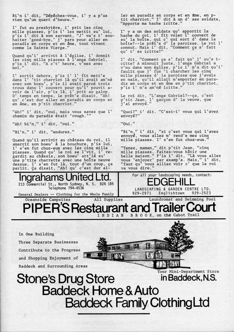 Published by Ronald Caplan on 1981/8/1 (252 reads)Bi'n i' dit, "Depechez-vous, i' y a p'us rien qu'un quart d'heure." I' fut au presbytere, i' prit les cinq mille piasses, p'is i' les mettit su' lui, p'is i' dit k son sarvant, "J' va's t' sou- haiter 'good-bye,' j' pars pour aller en paradis en corps et en ame, tout vivant comme la Sainte Vierge." Quand qu'i' arrivit a 1'eglise, i' donnit les cinq mille piasses a l'ange Gabriel, p'is i' dit, "A c't' heure, v'nez avec moi." I' sortit dehors, p'is i' 1' fit mett'e dans 1' 'tit charriot la qu'il avait am'ne avec son boeu', p'is il avait parce trois trous dans 1' couvert pour qu'i' pouvit a- voir de I'air, p'is la, i' prit au galop. D' temps en temps, le pret'e disait, "Ah! qu' c'est dur aller en paradis en corps et en ame, en p'tit charriot." "Ah!" i' dit, "oui, mais vous savez que 1' chemin du paradis etait 'rough.'" "Ah! bi'n," i' dit, "oui." "Bi'n," i' dit, "endurez." Quand qu'il arrivit au chateau du roi, il amarrit son .boeu' a la bouchure, p'is lui, i' s'en fut chuz-eux avec les cinq mille piasses. Quand qu' le roi se I'vit, i' re? gardit au chassis, son boeu' att'le su' une p'tite charrette avec une boite neuve dessus. I' s'en fut la, tout d'un coup, ca parlit. Ca disait, "Ah! qu' c'est dur al? ler en paradis en corps et en Sme, en p- tit charriot." I' dit a un d' ses soldats, "Apporte ma hache icitte." I' y a un des soldats qu' apportit la hache du roi, i' fit voler 1' couvert de su_' la boite, qui c' qui sort d' dans la boite?--le pret'e d' la paroisse. Le roi 1' connut. Mais i' dit, "Comment ca s' fait qu' t' es icitte?" I' dit, "Comment ca s' fait qu' j' su's i- citte? A minnuit juste, l'ange Gabriel a v'nu dans mon eglise, p'is i' m'a dit qu'i' faulit que j' fus 'i charcher les cinq mille piasses d' la paroisse que j'avals en main, qu'il allait m'emporter en para? dis en corps et en ame en p'tit charriot, p'is i' m'a am'ne icitte." Le roi dit, "L'ange Gabriel?--ca, c'est p'tit Jean, 1' garcon d' la veuve, que j'ai envoye." "Quoi?" envoye? "Oui." dit. "C'est-i' vous qui I'avez "Bi'n," i' dit, "si c'est vous qui I'avez envoye, vous allez m' rend'e mes cinq mille piasses. I' s'en fut chuz-eux." "Tenez, maman," dit p'tit Jean, "cinq mille piasses. Faites-vous batir une belle maison." P'is i' dit, "La vous allez vous 'enjoyer' par examp'e. Mais," i' dit, "faut qu' vous alliez voir c' que le roi va vous dire." Ingrahams United Ltd. 213 Commercial St., North Sydney, N. S. B2A 1B5 Telephone 794-4536 General Dealers • Clothing for the Whole Family For all your landscaping needs, contact: EDGEHILL LANDSCAPING & GARDEN CENTRE LTD. 929-2971 Englishtown 929-2523 Oceanside Campsites All Supplies Laundromat and Swimming Pool PI PER'S Restaurant and Trailer Court INDIAN BROOK, on the Cabot Trail In One Building Three Separate Businesses Contribute to the Progress and Shopping Enjoyment of Baddeck and Surrounding Areas Your Mini-Department Store in Baddeck, N.S. Stone's Drug Store Baddeck Home & Auto Baddeck Family Clothing Ltd