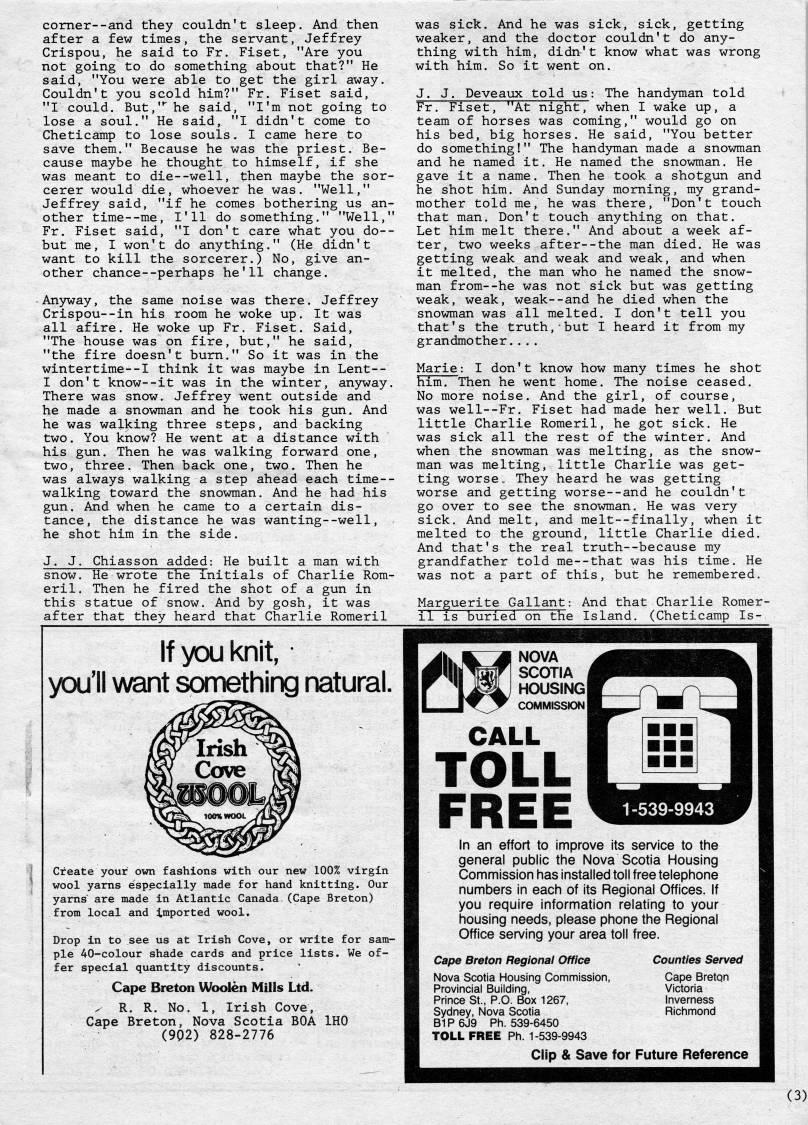 Published by Ronald Caplan on 1981/12/1 (335 reads)comer--and they couldn't sleep. And then after a few times, the servant, Jeffrey Crispou, he said to Fr. Fiset, "Are you not going to do something about that?" He said, "You were able to get the girl away. Couldn't you scold him?" Fr. Fiset said, "I could. But,"' he said, "I'm not going to lose a soul." He said, "I didn't come to Cheticamp to lose souls. I came here to save them." Because he was the priest. Be? cause maybe he thought to himself, if she was meant to die--well, then maybe the sor? cerer would die, whoever he was. "Well," Jeffrey said, "if he comes bothering us an? other time--me, I'll do something." "Well," Fr, Fiset said, "I don't care what you do-- but me, I won't do anything." (He didn't want to kill the sorcerer.) No, give an? other chance--perhaps he'll change. -Anyway, the same noise was there. Jeffrey Crispou--in his room he woke up. It was all afire. He woke up Fr. Fiset. Said, "The house was on fire, but," he said, "the fire doesn't burn." So it was in the wintertime--I think it was maybe in Lent-- I don't know--it was in the winter, anyway. There was snow. Jeffrey went outside and he made a snowman and he took his gun. And he was walking three steps, and backing two. You know? He went at a distance with his gun. Then he was walking forward one, two, three. Then back one, two. Then he was always walking a step ahead each time-- walking toward the snowman. And he had his gun. And when he came to a certain dis? tance, the distance he was wanting--well, he shot him in the side. J. J. Chiasson added: He built a man with snow. He wrote the initials of Charlie Rom? eril. Then he fired the shot of a gun in this statue of snow. And by gosh, it was after that they heard that Charlie Romeril was sick. And he was sick, sick, getting weaker, and the doctor couldn't do any? thing with him, didn't know what was wrong with him. So it went on. J. J. Deveaux told us: The handyman told Fr. Fiset, "At night, when I wake up, a team of horses was coming," would go on his bed, big horses. He said, "You better do something!" The handyman made a snowman and he named it. He named the snowman. He gave it a name. Then he took a shotgun and he shot him. And Sunday morning, my grand? mother told me, he was there, "Don't touch that man. Don't touch anything on that. Let him melt there." And about a week af? ter, two weeks after--the man died. He was getting weak and weak and weak, and when it melted, the man who he named the snow? man from--he was not sick but was getting weak, weak, weak--and he died when the snowman was all melted. I don't tell you that's the truth, but I heard it from my grandmother.... Marie: I don't know how many times he shot him. Then he went home. The noise ceased. No more noise. And the girl, of course, was well--Fr. Fiset had made her well. But little Charlie Romeril, he got sick. He was sick all the rest of the winter. And when the snowman was melting, as the snow? man was melting, little Charlie was get? ting worse • They heard he was getting worse and getting worse--and he couldn't go over to see the snowman. He was very sick. And melt, and melt--finally, when it melted to the ground, little Charlie died. And that's the real truth--because my grandfather told me--that was his time. He was not a part of this, but he remembered. Marguerite Gallant: And that Charlie Romer- il IS buried on the Island. (Cheticamp Is- If you knit, you'll want something natural. Create your own fashions with our new 100% virgin wool yarns especially made for hand knitting. Our yams" are made in Atlantic Canada. (Cape Breton) from local and imported wool. Drop in to see us at Irish Cove, or write for sam? ple 40-colour shade cards and price lists. We of? fer special quantity discounts. Cape Breton Woolen Mills Ltd. y R. R. No. 1, Irish Cove, Cape Breton, Nova Scotia BOA IHO (902) 828-2776 CALL TOLL In an effort to improve its service to the general public the Nova Scotia Housing Commission has installed toll free telephone numbers in each of its Regional Offices. If you require information relating to your housing needs, please phone the Regional Office serving your area toll free. Cape Breton Regional Office Nova Scotia Housing Commission, Provincial Building, Prince St., P.O. Box 1267, Sydney, Nova Scotia B1P 6J9 Ph. 539-6450 TOLL FREE Ph. 1-539-9943 Counties Served Cape Breton Victoria Inverness Richmond Clip & Save for Future Reference (3)