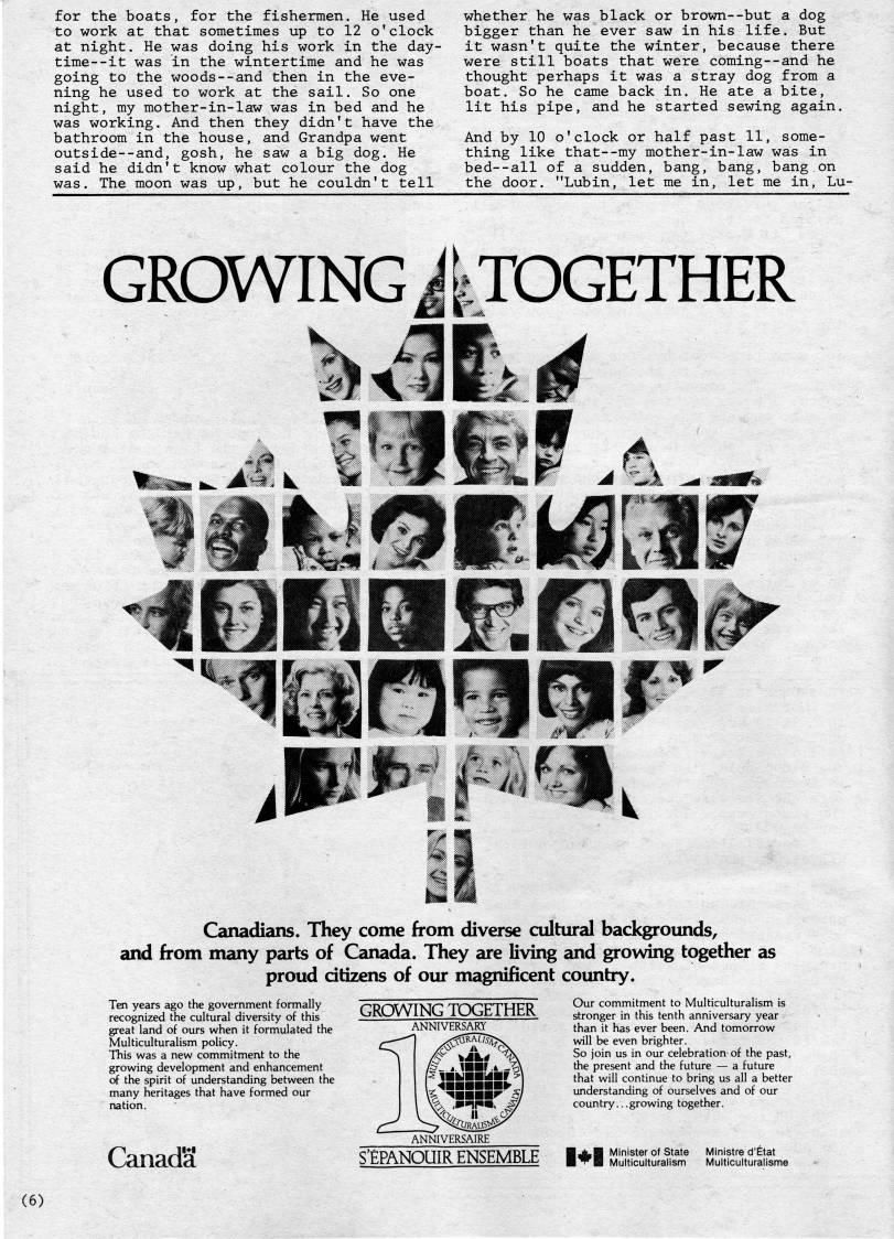 Published by Ronald Caplan on 1981/12/1 (274 reads)for the boats, for the fishermen. He used to work at that sometimes up to 12 o'clock at night. He was doing his work in the day? time- -it was in the wintertime and he was going to the woods--and then in the eve? ning he used to work at the sail. So one night, my mother-in-law was in bed and he was working. And then they didn't have the bathroom in the house, and Grandpa went outside--and, gosh, he saw a big dog. He said he didn't know what colour the dog was. The moon was up, but he couldn't tell whether he was black or brown--but a dog bigger than he ever saw in his life. But it wasn't quite the winter, because there were still boats that were coming--and he thought perhaps it was a stray dog from a boat. So he came back in. He ate a bite, lit his pipe, and he started sewing again. And by 10 o'clock or half past 11, some? thing like that--my mother-in-law was in bed--all of a sudden, bang, bang, bang on the door. "Lubin, let me in, let me in, Lu- GROWINGj'TOGETHER 'i 'JHfw'''i.' JBK • ??msmm arm Canadians. They come from diverse cultural backgrounds' and from many parts of Canada. They are living and growing together as proud dtizens of our magnificent country. Ten years ago the government formally recognized the cultural diversity of this great land of ours when it formulated the Multiculturalism policy. This was a new commitmer t to the growing development and enhancement of the spirit of understanding between the many heritages that have formed our nation. Canada GROWING TOGETHER ANNIVERSARY ANNIVERSAIRE Our commitment to Multiculturalism is stronger in this tenth anniversary year than it has ever been. And tomorrow will be even brighter. So join us in our celebration of the past, the present and the future • a future that will continue to bring us all a better understanding of ourselves and of our country...growing together. S'EPANOUIR ENSEMBLE |#|! Ministre d'Etat Multiculturaljsme (6)