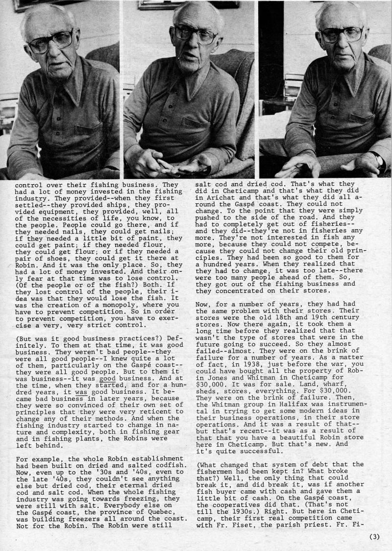 control over their fishing business. They had a lot of money invested in the fishing industry. They provided--when they first settled--they provided ships, they pro? vided equipment, they provided, well, all of the necessities of life, you know, to the people. People could go there, and if they needed nails, they could get nails; if they needed a little bit of paint, they could get paint; if they needed flour, they could get flour; or if they needed a pair of shoes, they could get it there at Robin. And it was the only place. So, they had a lot of money invested. And their on? ly fear at that time was to lose control. (Of the people or of the fish?) Both. If they lost control of the people, their i- dea was that they would lose the fish. It was the creation of a monopoly, where you have to prevent competition. So in order to prevent competition, you have to exer? cise a very, very strict control. (But was it good business practices?) Def? initely. To them at that time, it was good business. They weren't bad people--they were all good people--I knew quite a lot of them, particularly on the Gaspe coast-- they were all good people. But to them it was business--it was good business. And at the time, when they started, and for a hun? dred years, it was good business. It be? came bad business in later years, because they were so convinced of their own set of principles that they were very reticent to change any of their methods. And when the fishing industry started to change in na? ture and complexity, both in fishing gear and in fishing plants, the Robins were left behind. For example, the whole Robin establishment had been built on dried and salted codfish. Now, even up to the '30s and '40s, even to the late '40s, they couldn't see anything else but dried cod, their eternal dried cod and salt cod. When the whole fishing industry was going towards freezing, they were still with salt. Everybody else on the Gaspe coast, the province of Quebec, was building freezers all around the coast. Not for the Robin. The Robin were still salt cod and dried cod. That's what they did in Cheticamp and that's what they did in Arichat and that's what they did all a- round the Gaspe coast. They could not change. To the point that they were simply pushed to the side of the road. And they had to completely get out of fisheries-- and they did--they're not in fisheries any more. They're not interested in fish any more, because they could not compete, be? cause they could not change their old prin? ciples. They had been so good to them for a hundred years. When they realized that they had to change, it was too late--there were too many people ahead of them. So, they got out of the fishing business and they concentrated on their stores. Now, for a number of years, they had had the same problem with their, stores. Their stores were the old 18th and 19th century stores. Now there again, it took them a long time before they realized that that wasn't the type of stores that were in the future going to succeed. So they almost failed--almost. They were on the brink of failure for a number of years. As a matter of fact, in 1938, just before the war, you could have bought all the property of Rob? in Jones and Whitman in Cheticamp for $30,000. It was for sale. Land, wharf, sheds, stores, everything. For $30,000, They were on the brink of failure. Then, the Whitman group in Halifax was instrumen? tal in trying to get some modern ideas in their business operations, in their store operations. And it was a result of that-- but that's recent--it was as a result of that that you have a beautiful Robin store here in Cheticamp, But that's new. And it's quite successful, (What changed that system of debt that the fishermen had been kept in? What broke that?) Well, the only thing that could break it, and did break it, was if another fish buyer came with cash and gave them a little bit of cash. On the Gaspe coast, the cooperatives did that. (That's not till the 1930s.) Right. But here in Cheti? camp, their first real competition came with Fr. Fiset, the parish priest. Fr, Fi- (3)