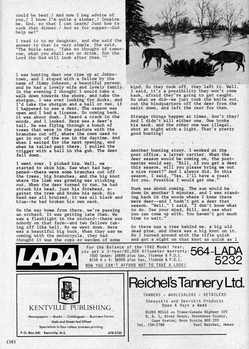 Published by Ronald Caplan on 1982/8/1 (256 reads)could be beat./ And now I beg advice of you,/ I know I'm quite a sinner,/ Inspire me, God, so that I can learn/ Just how to cook that dinner./ And as for supper--God help me!" I read it to my daughter, and she said the answer to that is very simple. She said, "The Bible says, 'Take no thought of tomor? row, what you shall eat or drink, for the Lord thy God will look after thee.'" I was hunting deer one time up at Johns? town, and I stayed with a fellow by the name of Jimmy Johnson, a beautiful person, and he had a lovely wife and lovely family. In the evening I thought I would take a walk down towards the shore, and take the shotgun. I was over looking for ducks, and I'd take the shotgun and a ball or two, if I happened to see a deer. The season was open and I had a license. So coming back, it was about dusk. I heard a crack in the woods, and I looked. Here was a deer's tail. He was flying through a bunch of trees that were in the pasture with the branches cut off, where the cows used to get in out of the sun in the daytime. And when I waited for the next opening, and when he tailed past there, I pulled the trigger with a ball in the gun. The deer fell down, I went over. I picked him. Well, we started to skin him. Saw what had hap? pened- -there were some branches cut off the trees, big branches, and the big knot where the limb was growing was sticking out. When the deer turned to run, he had struck his head, just his forehead, a- gainst the tree and broke his heck. His head was all bruised, it was all black and blue--he had broken his own neck. On the way home from there, we're passing an orchard. It was getting late then. We saw a flashlight in the orchard--there was nobody on that farm--and two fellows tak? ing off like hell. So we went down. Here was a beautiful big buck. When they saw me coming with the motorcycle, they had thought it was the cops or warden of some kind. So they took off, they left it. Well, I said, it's a possibility they won't come back, afraid they're going to get caught. So what we did--we just took the knife out, cut the hindquarters off the deer from the waist down, and left the rest for them. Strange things happen at times, don't they? And I didn't kill either one. One broke his neck, and the other one was illegal, shot at night with a light. That's pretty good hunting! Another hunting story. I worked at the post office, a letter carrier. When the deer season would be coming on, the post? master would say, "Bill, if you get a deer this season, will you please bring me out a nice roast?" And I always did. So this season, I said, "Yes, I'll have a roast for you. Possible I would get one." Dusk was about coming. The sun would be down in another 5 minutes, and I was stand? ing back in the woods where I knew there were deer--and I hadn't got a deer that season. "Well," I said, "I don't know what to do. Use your mind. Bill, and see what you can come up with. You haven't got much time to wait." So there was a tree behind me, a big old dead pine, and there was a big knot on it. So I turned around with the rifle quick and got a sight on that knot as quick as I For the Balance of the 1982 Model Year, ~''' m ?? Ar*A you get a 3-Year/80,000 Kilometer Warranty: 'fS/| • I /| j/ 1500 Sedan: $4698 plus tax, license & P.D.I. vyV'TT L-./3l-/#_l NIVA 4x4: $6998 plus tax, license & P.D.I. NOW YOU CAN'T AFFORD NOT TO TAKE A LOOK! 5232 KENTVILLE PUBLISHING Newspapers • Books • Catalogues • Business Forms Web and Sheet-fed Offset Specialists in four colour process printing P.O. Box 340 Kentville, N.S. 678-2122 (16) ReichersTannery Ltd. TANNERS - WHOLESALERS - RETAILERS Sheepskin and Deerskin Products Open 6 Days a Week BLUES MILLS on Trans-Canada Highway 105 R. R. 1, River Denys, Inverness County, Cape Breton, Nova Scotia BOE 2Y0 Tel. 756-2788 Karl Reichel, Owner