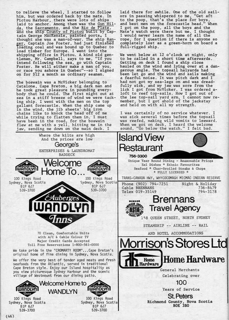 Published by Ronald Caplan on 1983/6/1 (300 reads)to relieve the wheel, I started to.follow him, but was ordered back by the mate. In Pictou Harbour, there were lots of ships laid to anchor. Among them was the Gun Hil? da, the Sacramento, and the Rio de Plate, and the ship County of Pictou built by Cap- tain George MacKenzie, painted ports, I thought she was a man-of-war. The ship Ran? ger, Captain Joe Foster, had just finished loading coal and was bound up to Quebec to load timber for Europe. I went into the shipping office in Pictou. A kind old gen? tleman, Mr. Campbell, says to me, "If you intend following the sea, go with Captain Foster. He will either make a man of you, or race you ashore in Quebec"--so I signed on for $12 a month as ordinary seaman. The boswain was a McVicker belonging to Catalone, Cape Breton, a big dark man and he took great pleasure in pounding every? body that he could. The first night out at sea in a stiff breeze of wind we were tack? ing ship. I went with the men on the top gallant forecastle. When the ship came up in the wind, the jib sheets' big iron chains like to knock the head off of me while trying to flatten them in. I must have been in the road, for the boswain flew at me with a yell, hitting me in the jaw, sending me down on the main deck. I laid there for awhile. One of the old sail? ors in passing whispered to me, "Get aft to the poop, that's the place for boys, and best men on the forecastle head." When I got on the poop, all the boys and the Mate's watch were there but me. I thought I would never leam the name of all the rope, for I question if there is anyone so completely lost as a green-horn on board a full-rigged ship. We went below at 12 o'clock at night, only to be called in a short time afterwards. Getting on deck I found a ship close hauled on the wind and lying over at a dan? gerous angle. The topsail halyards had been let go and the wind and sails making a fearful noise. It was pitch dark and I had not got my sea-legs on and was dread? fully sick, and my jaw was sore from the lick I got from McVicker. I was ordered a- loft to reef top-sails. How I got out of the lee top-sail yard arm, I cannot now re? member, but I got ahold of the jackstay and held on with all my strength. I was certainly of no service whatever. I was sick several times before the topsail was reefed, making wild vomits to leeward. When we got on deck, I heard the welcome sound, "Go below the watch." I felt bad. Where the kilts are high And the prices are low George's ENTERPRISES & LAUNDROMAT BADDECK Welcome • '"''"'HomeTo... 100 Kings Road Sydney, Nova Scotia BIP 6J7 539-3700 100 Kings Road Sydney, Nova Scotia BIP 6J7 539-3700 CAuberges ujnnDLvnl rinns 70 Clean, Comfortable Units with A/C & Cable Colour TV Major Credit Cards Accepted Toll Free Reservations 1-800-561-0000 We take pride in the "CROMARTY ROOM"...Cape Breton's original home of fine dining in Sydney, Nova Scotia. We offer the very best of tender aged meats and fresh seafoods from the Atlantic, served in traditional Cape Breton style. Enjoy our Island hospitality as you view picturesque Sydney Harbour and the scenic village of Westmount from our dining patio. Welcome Home to WANDLYN 100 Kings Road Sydney, Nova Scotia BIP 6J7 539-3700 (46) 100 Kings Road Sydney, Nova Scotia BIP 6J7 539-3700 Island View Restaurant 756-3300 Unique Year Round Dining - Reasonable Prices Eel Dishes * Ethnic Favourites Seafood * Char-Broiled Steaks & Chops * FULLY LICENSED * TRANS-CANADA HWY, WHYCOCOMAGH MICMAC INDIAN RESERVE Phone (902) 794-7251 Cable BRENNANS Telex 019-35149 Night & Holiday 736-8479 794-3178 Brennans Travel Agency 1='8 QUEEN STREET, NORTH SYDNEY STEAMSHIP AIRLINE -- RAIL AND HOTEL ACCOMMODATIONS Morrison's Stores Ltd Home Hardware General Merchants Celebrating over 100 Years of Service StPeters Richmond County, Nova Scotia BOE 3B0