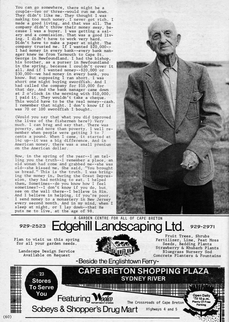 Published by Ronald Caplan on 1983/6/1 (146 reads)You can go somewhere, there might be a couple--two or three--would run me down. They didn't like me. They thought I was making too much money. I never got rich. I made a good living, and that was all. The company didn't throw their money away, be? cause I was a buyer. I was getting a sal? ary and a commission. That was a good liv? ing. I didn't have to work very hard. Didn't have to make a paper at night. The company trusted me. If I wanted $20,000-- I had money in every bank--every bank man? ager knew me from Yarmouth to Cape St. George in Newfoundland. I had the bishop, his brother, as a purser in Newfoundland in the spring, because I couldn't cover it all. And if I wanted money--$20,000 or $30,000--we had money in every bank, you know. But supposing I ran short. I was short one night buying swordfish. And I had called the company for $10,000 for that day. And the bank manager came down at 2 o'clock in the morning with $10,000. I paid it. They wouldn't take a cheque. This would have to be the real money--cash, I remember that night. I don't know if it was 70 or 100 swordfish I bought. (Would you say that what you did improved the lives of the fishermen here?) Very much, I can brag and say that. There was poverty, and more than poverty, I well re? member when people were getting 3 to 7 cents a pound. When I came, it started at 14c up--it was a big difference. And in American money, there was a small premium on the American dollar. Now, in the spring of the year--I am tel? ling you the truth--I remember a place, an old woman had come and grabbed me--she was old--she kissed me • She said, "You brought us bread." This is the truth. I was bring? ing the money in. During the Great Depres? sion, they had nothing to eat. I helped them. Sometimes--do you know how I feel sometimes?--! don't know if you do, but, see on the wall there--I believe in Him. And I believe in helping, if you're poor. I send money to a monastery in New Jersey every second m.onth. And in my mind, when I sleep at night, or I lay down--that He puts me to live, at the age of 98. 929-2523 A GARDEN CENTRE FOR ALL OF CAPE BRETON Edgehill Landscaping Ltd. 929-2971 Plan to visit us this spring for all your garden needs. Landscape Design Service Available on Request Fruit Trees, Shrubs Fertilizer, Lime, Peat Moss Seeds, Bedding Plants Strawberry & Rhubarb Plants Bluegrass Nursery Sod Concrete Planters & Fountains -Beside the Englishtown Ferry- CAPE BRETON SHOPPING PLAZA SYDNEY RIVER ?? ??lllllliHBBIIIIIIiBBaiililiin'V stores To Serve You mH' FeaturingAWr<7 ,, , , ,, , , , '' oEfAHTMENTSTORES The Crosspoacls of Cape Breton' Sobeys & Shopper's Drug Mart "'9''"''=' '"'' Open Daily ' 'Til 10 p.m. Plenty Of Free Parking