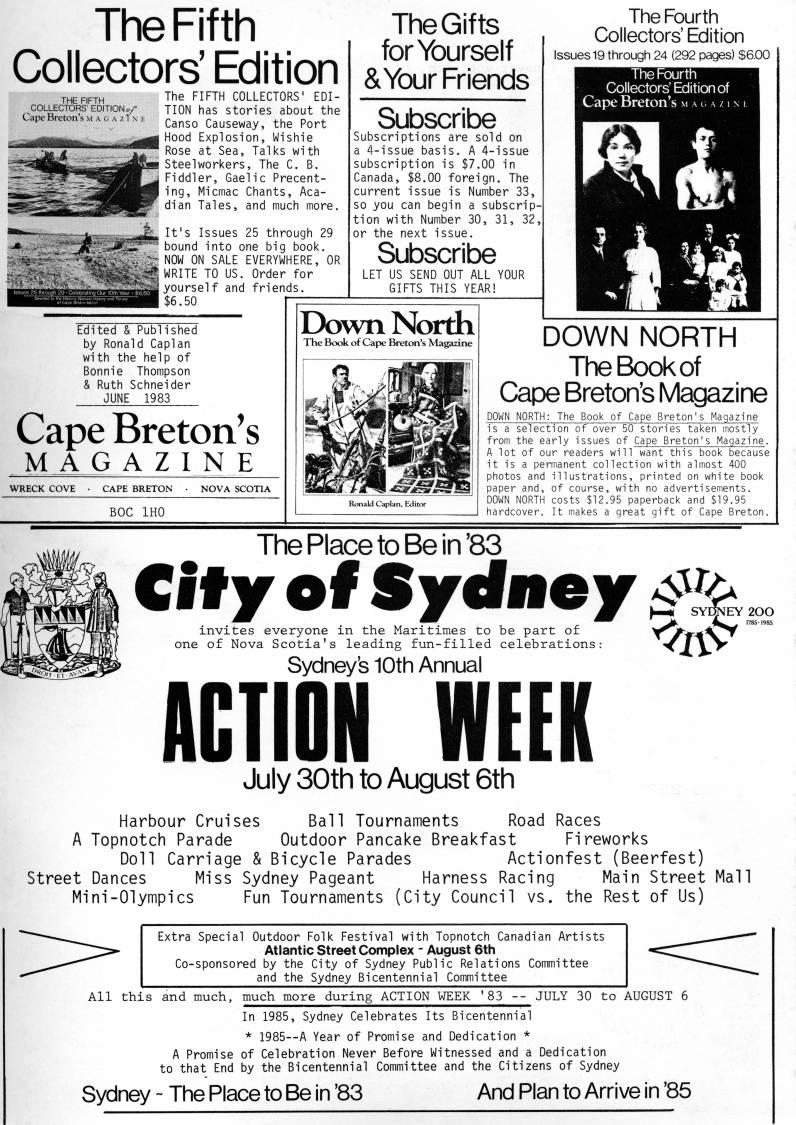 Published by Ronald Caplan on 1983/6/1 (174 reads)The Fifth Collectors' Edition THE FIFTH 'COLLECTORS' EDiTIGN Ca'ie Breton's: t. The FIFTH COLLECTORS' EDI? TION has stories about the Canso Causeway, the Port Hood Explosion, Wishie Rose at Sea, Talks with Steelworkers, The C. B. Fiddler, Gaelic Precent- ing, Micmac Chants, Aca? dian Tales, and much more. - '??-.- ..,'.-al?' It's Issues 25 through 29 "''''/'ilCl-L**" ?? bound into one big book. ' --W''V'''-'"'' ''' '' SALE EVERYWHERE, OR • cf-'l* .'.''' • ''' WRITE TO US. Order for :iSij?'A:-'..''-'-.'''' yourself and friends. 1 $6.50 Edited & Published by Ronald Caplan with the help of Bonnie Thompson & Ruth Schneider JUNE 1983 Cape Breton's MAGAZINE WRECK COVE • CAPE BRETON • NOVA SCOTIA The Gifts for Yourself & Your Friends Subscribe Subscriptions are sold on a 4-issue basis. A 4-issue subscription is $7.00 in Canada, $8.00 foreign. The current issue is Number 33, so you can begin a subscrip? tion with Number 30, 31, 32, or the next issue. Subscribe LET US SEND OUT ALL YOUR GIFTS THIS YEAR! Down North The Book of Cape Breton's Magazine Ronald Caplan, Eaitor The Fourth Collectors' Edition Issues 19 through 24 (292 pages) $6.00 DOWN NORTH The Book of Cape Breton's Magazine DOWN NORTH: The Book of Cape Breton's Magazine is a selection of over 50 stories taken mostly from the early issues of Cape Breton's Magazine. A lot of our readers will want this book because it is a permanent collection with almost 400 photos and illustrations, printed on white book paper and, of course, with no advertisements. DOWN NORTH costs $12.95 paperback and $19.95 hardcover. It makes a great gift of Cape Breton. yrn' SYKSJE The Place to Be in'83 City of Sydney invites everyone in the Maritimes to be part of one of Nova Scotia's leading fun-filled celebrations: Sydney's 10th Annual ACTION WEEK July 30th to August 6th Harbour Cruises Ball Tournaments Road Races A Topnotch Parade Outdoor Pancake Breakfast Fireworks Don Carriage & Bicycle Parades Actionfest (Beerfest) Street Dances Miss Sydney Pageant Harness Racing Main Street Mall Mini-Olympics Fun Tournaments (City Council vs. the Rest of Us) Extra Special Outdoor Folk Festival with Topnotch Canadian Artists Atlantic Street Complex - August 6th Co-sponsored by the City of Sydney Public Relations Committee and the Sydney Bicentennial Committee All this and much, much more during ACTION WEEK '83 -- JULY 30 to AUGUST 6 In 1985, Sydney Celebrates Its Bicentennial * 1985--A Year of Promise and Dedication * A Promise of Celebration Never Before Witnessed and a Dedication to that End by the Bicentennial Committee and the Citizens of Sydney Sydney - The Place to Be in '83 And Plan to Arrive in '85