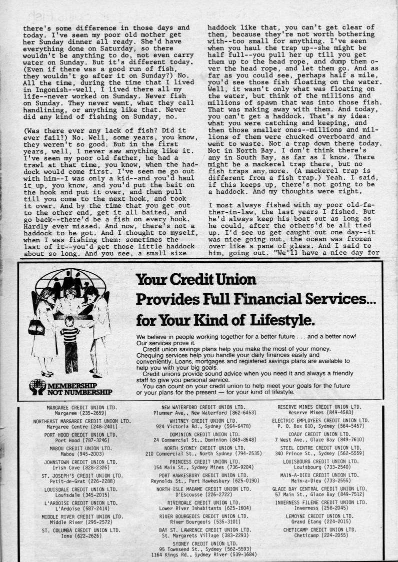there's some difference in those days and today. I've seen my poor old mother get her Sunday dinner all ready. She'd have everything done on Saturday, so there wouldn't be anything to do, not even carry water on Sunday. But it's different today. (Even if there was a good run of fish, they wouldn't go after it on Sunday?) No. All the time, during the time that I lived in Ingonish--well, I lived there all my life--never worked on Sunday. Never fish on Sunday. They never went, what they call handlining, or anything like that. Never did any kind of fishing on Sunday, no. (Was there ever any lack of fish? Did it ever fail?) No. Well, some years, you know, they weren't so good. But in the first years, well, I never saw anything like it. I've seen my poor old father, he had a trawl at that time, you know, when the had? dock would come first. I've seen me go out with him--I was only a kid--and you'd haul it up, you know, and you'd put the bait on the hook and put it over, and then pull till you come to the next hook, and took it over. And by the time that you get out to the other end, get it all baited, and go back--there'd be a fish on every hook. Hardly ever missed. And now, there's not a haddock to be got. And I thought to myself, when I was fishing them: sometimes the last of it • you'd get those little haddock about so long. And you see, a small size haddock like that, you can't get clear of them, because they're not worth bothering with--too small for anything. I've seen when you haul the trap up--she might be half full--you pull her up till you get them up to the head rope, and dump them o- ver the head rope, and let them go. And as far as you could see, perhaps half a mile, you'd see those fish floating on the water. Well, it wasn't only what was floating on the water, but think of the millions and millions of spawn that was into those fish. That was making away with them. And today, you can't get a haddock. That's my idea: what you were catching and keeping, and then those smaller ones--millions and mil? lions of them were chucked overboard and went to waste. Not a trap down there today. Not in North Bay. I don't think there's any in South Bay, as far as I know. There might be a mackerel trap there, but no fish traps any.more. (A mackerel trap is different from a fish trap.) Yeah. I said, if this keeps up, there's not going to be a haddock. And my thoughts were right. I most always fished with my poor old fa? ther-in-law, the last years I fished. But he'd always keep his boat out as long as he could, after the others'd be all tied up. I'd see us get caught out one day--it was nice going out, the ocean was frozen over like a pane of glass. And I said to him, going out. "We'll have a nice day for /MEMBERSHIP NOTNUMBERSHIP Your Czedit Union Provides Full Financial Services. for Your Kind of Lifestyle. We believe in people working together for a better future . . . and a better now! Our services prove it. Credit union savings plans help you make the most of your money. Chequing services help you handle your daily finances easily and conveniently. Loans, mortgages and registered savings plans are available to help you with your big goals. Credit unions provide sound advice when you need it and always a friendly staff to give you personal service. You can count on your credit union to help meet your goals for the future or your plans for the present • for your kind of lifestyle. ' 1 MARGAREE CREDIT UNION LTD. Margaree (235-2659) NORTHEAST MARGAREE CREDIT UNION LTD. Margaree Centre (248-2401) PORT HOOD CREDIT UNION LTD. Port Hood (787-3246) MABOU CREDIT UNION LTD. Mabou (945-2003) JOHNSTOWN CREDIT UNION LTD. Irish Cove (828-2326) ST. JOSEPH'S CREDIT UNION LTD. Petit-de-Grat (226-2288) LOUISDALE CREDIT UNION LTD. Louisdale (345-2015) L'ARDOISE CREDIT UNION LTD. L'Ardoise (587-2414) MIDDLE RIVER CREDIT UNION LTD. Middle River (295-2572) ST. COLUMBA CREDIT UNION LTD. lona (622-2626) NEW WATERFORD CREDIT UNION LTD. Piummer Ave., New Waterford (862-6453) WHITNEY CREDIT UNION LTD. 924 Victoria Rd., Sydney (564-6478) DOMINION CREDIT UNION LTD. 24 Commercial St., Dominion (849-8648) NORTH SYDNEY CREDIT UNION LTD. 210 Commercial St., North Sydney (794-2535) PRINCESS CREDIT UNION LTD. 154 Main St., Sydney Mines (736-9204) PORT HAWKESBURY CREDIT UNION LTD. Reynolds St., Port Hawkesbury (625-0190) NORTH ISLE MADAME CREDIT UNION LTD. D'Escousse (226-2722) RIVERDALE CREDIT UNION LTD. Lower River Inhabitants (625-1604) RIVER BOURGEOIS CREDIT UNION LTD. River Bourgeois (535-3101) BAY ST. LAWRENCE CREDIT UNION LTD. St. Margarets Village (383-2293) SYDNEY CREDIT UNION LTD. 95 Townsend St., Sydney (562-5593) 1164 Kings Rd., Sydney River (539-1684) RESERVE MINES CREDIT UNION LTD. Reserve Mines (849-4583) ELECTRIC EMPLOYEES CREDIT UNION LTD. P. 0. Box 610, Sydney (564-5457) COADY CREDIT UNION LTD. 7 West Ave., Glace Bay (849-7610) STEEL CENTRE CREDIT UNION LTD. 340 Prince St., Sydney (562-5559) LOUISBOURG CREDIT UNION LTD. Louisbourg (733-2540) MAIN-A-DIEU CREDIT UNION LTD. Main-a-Dieu (733-2555) GLACE BAY CENTRAL CREDIT UNION LTD. 57 Main St., Glace Bay (849-7512) INVERNESS FILENE CREDIT UNION LTD. Inverness (258-2045) LEMOYNE CREDIT UNION LTD. Grand Etang (224-2015) CHETICAMP CREDIT UNION LTD. Cheticamp (224-2055)