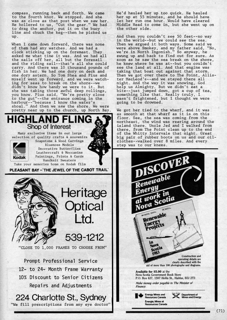 compass, running back and forth. We came to the fourth knot. We stopped. And she was as close as that post when we saw her. He hollered to us, "Cut the gear." We had to drag the anchor, put it on the buoy line and chuck the keg--then he picked us up. When I came down forward, there was none of them had any watches. And we had a clock sticking up on the foremast. They asked me what time it was. And we had all the sails off her, all but the foresail and the riding sail--that's all she could carry. And there was 10 thousand pounds of fish in her. We had one dory on deck and one dory astern. So Tom Shea and Pius and myself went up forward, and we were watch? ing for seas to break on the shore--we didn't know how handy we were to it. But she was taking those awful deep rollings, you know. Pius said, "We're pretty close to the gut"--the entrance coming in the harbour--"because I know the water's shoal." And then we saw the shore. We were pretty near up to the church, up North Bay. HIGHLAND FLING Shop of Interest Many exclusive items in our large selection of quality crafts & souvenirs 1 Soapstone & Wood Carvings fl''H Bluenose Models s. Decorative Butterflies =. Leathercraft & Moccasins PRODUCTS BY -r..'. T-...._r/-ij Kodak Paxntmgs, Prints & Cards ) ' Handknit Sweaters Take your memories home on Kodak film PLEASANT BAY -THE JEWEL OF THE CABOT TRAIL' Heritage Optical Ltd. 539-1212 CLOSE TO 1,000 FRAMES TO CHOOSE FROM" Prompt Professional Service 12- to 24- Month Frame Warranty 10% Discount to Senior Citizens Repairs and Adjustments 224 Charlotte St., Sydney "We fill prescriptions from any eye doctor' He'd hauled her up too quick. He hauled her up at 55 minutes, and he should have let her run one hour. Would have cleared Middle Head to come in, but she went up on the other side. And then you couldn't see 50 feet--no way in the world--but we could see the sea. Then we argued it both ways. Some said we were above Smokey, and my father said, "No, we're in North Ingonish." So anyway, he swung up and back to find out for sure. As soon as he saw the sea break on the shore, he knew where he was at--but you couldn't see the land at all. And that engine was taking that boat out against that storm. Then we got over there to The Point, Allis? ter MacLeod's--and we stayed there all night. And the way it was snowing, God help us Almighty. But we didn't eat a bite--just jumped down, got a cup of tea, something like that. Really truly, I wasn't frightened, but I thought we were going to be drowned. We got her tied to the wharf, and it was as smooth at that wharf as it is on this floor. See, the sea was coming from the northeast, the wind was rearing around the island there. Uncle Jed and I walked from there, from The Point clean up to the end of the Whitty Intervale that night. Great big pair of rubber boots on us arid our oil- clothes--walked over 8 miles. And every step was to our knees. Construction and operating details are clearly described with the aid of more than 100 photographs and diagrams. Available for $5.00 at the Nova Scotia Government Book Store P.O. Box 637, 1597 Hollis St, Halifax, B3J 2T3 Make money order payable to The Minister of Finance 1'1 Energie, Mines et Ressources Canada (71)