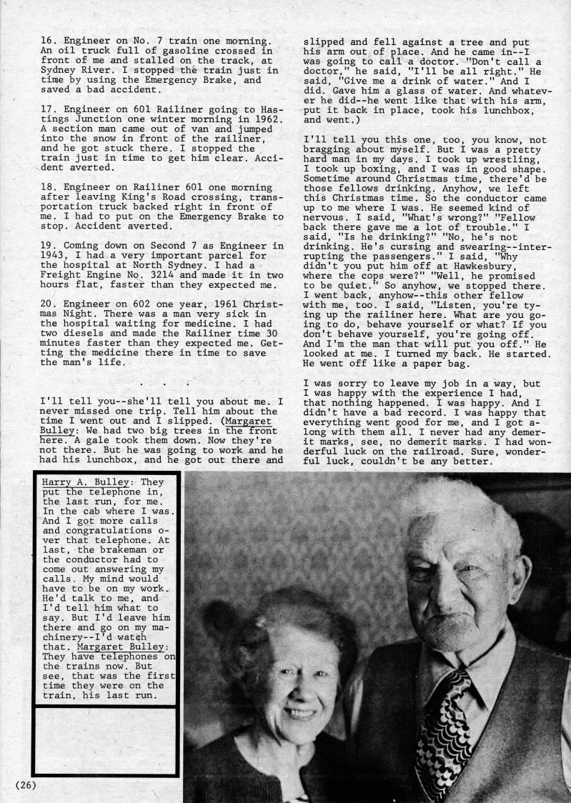 Published by Ronald Caplan on 1984/8/1 (356 reads)16. Engineer on No. 7 train one morning. An oil truck full of gasoline crossed in front of me and stalled on the track, at Sydney River. I stopped the train just in time by using the Emergency Brake, and saved a bad accident. 17. Engineer on 601 Railiner going to Has? tings Junction one winter morning in 1962. A section man came out of van and jtimped into the snow in front of the railiner, and he got stuck there. I stopped the train just in time to get him clear. Acci? dent averted. 18. Engineer on Railiner 601 one morning after leaving King's Road crossing, trans? portation truck backed right in front of me. I had to put on the Emergency Brake to stop. Accident averted. 19. Coming down on Second 7 as Engineer in 1943, I had a very important parcel for the hospital at North Sydney. I had a Freight Engine No. 3214 and made it in two hours flat, faster than they expected me. 20. Engineer on 602 one year, 1961 Christ? mas Night. There was a man very sick in the hospital waiting for medicine. I had two diesels and made the Railiner time 30 minutes faster than they expected me. Get? ting the medicine there in time to save the man's life. I'll tell you--she'll tell you about me. I never missed one trip. Tell him about the time I went out and I slipped. (Margaret Bulley: We had two big trees in the front here. A gale took them down. Now they're not there. But he was going to work and he had his lunchbox, and he got out there and slipped and fell against a tree and put his arm out of place. And he came in--I was going to call a doctor. "Don't call a doctor," he said, "I'll be all right." He said, "Give me a drink of water." And I did. Gave him a glass of water. And whatev? er he did--he went like that with his arm, put it back in place, took his lunchbox, and went.) I'll tell you this one, too, you know, not bragging about myself. But I was a pretty hard man in my days. I took up wrestling, I took up boxing, and I was in good shape. Sometime around Christmas time, there'd be those fellows drinking. Anyhow, we left this Christmas time. So the conductor came up to me where I was. He seemed kind of nervous. I said, "What's wrong?" "Fellow back there gave me a lot of trouble." I said, "Is he drinking?" "No, he's not drinking. He's cursing and swearing--inter? rupting the passengers." I said, "Why didn't you put him off at Hawkesbury, where the cops were?" "Well, he promised to be quiet." So anyhow, we stopped there, I went back, anyhow--this other fellow with me, too, I said, "Listen, you're ty? ing up the railiner here. What are you go? ing to do, behave yourself or what? If you don't behave yourself, you're going off. And I'm the man that will put you off." He looked at me. I turned my back. He started. He went off like a paper bag. I was sorry to leave my job in a way, but I was happy with the experience I had, that nothing happened. I was happy. And I didn't have a bad record. I was happy that everything went good for me, and I got a- long with them all. I never had any demer? it marks, see, no demerit marks. I had won? derful luck on the railroad. Sure, wonder? ful luck, couldn't be any better. Harry A. Bulley: They put the telephone in, the last run, for me. In the cab where I was And I got more calls and congratulations o- ver that telephone. At last, the brakeman or the conductor had to come out answering my calls o My mind would have to be on my work., He'd talk to me, and I'd tell him what to say. But I'd leave him there and go on my ma? chinery- -I'd watch that. Margaret Bulley: They have telephones on the trains now. But see, that was the first time they were on the train, his last run. (26)