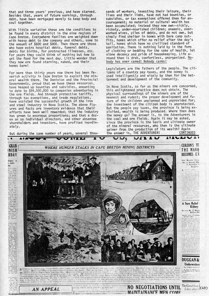 that and three years' previous, and have starved. Besides that, years of future earnings, through debt, have been mortgaged merely to keep body and soul together. With little variation these are the conditions to be found in every district in the mine regions of Cape Breton. Everywhere families are weighted down with heavy debt to the company and others, some to the amount of $600 and $800. Then there are those who have extra hospital debts, funeral debts, debts for births, for protracted illnesses, etc. For years they could think of nothing but how to get the food for the next day. Little wonder that they now are found starving, naked, and their homes bare! For more than thirty years now there has been fe? verish activity in Cape Breton to exploit the min? eral wealth there. The Dominion and the Provincial Governments, proud that we have these resources, have heaped up bounties and subsidies, amounting to date to $94,500,000 to companies adventuring in the ore fields. And through protective tariffs, through tax exemptions, and trade regulations, have assisted the successful growth of the iron and steel industry in Nova Scotia. The above fig? ures and facts are inventory evidence that their efforts have been well rewarded; that the industry has grown to enormous proportions; and that a doz? en or so individual directors, and other absentee shareholders and investors, have profited inordin? ately. But during the same number of years, several thou? sands of workers, investing their leisure, their lives and their limbs, have not had bounties, or subsidies, or tax exemptions offered them for en? couragement; no material or cultural wealth has been accumulated; instead they now own--sickly, rickety, under-nourished children; anaemic, over? worked wives, piles of debts, and do not own, but simply find shelter in homes with bare camp out? fits, homes which offer no relief after the day's toil, homes which have no civilized standard of sanitation. There is nothing laid by in the form of clothing or bedding for the sake of health, let alone decency and pride of housekeeping. Life a- round them is drab, comfortless, unorganized. No? body has ever cared! Nobody cares! Legislators are the fathers of the people. The cit? izens of a country pay taxes, and the money is used intelligently and wisely by them for the bet? terment and development of the community. In Nova Scotia, so far as the miners are concerned, this enlightened practice does not obtain. The physical surroundings of the miners are of the meanest and rudest; the proper development and fu? ture of the children unplanned and unprovided for; the investment of the citizen body is unprotected. But the people pay taxes, the province is being ex? ploited, wealth is being produced. Where then does the money go? The answer is, to the Adventurers in the coal and ore fields. Again it may be asked, since the province is the basis and ultimate owner of the mineral resources, who then is the ultimate gainer from the production of its wealth? Again the answer is, THE ADVENTURER! CONTINUED GILUS iCURZON'S IV WHERE HUNGER STALKS IN CAPE BRETON MINING DISTRICTS AN APPEAL NO NEGOTIATIONS UNTIL '}f MAINTAINANfF MFM C(MV ?? :i(49)