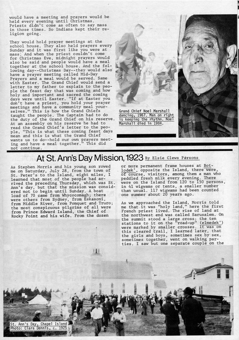 Published by Ronald Caplan on 1985/8/1 (482 reads)would have a meeting and prayers would be held every evening until Christmas. Priests didn't come as often to say mass in those times. So Indians kept their re? ligion going. They would hold prayer meetings at the school house. They also held prayers every Sunday and it was first like you were at mass'. And when the priest couldn't come for Christmas Eve, midnight prayers would also be said and people would have a meal together at the school house. And the fol? lowing day--Christmas Day--they would also have a prayer meeting called Mid-Day Prayers and a meal would be served. Same with Easter. The Grand Chief would send a letter to my father to explain to the peo? ple the feast day that was coming and how holy and important and sacred the coming days were until Easter. "If at Easter you don't have a.priest, you hold your prayer meetings and have a community meal your? selves." This is how the Grand Chiefs taught the people. The Captain had to do the duty of the Grand Chief on his reserve. At an assembly on his reserve he had to read the Grand Chief's letter to the peo? ple, "This is what these coming feast days mean and this is what the Grand Chief wants us to do--hold our own prayers meet? ing and have a meal together." This did not continue. Grand Chief Noel Marshall dancing, 1967. Man on right is keeping the rhythm. Noel Marshall died in 1984. At St. Ann's Day Mission, 1923 By Elsie Clews Parsons As Stephen Morris and his young son rowed me on Saturday, July 28, from the town of St. Peter's to the Island, eight miles, I learned that most of the people had ar? rived the preceding Thursday, which was St. Ann's day, but that the mission was consid? ered not to begin until Sunday. A boat load of 70 came from Whycocomagh; there were others from Sydney, from Eskasoni, from Middle River, from Pomquet and Truro; the most conspicuous pilgrims of all were from Prince Edward Island, the Chief of Rocky Point and his wife. From the dozen or more permanent frame houses at Bot- lodek', opposite the Island, there were, of course, visitors, among them a man who peddled fresh milk every evening. There were on the Island from 120 to 150 persons, in 41 wigwams or tents, a smaller number than usual. 117 wigwams had been counted one summer about 20 years ago. As we approached the Island, Morris told me that.it was "holy land," here"the first French priest lived. The rise of land at the northwest end was called Sarusalem. On the summit stood a large cross; the ten stations to it on the "road-up" (elmedek') were marked by smaller crosses. It was on this cleared trail, I learned later, that the girls and boys, sometimes sex by sex, sometimes together, went on walking par? ties. I saw but one separate couple on the j' I