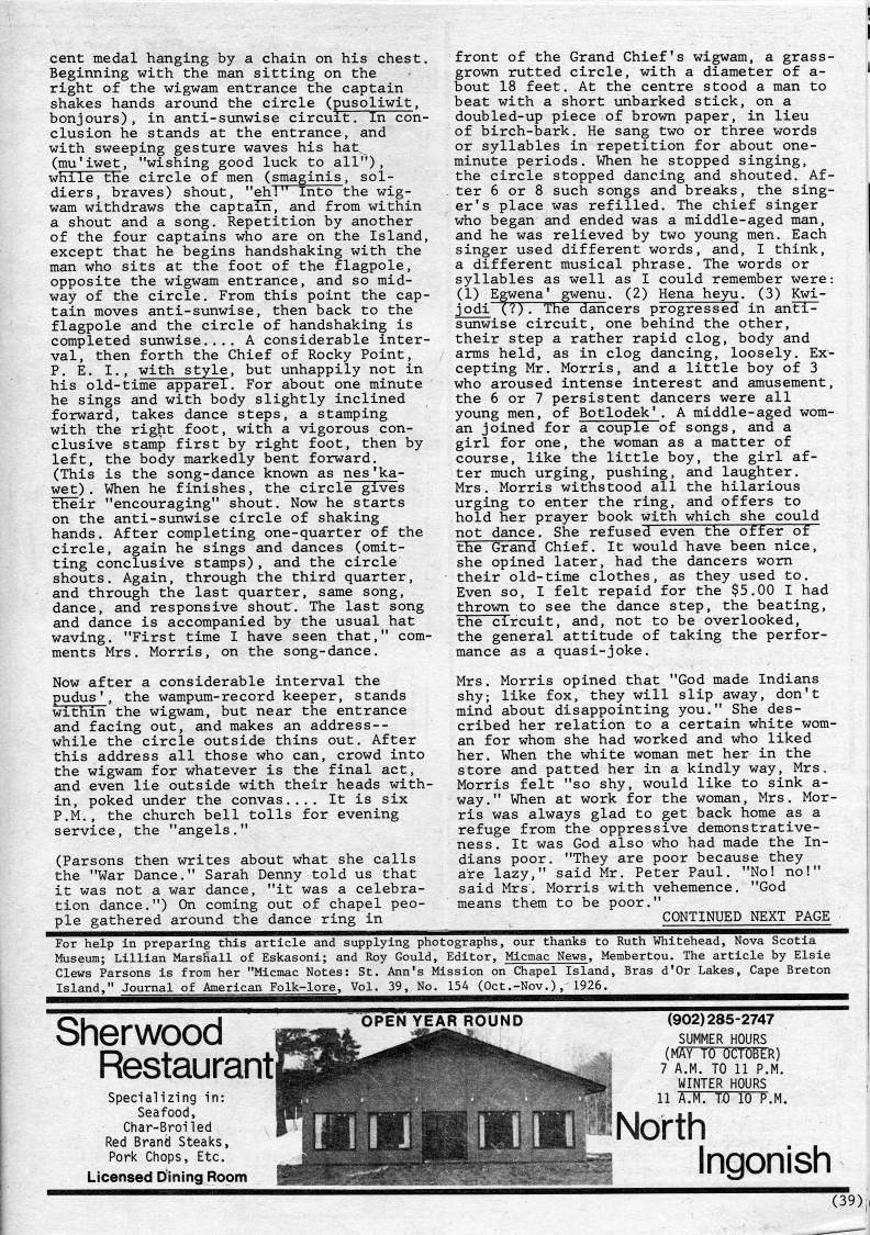 Published by Ronald Caplan on 1985/8/1 (423 reads)cent medal hanging by a chain on his chest. Beginning with the man sitting on the right of the wigwam entrance the captain shakes hands around the circle (pusoliwit, bonjours), in anti-sunwise circuit. In con- clusion he stands at the entrance, and with sweeping gesture waves his hat' (mu'iwet, "wishing good luck to all"), while the circle of men (smaginis, sol? diers, braves) shout, "eh!" Into the wig? wam withdraws the captain, and from within a shout and a song. Repetition by another of the four captains who are on the Island, except that he begins handshaking with the man who sits at the foot of the flagpole, opposite the wigwam entrance, and so mid? way of the circle. From this point the cap? tain moves anti-sunwise, then back to the flagpole and the circle of handshaking is completed sunwise.... A considerable inter? val, then forth the Chief of Rocky Point, P. E. I., with style, but unhappily not in his old-time apparel. For about one minute he sings and with body slightly inclined forward, takes dance steps, a stamping with the right foot, with a vigorous con? clusive stamp first by right foot, then by left, the body markedly bent forward. (This is the song-dance known as nes'ka- wet). When he finishes, the circle gives their "encouraging" shout. Now he starts on the anti-sunwise circle of shaking hands. After completing one-quarter of the circle, again he sings and dances (omit? ting conclusive stamps), and the circle shouts. Again, through the third quarter, and through the last quarter, same song, dance, and responsive shout. The last song and dance is accompanied by the usual hat waving. "First time I have seen that," com? ments Mrs. Morris, on the song-dance. Now after a considerable interval the pudus', the wampum-record keeper, stands within the wigwam, but near the entrance and facing out, and makes an address-- while the circle outside thins out. After this address all those who can, crowd into the wigwam for whatever is the final act, and even lie outside with their heads with? in, poked under the convas.... It is six P.M., the church bell tolls for evening service, the "angels." (Parsons then writes about what she calls the "War Dance." Sarah Denny told us that it was not a war dance, "it was a celebra? tion dance.") On coming out of chapel peo? ple gathered around the dance ring in front of the Grand Chief's wigwam, a grass- grown rutted circle, with a diameter of a- bout 18 feet. At the centre stood a man to beat with a short unbarked stick, on a doubled-up piece of brown paper, in lieu of birch-bark. He sang two or three words or syllables in repetition for about one- minute periods. When he stopped singing, the circle stopped dancing and shouted. Af- . ter 6 or 8 such songs and breaks, the sing? er's place was refilled. The chief singer who began and ended was a middle-aged man, and he was relieved by two young men. Each singer used different words, and, I think, a different musical phrase. The words or syllables as well as I could remember were: (1) Egwena' gwenu. (2) Hena heyu. (3) Kwi- jodi (?). The dancers progressed in anti- sunwise circuit, one behind the other, their step a rather rapid clog, body and arms held, as in clog dancing, loosely. Ex? cepting Mr. Morris, and a little boy of 3 who aroused intense interest and amusement, the 6 or 7 persistent dancers were all young men, of Botlodek'. A middle-aged wom? an joined for a couple of songs, and a girl for one, the woman as a matter of course, like the little boy, the girl af? ter much urging, pushing, and laughter. Mrs. Morris withstood all the hilarious urging to enter the ring, and offers to hold her prayer book with which she could not dance. She refused even the offer of the Grand Chief. It would have been nice, she opined later, had the dancers worn their old-time clothes, as they used to. Even so, I felt repaid for the $5.00 I had thrown to see the dance step, the beating, the circuit, and, not to be overlooked, the general attitude of taking the perfor? mance as a quasi-joke. Mrs. Morris opined that "God made Indians shy; like fox, they will slip away, don't mind about disappointing you." She des? cribed her relation to a certain white wom? an for whom she had worked and who liked her. When the white woman met her in the store and patted her in a kindly way, Mrs, Morris felt "so shy, would like to sink a- way." When at work for the woman, Mrs. Mor? ris was always glad to get back home as a refuge from the oppressive demonstrative- ness. It was God also who had made the In? dians poor. "They are poor because they are lazy," said Mr. Peter Paul. "No! no!" said Mrs. Morris with vehemence. "God means them to be poor." CONTINUED NEXT PAGE For help in preparing this article and supplying photographs, our thanks to Ruth Whitehead, Nova Scotia Museum; Lillian Marshall of Eskasoni; and Roy Gould, Editor, Micmac News, Membertou. The article by Elsie Clews Parsons is from her "Micmac Notes: St. Ann's Mission on Chapel Island, Bras d'Or Lakes, Cape Breton Island," Journal of American Folk-lore, Vol. 39, No. 154 (Oct.-Nov.), 1926. Sherwood Restaurant; Specializing in: Seafood, Char-Broiled Red Brand Steaks, Pork Chops, Etc. Licensed Dining Room OPEN YEAR ROUND (902)285-2747 SUMMER HOURS (MAY TO OCTOBER) 7 A.M. TO 11 P.M. WINTER HOURS 11 A.M. TO 10 P.M. North Ingonish (39),,