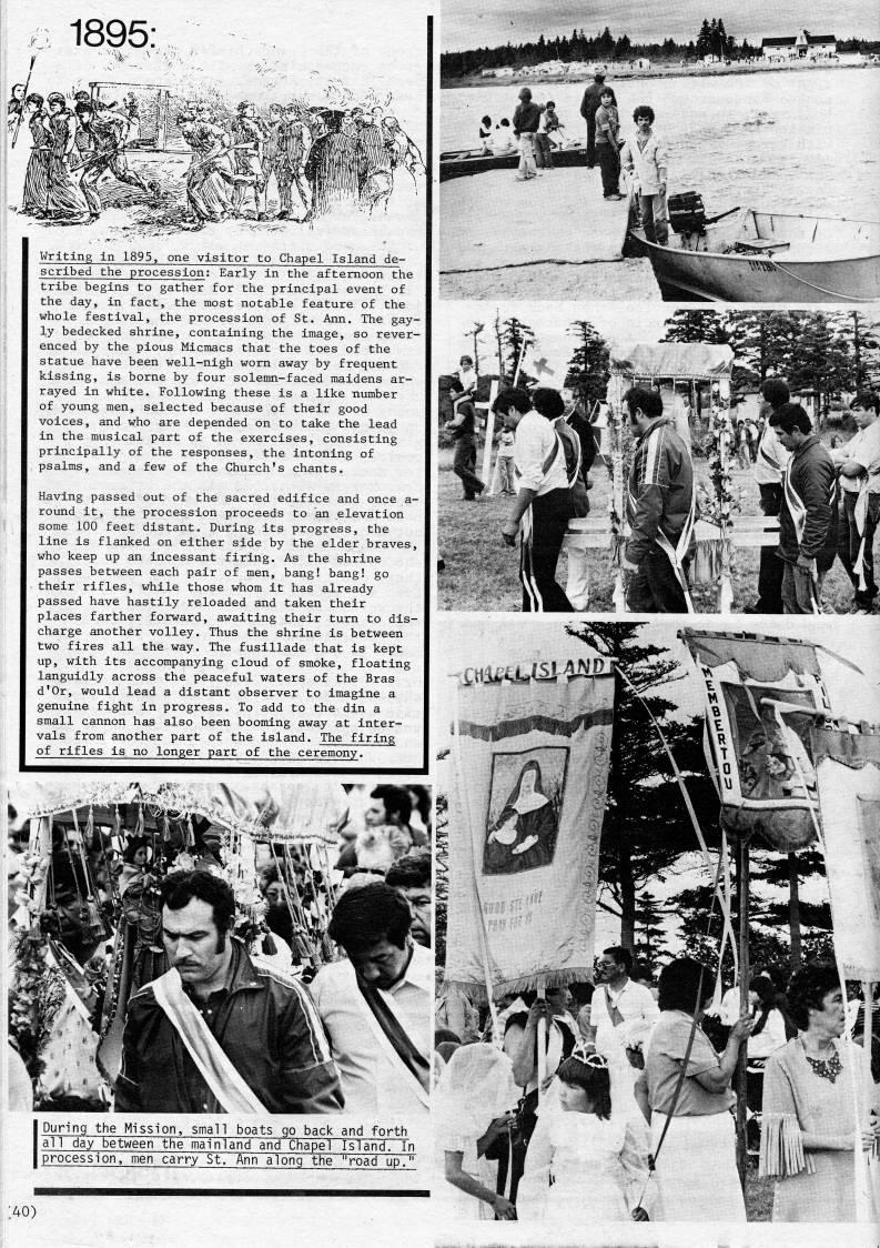 Published by Ronald Caplan on 1985/8/1 (570 reads)1895 Writing in 1895, one visitor to Chapel Island de? scribed the procession; Early in the afternoon the tribe begins to gather for the principal event of the day, in fact, the most notable feature of the whole festival, the procession of St. Ann. The gay- ly bedecked shrine, containing the image, so rever? enced by the pious Micmacs that the toes of the statue have been well-nigh worn away by frequent kissing, is borne by four solemn-faced maidens ar? rayed in white. Following these is a like number of young men, selected because of their good voices, and w:ho are depended on to take the lead in the musical part of the exercises, consisting principally of the responses, the intoning of psalms, and a few of the Church's chants. Having passed out of the sacred edifice and once a- round it, the procession proceeds to an elevation some 100 feet distant. During its progress, the line is flanked on either side by the elder braves, who keep up an incessant firing. As the shrine passes between each pair of men, bang! bang! go - their rifles, while those whom it has already passed have hastily reloaded and taken their places farther forward, awaiting their turn to dis? charge another volley. Thus the shrine is between two fires all the way. The fusillade that is kept up, with its accompanying cloud of smoke, floating languidly across the peaceful waters of the Bras d'Or, would lead a distant observer to imagine a genuine fight in progress. To add to the din a small cannon has also been booming away at inter? vals from another part of the island. The firing of rifles is no longer part of the ceremony. I During the Mission, small boats go back and forth all day between the mainland and Chapel Island. In procession, men carry St. Ann along the "road up." :40)