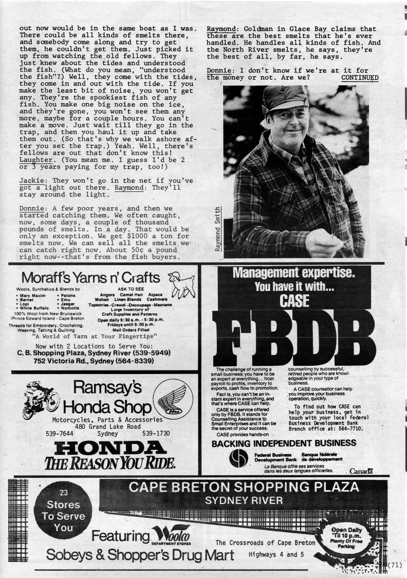 Published by Ronald Caplan on 1985/8/1 (223 reads)out now would be in the same boat as I was. There could be all kinds of smelts there, and somebody come along and try to get them, he couldn't get them. Just picked it up from watching the old fellows. They just knew about the tides and xmderstood the fish. (What do you mean, "understood the fish"?) Well, they come with the tides, they come in and out with the tide. If you make the least bit of noise, you won't get any. They're the spookiest fish of any fish. You make one big noise on the ice, and they're gone, you won't see them any more, maybe for a couple hours. You can't make a move. Just wait till they go in the trap, and then you haul it up and take them out. (So that's why we walk ashore af? ter you set the trap.) Yeah. Well, there's fellows are out that don't know this! Laughter. (You mean me. I guess I'd be 2 or 3 years paying for my trap, too!) Jackie: They won't go in the net if you've got a light out there. Raymond: They'll stay around the light. Donnie: A few poor years, and then we started catching them. We often caught, now, some days, a couple of thousand pounds of smelts. In a day. That would be only an exception. We get $1000 a ton for smelts now. We can sell all the smelts.we' can catch right now. About 50o a pound right now--that's from the fish buyers. Ra3miond; Goldman in Glace Bay claims that these are the best smelts that he's ever handled. He handles all kinds of fish. And the North River smelts, he says, they're the best of all, by far, he says. Donnie: I don't know if we're at it for the money or not. Are we? CONTINUED Moraffs Yarns n'Crafts Wools, Synthetics & Blends by • Mary Maxim • Paton?? • Bernat • Emu • Lopi • Jaeger • White Buffalo • Nomotta 100% Wool from New Brunswick IPrince Edward Island - Cape Breton Threads for Embroidery. Crocheting, Weaving, Tatting & Quilting Tapestries-Crewel -.Oecoupage -Macrame Large Inventory of Craft Supplies and Patterns Open daily 9:30 a.m. • S:30 p.m. Fridays until 9:00 p.m. Mail Orders Filled "A World of Yarn at Your Fingertips" Now with 2 Locations to Serve You: C. B. Shopping Plaza, Sydney River (539-5949) 752 Victoria Rd., Sydney (564-8339) Ramsay's 1' Honda Shop Motorcycles, Parts & Accessories 480 Grand Lake Road 539-7644 Sydney 539-1730 ItiEREASONYOURlIE, Management expertise. You have it with... CASE The challenge of running a small business; you have to be an expert at everything... f rocn payroll to profits, inventory to exports, cash flow to promotion. Fact is, you can't be an in? stant expert in everything, and that's where CASE can help. CASE is a service offereij only by FBDB. It stands for Counselling Assistance to Small Enterprises and it can be the secret of your success. CASE provides hands-on counselling by successful, retired people who are knowl? edgeable in your type of business. A CASE counsellor can help .you improve your business operation, quickly. To find out how CASE can help your business, get in touch with your local Federal Business Development Bank Branch office at: 564-7710. BACKING INDEPENDENT BUSINESS Development Bank de developpement La Banque offre ses services dans les deux langues offIcielles. . (Canada Stores To Serve You CAPE BRETON SHOPPING PLAZA SYDNEY RIVER HP' Featuring'W?? Omi • TIM OErMTiNCNTtTOIItS 10 p.m. The Crossroads of Cape Breton x. "*2L21?'** JP Sobeys & Shopper's Drug Mart Highways 4 and 5 1(71)