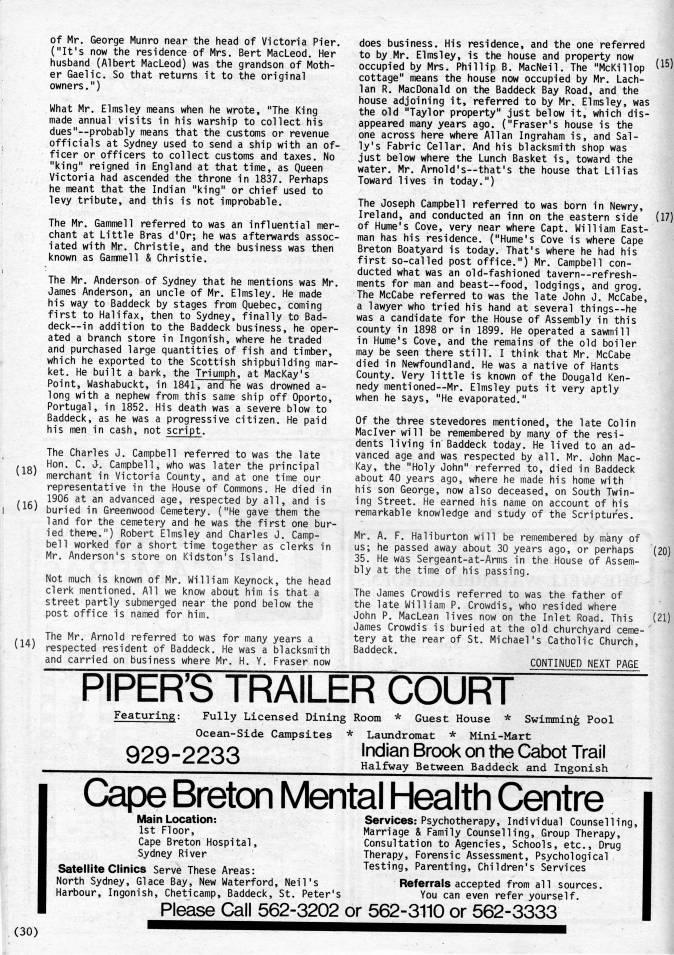 (18) (16) (14) of Mr. George Munro near the head of Victoria Pier. ("It's now the residence of Mrs. Bert MacLeod. Her husband (Albert MacLeod) was the grandson of Moth? er Gaelic. So that returns it to the original owners.") What Mr. Elmsley means when he wrote, "The King made annual visits in his warship to collect his dues"--probably means that the customs or revenue officials at Sydney used to send a ship with an of? ficer or officers to collect customs and taxes. No "king" reigned in England at that time, as Queen Victoria had ascended the throne in 1837. Perhaps he meant that the Indian "king" or chief used to levy tribute, and this is not improbable. The Mr. Gammell referred to was an influential mer? chant at Little Bras d'Or; he was afterwards assoc? iated with Mr. Christie, and the business was then known as Gammell & Christie. The Mr. Anderson of Sydney that he mentions was Mr. James Anderson, an uncle of Mr. Elmsley. He made his way to Baddeck by stages from Quebec, coming first to Halifax, then to Sydney, finally to Bad- deck • in addition to the Baddeck business, he oper? ated a branch store in Ingonish, where he traded and purchased large quantities of fish and timber, which he exported to the Scottish shipbuilding mar? ket. He built a bark, the Triumph, at MacKay's Point, Washabuckt, in 1841, and he was drowned a- long with a nephew from this same ship off Oporto, Portugal, in 1852. His death was a severe blow to Baddeck, as he was a progressive citizen. He paid his men in cash, not script. The Charles J. Campbell referred to was the late Hon. C. J. Campbell, who was later the principal merchant in Victoria County, and at one time our representative in the House of Commons. He died in 1906 at an advanced age, respected by all, and is buried in Greenwood Cemetery. ("He gave them the land for the cemetery and he was the first one bur? ied there.") Robert Elmsley and Charles J. Camp? bell worked for a short time together as clerks in Mr. Anderson's store on Kidston's Island. Not much is known of Mr. William Keynock, the head clerk mentioned. All we know about him is that a street partly submerged near the pond below the post office is named for him. The Mr. Arnold referred to was for many years a respected resident of Baddeck. He was a blacksmith and carried on business where Mr. H. Y. Fraser now does business. His residence, and the one referred to by Mr. Elmsley, is the house and property now ,-px occupied by Mrs. Phillip B. MacNeil. The "McKillop '''' cottage" means the house now occupied by Mr. Lach- lan R. MacDonald on the Baddeck Bay Road, and the house adjoining it, referred to by Mr. Elmsley, was the old "Taylor property" just below it, which dis? appeared many years ago. ("Fraser's house is the one across here where Allan Ingraham is, and Sal? ly's Fabric Cellar. And his blacksmith shop was just below where the Lunch Basket is, toward the water. Mr. Arnold's • that's the house that Lilias Toward lives in today.") The Joseph Campbell referred to was born in Newry, Ireland, and conducted an inn on the eastern side (17) of Hume's Cove, very near where Capt. William East? man has his residence. ("Hume's Cove is where Cape Breton Boatyard is today. That's where he had his first so-called post office.") Mr. Campbell con? ducted what was an old-fashioned tavern--refresh- ments for man and beast • food, lodgings, and grog. The McCabe referred to was the late John J. McCabe, a lawyer who tried his hand at several things--he was a candidate for the House of Assembly in this county in 1898 or in 1899. He operated a sawmill in Hume's Cove, and the remains of the old boiler may be seen there still. I think that Mr. McCabe died in Newfoundland. He was a native of Hants County. Mery little is known of the Dougald Ken? nedy mentioned • Mr. Elmsley puts it yery aptly when he says, "He evaporated." Of the three stevedores mentioned, the late Colin Maclver will be remembered by many of the resi? dents living in Baddeck today. He lived to an ad? vanced age and was respected by all. Mr. John Mac? Kay, the "Holy John" referred to, died in Baddeck about 40 years ago, where he made his home with his son George, now also deceased, on South Twin? ing Street. He earned his name on account of his remarkable knowledge and study of the Scriptures. Mr. A. F. Haliburton will be remembered by many of us; he passed away about 30 years ago, or perhaps (20) 35. He was Sergeant-at-Arms in the House of Assem? bly at the time of his passing. The James Crowdis referred to was the father of the late William P. Crowdis, who resided where John P. MacLean lives now on the Inlet Road. This (21) James Crowdis is buried at the old churchyard ceme? tery at the rear of St. Michael's Catholic Church, Baddeck. CONTINUED NEXT PAGE PIPER'S TRAILER COURT Featuring: 929-2233 Fully Licensed Dining Room * Guest House * Swimming Pool Ocean-Side Campsites * Laundromat * Mini-Mart Indian Brook on the Cabot Trail Halfway Between Baddeck and Ingonish Cape Breton Mental Health Centre Main Location: 1st Floor, Cape Breton Hospital, Sydney River Satellite Clinics Serve These Areas: North Sydney, Glace Bay, New Waterford, Neil's Harbour, Ingonish, Cheticamp, Baddeck, St. Peter's Services: Psychotherapy, Individual Counselling, Marriage & Family Counselling, Group Therapy, Consultation to Agencies, Schools, etc.. Drug Therapy, Forensic Assessment, Psychological Testing, Parenting, Children''s Services Referrals accepted from all sources. You can even refer yourself. Please Call 562-3202 or 562-3110 or 562-3333 (30)