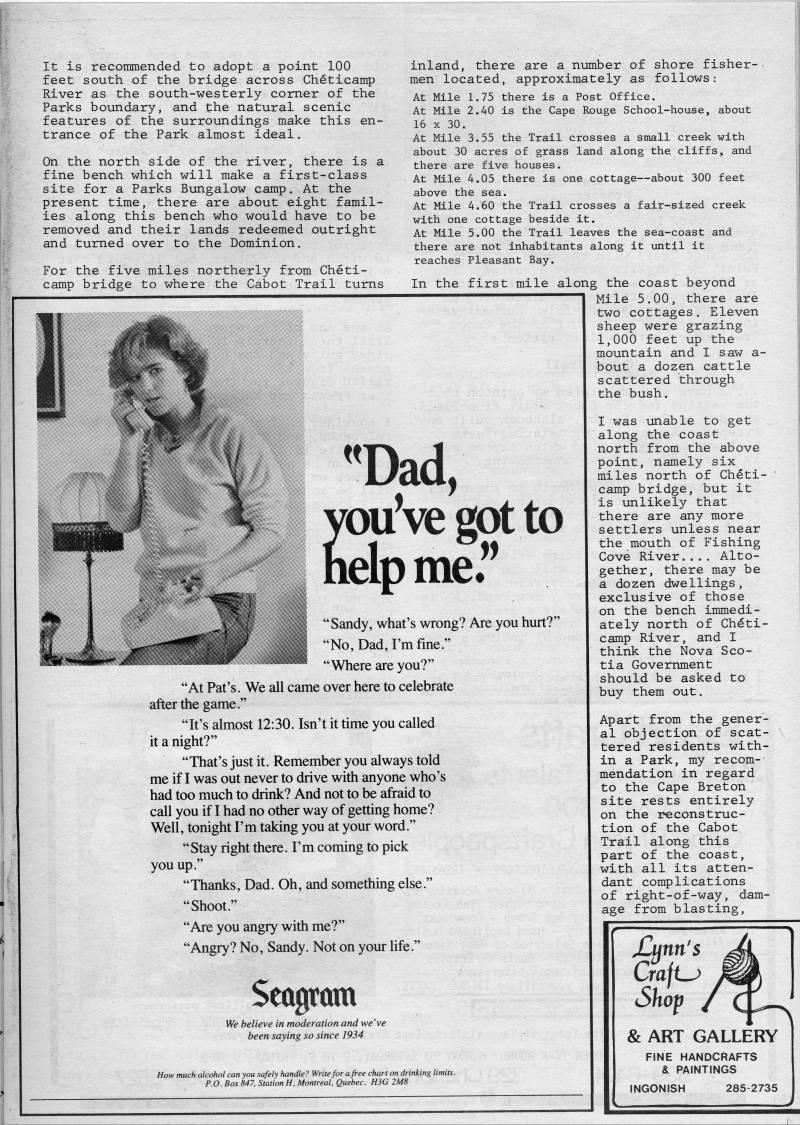 It is recommended to adopt a point 100 feet south of the bridge across Cheticamp River as the south-westerly comer of the Parks boundary, and the natural scenic features of the surroundings make this en? trance of the Park almost ideal. On the north side of the river, there is a fine bench which will make a first-class site for a Parks Buagalow camp. At the present time, there are about eight famil? ies along this bench who would have to be removed and their lands redeemed outright and turned over to the Dominion. For the five miles northerly from Cheti? camp bridge to where the Cabot Trail turns "Sandy, what's wrong? Are you hurt?" "No, Dad, I'm fine." "Where are you?" "At Pat's. We all came over here to celebrate after the game." "It's almost 12:30. Isn't it time you called it a night?" "That's just it. Remember you always told me if I was out never to drive with anyone who's had too much to drink? And not to be afraid to call you if I had no other way of getting home? Well, tonight I'm taking you at your word." "Stay right there. I'm coming to pick you up." "Thanks, Dad. Oh, and something else." "Shoot." "Are you angry with me?" "Angry? No, Sandy. Not on your life." inland, there are a number of shore fisher? men located, approximately as follows: At Mile 1.75 there is a Post Office. At Mile 2.40 is the Cape Rouge School-house, about 16 X 30. At Mile 3.55 the Trail crosses a small creek with about 30 acres of grass land along the, cliffs, and there are five houses. At Mile 4.05 there is one cottage • about 300 feet above the sea. At Mile 4.60 the Trail crosses a fair-sized creek with one cottage beside it. At Mile 5.00 the Trail leaves the sea-coast and there are not inhabitants along it until it reaches Pleasant Bay. In the first mile along the coast beyond Mile 5.00, there are two cottages. Eleven sheep were grazing 1,000 feet up the mountain and I saw a- bout a dozen cattle scattered through the bush. I was unable to get along the coast north from the above point, namely six miles north of Cheti? camp bridge, but it is unlikely that there are any more settlers unless near the mouth of Fishing Cove River.... Alto? gether, there may be a dozen dwellings, exclusive of those on the bench immedi? ately north of Cheti? camp River, and I think the Nova Sco? tia Government should be asked to buy them out. Apart from the gener? al objection of scat? tered residents with? in a Park, my recom-' mendation in regard to the Cape Breton site rests entirely on the reconstruc? tion of the Cabot Trail along this part of the coast, with all its atten? dant complications of right-of-way, dam? age from blasting. you Ve got to nelp me/' Seagram We believe in moderation and we've been saying so since 1934 How much alcohol cc ??ynn's Shop & ART GALLERY FINE HANDCRAFTS & PAINTINGS