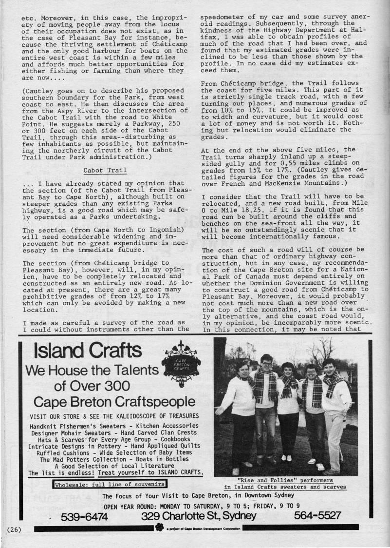etc. Moreover, in this case, the impropri? ety of moving people away from the locus of their occupation does not exist, as in the case of Pleasant Bay for instance, be? cause the thriving settlement of Cheticamp and the only good harbour for boats on the entire west coast is within a few miles and affords much better opportunities for either fishing or farming than where they are now.... (Cautley goes on to describe his proposed southern boundary for the Park, from west coast to east. He then discusses the area from the Aspy River to the intersection of the Cabot Trail with the road to White Point. He suggests merely a Parkway, 250 or 300 feet on each side of the Cabot Trail, through this area--disturbing as few inhabitants as possible, but maintain? ing the northerly circuit of the Cabot Trail under Park administration.) Cabot Trail ... I have already stated my opinion that the section (of the Cabot Trail from Pleas? ant Bay to Cape North), although built on steeper grades than any existing Parks highway, is a good road which may be safe? ly operated as a Parks undertaking. The section (from Cape North to Ingonish) will need considerable widening and im? provement but no great expenditure is nec? essary in the immediate future. The section (from Cheticamp bridge to Pleasant Bay), however, will, in my opin? ion, have to be completely relocated and constructed as an entirely new road. As lo? cated at present, there are a great many prohibitive grades of from 127o to l77o which can only be avoided by making a new location. I made as careful a survey of the road as I could without instruments other than the speedometer of my car and some survey aner? oid readings. Subsequently, through the kindness of the Highway Department at Hal? ifax, I was able to obtain profiles of much of the road that I had been over, and found that my estimated grades were in? clined to be less than those shown by the profile. In no case did my estimates ex? ceed them. From Cheticamp bridge, the Trail follows the coast for five miles. This part of it is strictly single track road, with a few turning out places, and numerous grades of from 107o to 157o. It could be improved as to width and curvature, but it would cost a lot of money and is not worth it. Noth? ing but relocation would eliminate the grades. At the end of the above five miles, the Trail tums sharply inland up a steep- sided gully and for 0,55 miles climbs on grades from 15% to 177o. (Cautley gives de? tailed figures for the grades in the road over French and MacKenzie Mountains.) I consider that the Trail will have to be relocated, and a new road built, from Mile 0 to Mile 18.25. If it is found that this road can be built around the cliffs and benches on the sea-front all the way, it will be so outstandingly scenic that it will become internationally famous. The cost of such a road will of course be more than that of ordinary highway con? struction, but in any case, my recommenda? tion of the Cape Breton site for a Nation? al Park of Canada must depend entirely on whether the Dominion Government is willing to construct a good road from Cheticamp to Pleasant Bay. Moreover, it would probably not cost much more than a new road over the top of the mountains, which is the on? ly alternative, and the coast road would, in my opinion, be incomparably more scenic. In this connection, it may be noted that Island Crafts We House the Talents ' of Over 300 Cape Breton Craftspeople VISIT OUR STORE & SEE THE KALEIDOSCOPE OF TREASURES Handknit Fishermen's Sweaters - Kitchen Accessories Designer Mohair Sweaters - Hand Carved Clan Crests Hats & Scarves-for Every Age Group - Cookbooks Intricate Designs in Pottery - Hand Appliqued Quilts Ruffled Cushions - Wide Selection of Baby Items The Mad Potters Collection - Boats in Bottles A Good Selection of Local Literature The list is endlessl Treat yourself to ISLAND CRAFTS. Iwholesale; full line of souvenirs! The Focus of Your Visit to Cape Breton, in Downtown Sydney "Rise and Follies" performers in Island Crafts sweaters and scarves OPEN YEAR ROUND: MONDAY TO SATURDAY, 9 TO 5; FRIDAY, 9 TO 9 539-6474 329 Charlotte St., Sydney 564-5527