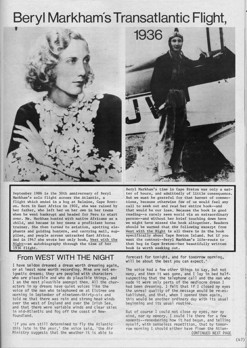 Published by Ronald Caplan on 1986/8/1 (933 reads)Beryl Markham's Transatlantic Flight, 1936 i4| September 1986 is the 50th anniversary of Beryl Markham's solo flight across the Atlantic, a flight which ended in a bog at Baleine, Cape Bret? on. Born in East Africa in 1902, she was raised by her father, who left her on her own in her teens when he went bankrupt and headed for Peru to start over. Ms. Markham hunted with native Africans as a child, and became in her teens a proficient horse trainer. She then turned to aviation, spotting ele? phants and guiding hunters, and carrying mail, sup? plies, and people across untracked East Africa. And in 1947 she wrote her only book, West with the Night • an autobiography through the time of her 1936 flight. Beryl Markham's time in Cape Breton was only a mat? ter of hours, and admittedly of little consequence. But we must be grateful for that barest of connec? tions, because otherwise few of us would feel any call to seek out and read her entire book • and that would be our loss. Because the book is good reading • a rarely seen world via an extraordinary person • and without her brief touching down here we might have missed the book altogether. Readers should be warned that the following excerpt from West with the Night is all there is in the book specifically about Cape Breton Island. But if you want the context • Beryl Markham's life-route to that bog in Cape Breton • her beautifully written book is worth seeking out. From WEST WITH THE NIGHT I have seldom dreamed a dream worth dreaming again, or at least none worth recording. Mine are not en? igmatic dreams; they are peopled with characters who are plausible and who do plausible things, and I am the most plausible amongst them. All the char? acters in my dreams have quiet voices like the voice of the man who telephoned me at Elstree one morning in September of nineteen-thirty-six and told me that there was rain and strong head winds over the west of England and over the Irish Sea, and that there were variable winds and clear skies in mid-Atlantic and fog off the coast of New? foundland. 'If you are still determined to fly the Atlantic this late in the year,' the voice said, 'the Air Ministry suggests that the weather it is able to forecast for tonight, and for tomorrow morning, will be about the best you can expect.' The voice had a few other things to say, but not many, and then it was gone, and I lay in bed half- suspecting that the telephone call and the man who made it were only parts of the mediocre dream I had been dreaming. I felt that if I closed my eyes the unreal quality of the message would be re-es? tablished, and that, when I opened them again, this would be another ordinary day with its usual beginning and its usual routine. But of course I could not close my eyes, nor my mind, nor my memory. I could lie there for a few moments--remembering how it had begun, and telling myself, with senseless repetition, that by tomor? row morning I should either have flown the Atlan- CONTINUED NEXT PAGE (47);