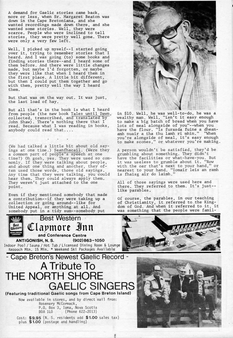 Published by Ronald Caplan on 1987/1/1 (251 reads)A demand for Gaelic stories came back, more or less, when Sr. Margaret Beaton was down in the Cape Bretoniana, and she wanted recordings made down there, and she wanted some stories • Well, they were scarce. People who were inclined to tell stories, they were pretty well gone. There were only a very few left. Well, I picked up myself--I started going over it, trying to remember stories that I heard. And I was going (to) some books and finding stories there--and I heard some of them before. And there were little changes made, but maybe I'd forgotten, or maybe they were like that when I heard them in the first place. A little bit different, but then I could put them together and go with them, pretty well the way I heard them. But that was on the. way out. It was just, the last load of hay. But all that's in the book is what I heard from people (the new book Tales until Dawn, collected, transcribed, and translated by John Shaw). There's nothing there that I read. Because what I was reading in books, anybody could read that.... (We had talked a little bit about old say? ings at one time.) Seanfhacail. (Were they a common part of people's speech at one time?) Oh gosh, yes. They were used so com? monly. If they were talking about people, and about one thing and another, they of? ten used those words, those old sayings. Any time that they were talking, you could hear them. They could always apply them. They weren't just attached to the one point. Even if they mentioned somebody that made a contribution--if they were taking up a collection or going around--like for United Appeal, or anything at all. And somebody put in a tidy sum--somebody put in $10. Well, he was well-to-do, he was a wealthy man. Well, "isn't it easy enough to make a big batch of bread when you have lots of meal alongside of you"--when you have the flour. "Is furasda fuine a dhean? amh nuair a tha thu lamh ri mhin." "When you're alongside of meal, it's easy enough to make scones," or whatever you're making. A person wouldn't be satisfied, they'd be grumbling about something. They didn't have the facilities or what-have-you. But it was useless to grumble about it. "Row with the oar that's next to your hand," or nearest to your hand. "lomair leis an ramh is fhaisg air do laimh." All of those sayings were used here and there. They referred to them. It's just-- like parables, Of course, the parables, in our teaching of Christianity, it referred to the King? dom of God. And when it referred to it, it was something that the people were famil- Best Western Clapmore ifnn and Conference Centre ANTIGONISH, N. S. (902)863-1050 Indoor Pool / Sauna / Hot Tub / Licensed Dining Room & Lounge Keppoch Mtn. 15 Min. * Weekend Ski Packages Available ~ Cape Breton's Newest Gaelic Record ~ A Tribute To THE NORTH SHORE GAELIC SINGERS (Featuring traditional Gaelic songs from Cape Breton Island) Now available in stores, and by direct mail from: Rosemary McCormack, P.O. Box 3, lona. Nova Scotia BOA ILO (Phone 622-2013) Cost: $9.95 (N. S. residents add $1.00 sales tax) plus $1.00 (postage and handling)