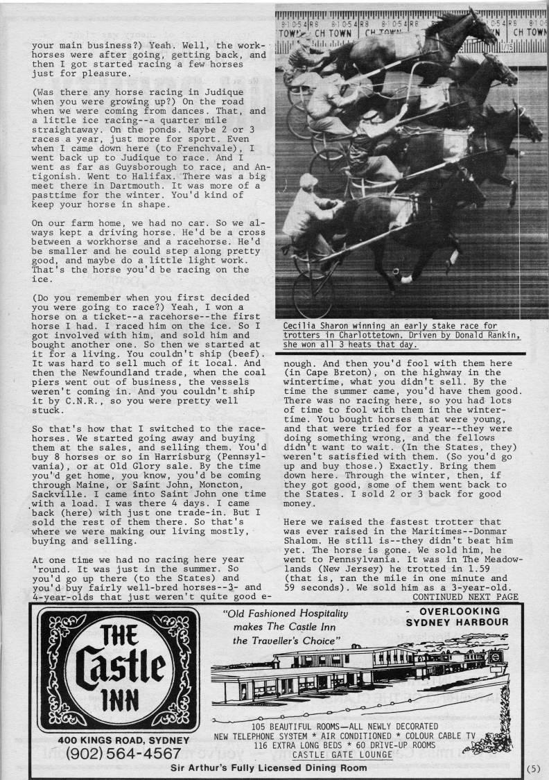 Published by Ronald Caplan on 1987/6/1 (454 reads)your main business?) Yeah. Well, the work? horses were after going, getting back, and then I got started racing a few horses just for pleasure. (Was there any horse racing in Judique when you were growing up?) On the road when we were coming from dances. That, and a little ice racing--a quarter mile straightaway. On the ponds. Maybe 2 or 3 races a year, just more for sport. Even when I came down here (to Frenchvale), 1 went back up to Judique to race. And I went as far as Guysborough to race, and An? tigonish. Went to Halifax. There was a big meet there in Dartmouth. It was more of a pasttime for the winter. You'd kind of keep your horse in shape. On our farm home, we had no car. So we al? ways kept a driving horse. He'd be a cross between a workhorse and a racehorse. He'd be smaller and he could step along pretty good, and maybe do a little light work. That's the horse you'd be racing on the ice. (Do you remember when you first decided you were going to race?) Yeah, I won a horse on a ticket--a racehorse--the first horse I had. I raced him on the ice. So I got involved with him, and sold him and bought another one. So then we started at it for a living. You couldn't ship (beef). It was hard to sell much of it local. And then the Newfoundland trade, when the coal piers went out of business, the vessels weren't coming in. And you couldn't ship it by C.N.R., so you were pretty well s tuck. So that's how that I switched to the race? horses. We started going away and buying them at the sales, and selling them. You'd buy 8 horses or so in Harrisburg (Pennsyl? vania) , or at Old Glory sale. By the time you'd get home, you know, you'd be coming through Maine, or Saint John, Moncton, Sackville. I came into Saint John one time _with a load. I was there 4 days. I came back (here) with just one trade-in. But I sold the rest of them there. So that's where we were making our living mostly, buying and selling. At one time we had no racing here year 'round. It was just in the summer. So you'd go up there (to the States) and you'd buy fairly well-bred horses--3- and 4-year-olds that just weren't quite good e- Cecilia Sharon winning an early stake race for trotters in Charlottetown. Driven by Donald Rankin, she won all 3 heats that day. nough. And then you'd fool with them here (in Cape Breton), on the highway in the wintertime, what you didn't sell. By the time the summer came, you'd have them good. There was no racing here, so you had lots of time to fool with them in the winter? time. You bought horses that were young, and that were tried for a year--they were doing something wrong, and the fellows didn't want to wait. (In the States, they) weren't satisfied with them. (So you'd go up and buy those.) Exactly. Bring them down here. Through the winter, then, if they got good, some of them went back to the States. I sold 2 or 3 back for good money. Here we raised the fastest trotter that was ever raised in the Maritimes--Donmar Shalom. He still is--they didn't beat him yet. The horse is gone. We sold him, he went to Pennsylvania. It was in The Meadow- lands (New Jersey) he trotted in 1.59 (that is, ran the mile in one minute and 59 seconds). We sold him as a 3-year-old. CONTINUED NEXT PAGE "Old Fashioned Hospitality makes The Castle Inn the Traveller's Choice" - OVERLOOKING SYDNEY HARBOUR 400 KINGS ROAD, SYDNEY 1564-4567 (902)1 teiMr; 105 BEAUTIFUL ROOMS-ALL NEWLY DECORATED NEW TELEPHONE SYSTEM * AIR CONDITIONED * COLOUR CABLE 116 EXTRA LONG BEDS * 60 DRIVE-UP ROOMS CASTLE GATE LOUNGE Sir Arthur's Fully Licensed Dining Room (5)