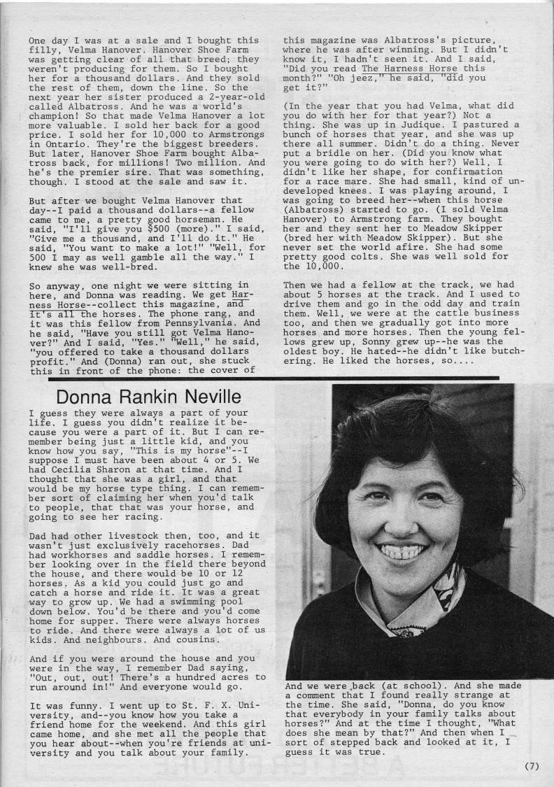 Published by Ronald Caplan on 1987/6/1 (419 reads)One day I was at a sale and I bought this filly, Velma Hanover, Hanover Shoe Farm was getting clear of all that breed; they weren't producing for them. So I bought her for a thousand dollars. And they sold the rest of them, down the line. So the next year her sister produced a 2-year-old called Albatross, And he was a world's champion! So that made Velma Hanover a lot more valuable. I sold her back for a good price. I sold her for 10,000 to Armstrongs in Ontario. They're the biggest breeders. But later, Hanover Shoe Farm bought Alba? tross back, for millions! Two million. And he's the premier sire. That was something, though. I stood at the sale and saw it. But after we bought Velma Hanover that day--I paid a thousand dollars--a fellow came to me, a pretty good horseman. He said, "I'll give you $500 (more)." I said, "Give me a thousand, and I'll do it." He said, "You want to make a lot!" "Well, for 500 I may as well gamble all the way." I knew she was well-bred. this magazine was Albatross's picture, where he was after winning. But I didn't know it, I hadn't seen it. And I said, "Did you read The Harness Horse this month?" "Oh jeez," he said, "did you get it?" (In the year that you had Velma, what did you do with her for that year?) Not a thing. She was up in Judique. I pastured a bunch of horses that year, and she was up there all summer. Didn't do a thing. Never put a bridle on her. (Did you know what you were going to do with her?) Well, I didn't like her shape, for confirmation for a race mare. She had small, kind of un? developed knees. I was playing around, I was going to breed her--when this horse (Albatross) started to go. (I sold Velma Hanover) to Armstrong farm. They bought her and they sent her to Meadow Skipper (bred her with Meadow Skipper). But she never set the world afire. She had some pretty good colts. She was well sold for the 10,000. So anjrway, one night we were sitting in here, and Donna was reading. We get Har? ness Horse--collect this magazine, and it's all the horses. The phone rang, and it was this fellow from Pennsylvania. And he said, "Have you still got Velma Hano? ver?" And I said, "Yes." "Well," he said, "you offered to take a thousand dollars profit." And (Donna) ran out, she stuck this in front of the phone: the cover of Then we had a fellow at the track, we had about 5 horses at the track. And I used to drive them and go in the odd day and train them. Well, we were at the cattle business too, and then we gradually got into more horses and more horses. Then the young fel? lows grew up. Sonny grew up--he was the oldest boy. He hated--he didn't like butch? ering. He liked the horses, so,... Donna Rankin Neville I guess they were always a part of your life. I guess you didn't realize it be? cause you were a part of it. But I can re? member being just a little kid, and you know how you say, "This is my horse"--I suppose I must have been about 4 or 5. We had Cecilia Sharon at that time. And I thought that she was a girl, and that would be my horse type thing. I can remem? ber sort of claiming her when you'd talk to people, that that was your horse, and going to see her racing. Dad had other livestock then, too, and it wasn't just exclusively racehorses. Dad had workhorses and saddle horses. I remem? ber looking over in the field there beyond the house, and there would be 10 or 12 horses. As a kid you could just go and catch a horse and ride it. It was a great way to grow up. We had a swimming pool down below. You'd be there and you'd come home for supper. There were always horses to ride. And there were always a lot of us kids. And neighbours. And cousins. And if you were around the house and you were in the way, I remember Dad saying, "Out, out, out! There's a hundred acres to run around in!" And everyone would go. It was funny. I went up to St. F. X. Uni? versity, and--you know how you take a friend home for the weekend. And this girl came home, and she met all the people that you hear about--when you're friends at uni? versity and you talk about your family. And we were ,back (at school). And she made a comment that I found really strange at the time. She said, "Donna, do you know that everybody in your family talks about horses?" And at the time I thought, "What does she mean by that?" And then when I sort of stepped back and looked at it, I guess it was true. (7)