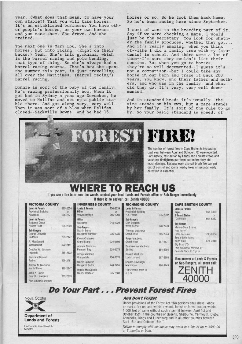 year. (What does that mean, to have your own stable?) That you will take horses. It's an established business. You have oth? er people's horses, or your own horses, and you race them. She drove. And she trained. The next one is Mary Lou. She's into horses, but into riding. (Right on their backs.) Yeah. She's into gymkhana, which is the barrel racing and pole bending, that type of thing. So she's always had a barrel-racing course. That's how she spent the summer this year, is just travelling all over the Maritimes. (Barrel racing?) Barrel racing. Donnie is sort of the baby of the family. He's racing professionally now. When it got bad in Sydney a year ago November, he moved to Halifax and set up a public sta? ble there. And got along very, very well. Then it was sort of a blow when Halifax closed--Sackville Downs, And he had 16 horses or so. So he took them back home. So he's been racing here since September. I sort of went to the breeding part of it. Say if we were checking a mare, I would just be the secretary. You look for wheth? er the family produces, whether they go.... And it's really amazing, when you think of--like I did a family tree with my (stu? dents) in school. And there were a lot of them--I'm sure they couldn't list their cousins. But when you go to horses, they're so well documented--I guess it's not a comparison--but I could take any horse in our barn and trace it back 200 years. You know, who their father and moth? ers, and who was in the family, and what did they do. It's very, very well docu? mented. And in standard breds it's usually--the sire stands on his own, but a mare stands by her family. It's sort of the rule to go by. So your basic standard is speed, of 0m. ''.' '1#' FIIU]!! The number of forest fires in Cape Breton is increasing. Last year between April and October, 72 were reported. FoiLinately, fast action by Lands and Forests crews and volunteer firefighters put them out before they did much damage. Because even a small brush fire can get out of control and ignite nearby trees in seconds, early detection is essential. WHERE TO REACH US If you see a fire in or near the woods, contact your local Lands and Forests office or Sub-Ranger immediately. If there is no answer, call Zenith 40000, VICTORIA COUNTY Lands & Forests Provincial Building *Baddeck Lands & Forests Baddeck Depot *Shore Road Sub-Rangers George Cheverie Baddeck R. MacDonald Washabuckt Douglas W. Jackson Ingonish Jack MacDonald Tarbot Allister N. Maclnnis North Shore John A. Curtis Bay St. Lawrence *for Industrial Permits 295-2554 or 295-2771 295-2300 295-2177 622-2441 285-2502 929-2781 929-2347 383-2293 Do Vol Nova Scotia '?C Department of Lands and Forests Honourable Ken Streatch M nister INVERNESS Lands & Forests Office Whycocomagh Office Margaree Sub-Rangers Martin Burns Margaree Harbour Clovis Chaisson Grand Etang Andrew Timmons Pleasant Bay Kenny Maclnnis Orangedale Martin Cameron Margaree Forks Harold MacDonald Mabou Harbour irPaii RICHMOND COUNTY Lands & Forests Provincial Building *St. Peters 53 Sub-Rangers Glen Diggdon West Arichat 22 Thomas Matthews Grand Anse 34 Roger MacLeod Grand River 58 Dan Norman MacLeod Stirling 88 Donald MacLeod Loch Lomond 58 Charles Cavanagh Martinique 22 * for Permits Prior to 5 p.m. CAPE BRETON COUNTY Lands & Forests Depot 564-6389 & Forest Station or 'Coxheath 564-8387 Sub-Ranger Main-a-Dleu & area: Roy Perry Little Lorraine 733-2664 Boularderie Island Keith Bain 674-2040 Big Bras d'Or *for Industrial Permits or Permits Prior to 5 p.m. If no answer at Lands & Forests or Sub-Rangers, all areas call: ZENITH 40000 . Prevent Forest Fires And Don't Forget Under provisions of the Forest Act "No persons shall make, kindle or start a fire on land within a wood, forest or forest area or within 1,000 feet of same without such a permit between April 1st and October 15th in the counties of Queens, Shelburne, Yarmouth, Digby, Annapolis, Kings and Lunenburg and in all other counties between April 15th and October 15th." Failure to comply with tlie above may result in a fine of up to $500.00 or 6 monttis or botfi.