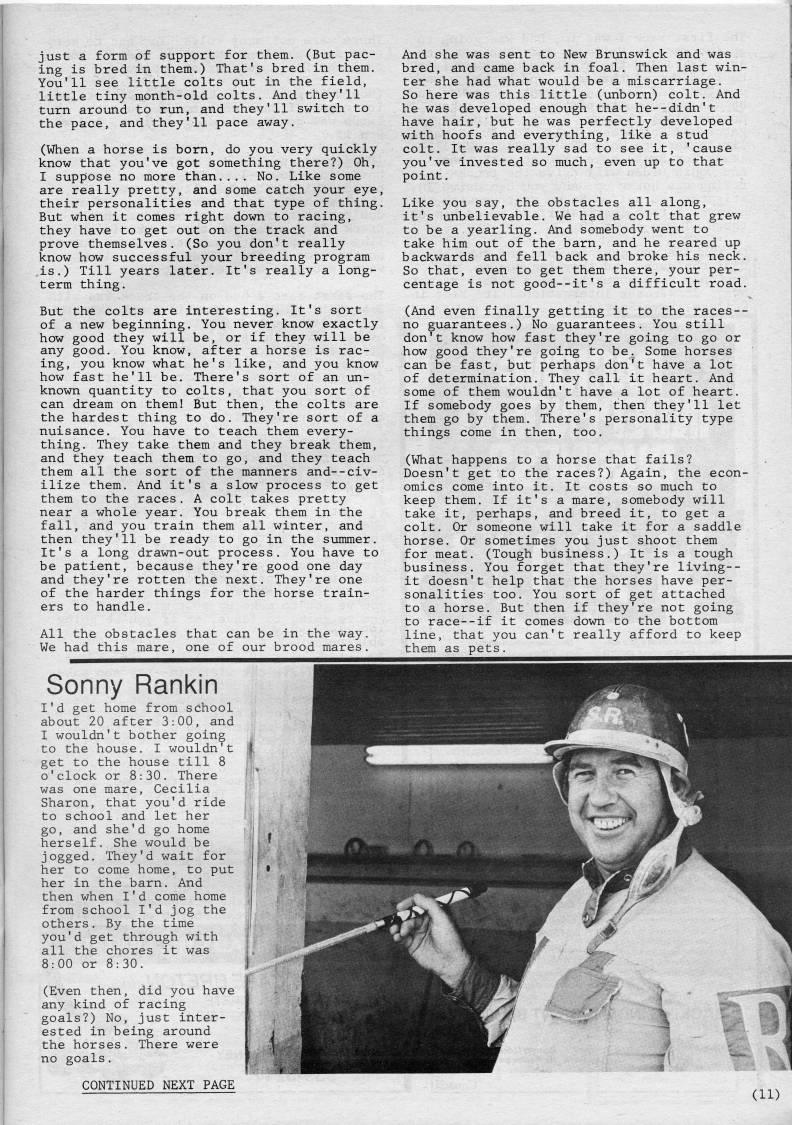 just a form of support for them. (But pac? ing is bred in them.) That's bred in them. You'll see little colts out in the field, little tiny month-old colts. And they'll turn around to run, and they'll switch to the pace, and they'll pace away. (When a horse is born, do you very quickly know that you've got something there?) Oh, I suppose no more than.... No. Like some are really pretty, and some catch your eye, their personalities and that type of thing. But when it comes right down to racing, they have to get out on the track and prove themselves. (So you don't really know how successful your breeding program is.) Till years later. It's really a long- term thing. But the colts are interesting. It's sort of a new beginning. You never know exactly how good they will be, or if they will be any good. You know, after a horse is rac? ing, you know what he's like, and you know how fast he'll be. There's sort of an un? known quantity to colts, that you sort of can dream on them! But then, the colts are the hardest thing to do. They're sort of a nuisance. You have to teach them every? thing. They take them and they break them, and they teach them to go, and they teach them all the sort of the manners and--civ? ilize them. And it's a slow process to get them to the races. A colt takes pretty near a whole year. You break them in the fall, and you train them all winter, and then they'll be ready to go in the summer. It's a long drawn-out process. You have to be patient, because they're good one day and they're rotten the next. They're one of the harder things for the horse train? ers to handle. All the obstacles that can be in the way. We had this mare, one of our brood mares. And she was sent to New Brimswick and was bred, and came back in foal. Then last win? ter she had what would be a miscarriage. So here was this little (unborn) colt. And he was developed enough that he--didn't have hair, but he was perfectly developed with hoofs and everything, like a stud colt. It was really sad to see it, 'cause you've invested so much, even up to that point. Like you say, the obstacles all along, it's unbelievable. We had a colt that grew to be a yearling. And somebody went to take him out of the barn, and he reared up backwards and fell back and broke his neck. So that, even to get them there, your per? centage is not good--it's a difficult road. (And even finally getting it to the races-- no guarantees.) No guarantees. You still don't know how fast they're going to go or how good they're going to be. Some horses can be fast, but perhaps don't have a lot of determination. They call it heart. And some of them wouldn't have a lot of heart. If somebody goes by them, then they'll let them go by them. There's personality type things come in then, too. (What happens to a horse that fails? Doesn't get to the races?) Again, the econ? omics come into it. It costs so much to keep them. If it's a mare, somebody will take it, perhaps, and breed it, to get a colt. Or someone will take it for a saddle horse. Or sometimes you just shoot them for meat. (Tough business.) It is a tough business. You forget that they're living-- it doesn't help that the horses have per? sonalities too. You sort of get attached to a horse. But then if they're not going to race--if it comes down to the bottom line, that you can't really afford to keep them as pets. ''' Sonny Rankin I'd get home from school about 20 after 3:00, and I wouldn't bother going to the house. I wouldn't get to the house till 8 o'clock or 8:30. There was one mare, Cecilia Sharon, that you'd ride to school and let her go, and she'd go home herself. She would be jogged. They'd wait for her to come home, to put her in the barn. And then when I'd come home from school I'd jog the others. By the time you'd get through with all the chores it was 8:00 or 8:30. (Even then, did you have any kind of racing goals?) No, just inter? ested in being around the horses. There were no goals. CONTINUED NEXT PAGE (11)