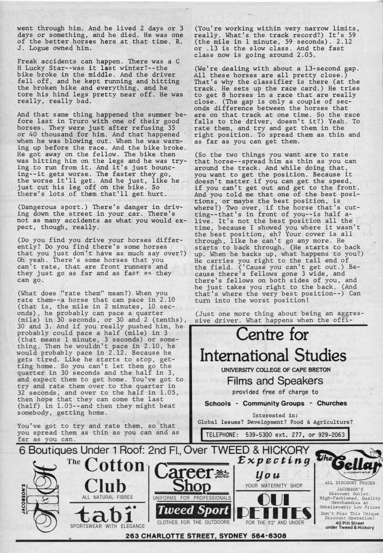 went through him. And he lived 2 days or 3 days or something, and he died. He was one of the better horses here at that time. R. J. Logue owned him. Freak accidents can happen. There was a C H Lucky Star--was it last winter?--the bike broke in the middle. And the driver fell off, and he kept running and hitting the broken bike and everything, and he tore his hind legs pretty near off. He was really, really bad. And that same thing happened the summer be? fore last in Truro with one of their good horses. They were just after refusing 35 or 40 thousand for him. And that happened when he was blowing out. When he was warm? ing up before the race. And the bike broke. He got away on the fellow. The bike then was hitting him on the legs and he was try? ing to run from it. And it's just bounc- ing--it gets worse. The faster they go, the worse it'll get. And he just, like he just cut his leg off on the bike. So there's lots of them that'll get hurt. (Dangerous sport.) There's danger in driv? ing down the street in your car. There's not as many accidents as what you would ex? pect, though, really. (Do you find you drive your horses differ? ently? Do you find there's some horses that you just don't have as much say over?) Oh yeah. There's some horses that you can't rate, that are front runners and they just go as far and as fast as they can go. (What does "rate them" mean?) When you rate them--a horse that can pace in 2.10 (that is, the mile in 2 minutes, 10 sec? onds) , he probably can pace a quarter (mile) in 30 seconds, or 30 and 2 (tenths), 30 and 3. And if you really pushed him, he probably could pace a half (mile) in 3 (that means 1 minute, 3 seconds) or some? thing. Then he wouldn't pace in 2.10, he would probably pace in 2.12. Because he gets tired. Like he starts to stop, get? ting home. So you can't let them go the quarter in 30 seconds and the half in 3, and expect them to get home. You've got to try and rate them over to the quarter in 32 seconds, and over to the half in 1.05, then hope that they can come the last (half) in 1.05--and then they might beat somebody, getting home. You've got to try and rate them, so that you spread them as thin as you can and as far as you can. (You're working within very narrow limits, really. What's the track record?) It's 59 (the mile in 1 minute, 59 seconds). 2.12 or .13 is the slow class. And the fast class now is going around 2.05. (We're dealing with about a 13-second gap. All these horses are all pretty close.) That's why the classifier is there (at the track. He sets up the race card.) He tries to get 8 horses in a race that are really close. (The gap is only a couple of sec? onds difference between the horses that are on that track at one time. So the race falls to the driver, doesn't it?) Yeah. To rate them, and try and get them in the right position. To spread them as thin and as far as you can get them. (So the two things you want are to rate that horse--spread him as thin as you can around the track. And while doing that, you want to get the position. Because it doesn't matter if you can get the speed, if you can't get out and get to the front. And you told me that one of the best posi? tions, or maybe the best position, is where?) Two over, if the horse that's cut- ting--that's in front of you--is half a- live. It's not the best position all the time, because I showed you where it wasn't the best position, eh? Your cover is all through, like he can't go any more. He starts to back through. (He starts to back up. When he backs up, what happens to you?) He carries you right to the tail end of the field. ('Cause you can't get out.) Be? cause there's fellows gone 3 wide, and there's fellows on both sides of you, and he just takes you right to the back. (And that's where the very best position--) Can turn into the worst position! (Just one more thing about being an aggres? sive driver. What happens when the offi- Centre for International Studies UNIVERSITY COLLEGE OF CAPE BRETON Films and Speakers provided free of charge to Schools - Community Groups - Churches Interested in: Global Issues? Development? Food & Agriculture? [ TELEPHONE: 539-5300 ext. 277, or 929-2063 6 Boutiques Under 1 Roof: 2nd FL, Over TWEED & HICKORY ""-Cotton, ro'''''. ,sx''..t??g YOUR MATERNITY SHOP Club ALL NATURAL FIBRES SPORTSWEAR WITH ELEGANCE Career Shoo UNIFORMS FOR PROFESSIONALS Tweed Sport] CLOTHES FOR THE OUTDOORS • IJI CTITES FOR THE 5'2" AND UNDER ALL DISCOUNT PRICES JACOBSON'S Discount Outlet: High-Fashioned, Quality Merchandise at Unbelievably Low Prices Don't Miss This Unique Discount Operation! 40 Pitt Street under Tweed & Hickory 263 CHARLOTTE STREET. SYDNEY 564-6308