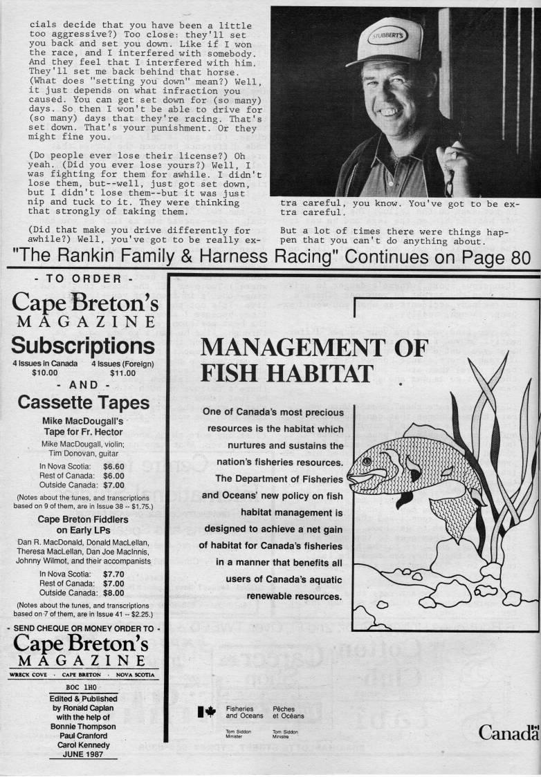 cials decide that you have been a little too aggressive?) Too close: they'll set you back and set you down. Like if I won the race, and I interfered with somebody. And they feel that I interfered with him. They'll set me back behind that horse. (What does "setting you down" mean?) Well, it just depends on what infraction you caused. You can get set down for (so many) days. So then I won't be able to drive for (so many) days that they're racing. That's set down. That's your punishment. Or they might fine you. (Do people ever lose their license?) Oh yeah. (Did you ever lose yours?) Well, I was fighting for them for awhile. I didn't lose them, but--well, just got set down, but I didn't lose them--but it was just nip and tuck to it. They were thinking that strongly of taking them. (Did that make you drive differently for awhile?) Well, you've got to be really ex? tra careful, you know. You've got to be ex? tra careful. But a lot of times there were things hap? pen that you can't do anything about. "The Rankin Family & Harness Racing" Continues on Page 80 - TO ORDER - Cape Breton's MAGAZINE Subscriptions 4 Issues in Canada 4 Issues (Foreign) $10.00 $11.00 - AND - Cassette Tapes Mike MacDougall's Tape for Fr. Hector Mike MacDougall, violin; Tim Donovan, guitar In Nova Scotia: $6.60 Rest of Canada: $6.00 Outside Canada: $7.00 (Notes about the tunes, and transcriptions based on 9 of tiiem, are in issue 38 -- $1.75.) Cape Breton Fiddlers on Early LPs Dan R. MacDonald, Donald MacLellan, Theresa MacLellan, Dan Joe Maclnnis, Johnny Wilmot, and their accompanists In Nova Scotia: $7.70 Rest of Canada: $7.00 Outside Canada: $8.00 (Notes about the tunes, and transcriptions based on 7 of them, are in Issue 41 -- $2.25.) - SEND CHEQUE OR MONEY ORDER TO - Cape Breton's MAGAZINE WRECK COVE • CAPE BRETON • NOVA SCOTIA BOC IHO Edited & Published by Ronald Caplan with the help of Bonnie Thompson Paul Cranford Carol Kennedy JUNE 1987 MANAGEMENT OF FISH HABITAT One of Canada's most precious resources is the habitat which nurtures and sustains the nation's fisheries resources. The Department of Fisheries and Oceans' new policy on fish habitat management is designed to achieve a net gain of habitat for Canada's fisheries in a manner that benefits all users of Canada's aquatic renewable resources. 1' Fisheries Peches and Oceans et Oceans Canada