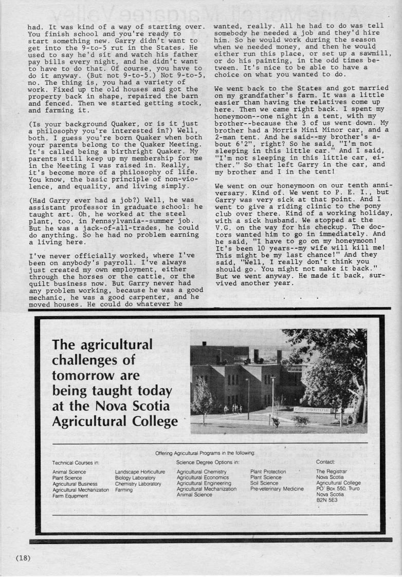 had. It was kind of a way of starting over. You finish school and you're ready to start something new. Garry didn't want to get into the 9-to-5 rut in the States. He used to say he'd sit and watch his father pay bills every night, and he didn't want to have to do that. Of course, you have to do it anyway. (But not 9-to-5.) Not 9-to-5, no. The thing is, you had a variety of work. Fixed up the old houses and got the property back in shape, repaired the barn and fenced. Then we started getting stock, and farming it. (Is your background Quaker, or is it just a philosophy you're interested in?) Well, both, I guess you're born Quaker when both your parents belong to the Quaker Meeting, It's called being a birthright Quaker, My parents still keep up my membership for me in the Meeting I was raised in. Really, it's become more of a philosophy of life. You know, the basic principle of non-vio? lence, and equality, and living simply, (Had Garry ever had a job?) Well, he was assistant professor in graduate school: he taught art. Oh, he worked at the steel plant, too, in Pennsylvania--summer job. But he was a jack-of-all-trades, he could do anything. So he had no problem earning a living here. I've never officially worked, where I've been on anybody's payroll. I've always just created my own employment, either through the horses or the cattle, or the quilt business now. But Garry never had any problem working, because he was a good mechanic, he was a good carpenter, and he moved houses. He could do whatever he wanted, really. All he had to do was tell somebody he needed a job and they'd hire him. So he would work during the season when we needed money, and then he would either run this place, or set up a sawmill, or do his painting, in the odd times be? tween. It's nice to be able to have a choice on what you wanted to do. We went back to the States and got married on my grandfather's farm. It was a little easier than having the relatives come up here. Then we came right back. I spent my honeymoon--one night in a tent, with my brother--because the 3 of us went down. My brother had a Morris Mini Minor car, and a 2-man tent. And he said--my brother's a- bout 6'2", right? So he said, "I'm not sleeping in this little car," And I said, "I'm not sleeping in this little car, ei? ther." So that left Garry in the car, and my brother and I in the tent! We went on our honeymoon on our tenth anni? versary. Kind of. We went to P. E. I., but Garry was very sick at that point. And I went to give a riding clinic to the pony club over there. Kind of a working holiday, with a sick husband. We stopped at the V.G. on the way for his checkup. The doc? tors wanted him to go in immediately. And he said, "I have to go on my honeymoon! It's been 10 years--my wife will kill me! This might be my last chance!" And they said, "Well, I really don't think you should go. You might not make it back." But we went anjrway. He made it back, sur? vived another year. The agricultural challenges of tomorrow are being taught today at the Nova Scotia Agricultural College Technical Courses in: Animal Science Plant Science Agricultural Business Agricultural Mechanization Farm Equipment Offering Agricultural Programs in the following: Science Degree Options in: Landscape Horticulture Biology Laboratory Chemistry Laboratory Farming Agricultural Chemistry Agricultural Economics Agricultural Engineering Agricultural Mechanization Animal Science Plant Protection Plant Science Soil Science Pre-veterinary Medicine Contact: The Registrar Nova Scotia Agricultural College PO' Box 550, Truro Nova Scotia B2N 5E3 (18)