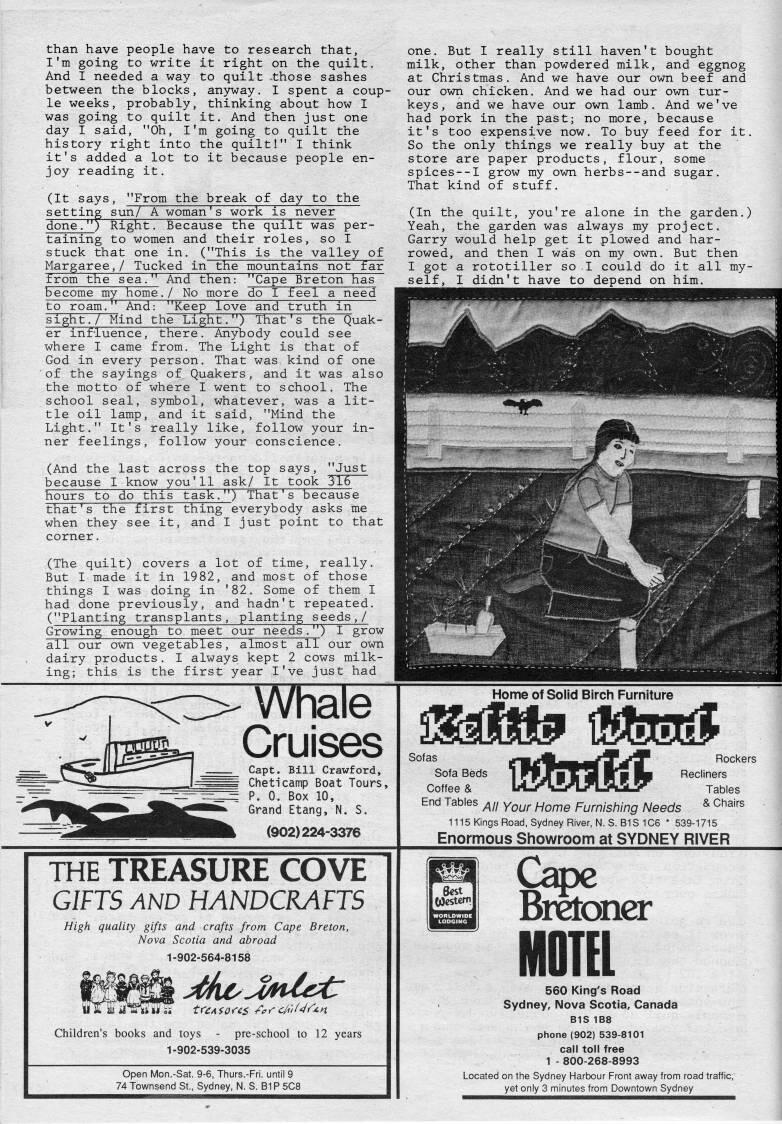 than have people have to research that, I'm going to write it right on the quilt. And I needed a way to quilt .those sashes between the blocks, an5nAray. I spent a coup? le weeks, probably, thinking about how I was going to quilt it. And then just one day I said, "Oh, I'm going to quilt the history right into the quilt!" I think it's added a lot to it because people en? joy reading it. (It says, "From the break of day to the setting sun/ A woman's work is never done."; Right. Because the quilt was per? taining to women and their roles, so I stuck that one in. ("This is the valley of Margaree,/ Tucked in the mountains not far from the sea become m' And then: "Cape Breton has home./ No more do I feel a need one. But I really still haven't bought milk, other than powdered milk, and eggnog at Christmas. And we have our own beef and our own chicken. And we had our own tur? keys , and we have our own lamb. And we've had pork in the past; no more, because it's too expensive now. To buy feed for it. So the only things we really buy at the store are paper products, flour, some spices--I grow my own herbs--and sugar. That kind of stuff, (In the quilt, you're alone in the garden.) Yeah, the garden was always my project. Garry would help get it plowed and har? rowed, and then I was on my own. But then I got a rototiller so I could do it all my? self 'Ididn/th'vetod to roam." And: "Keep love and truth in sight./"Mind the Light.") That's the Quak? er influence, there7 Anybody could see where I came from. The Light is that of God in every person. That was, kind of one of the sayings of Quakers, and it was also the motto of where I went to school. The school seal, symbol, whatever, was a lit? tle oil lamp, and it said, "Mind the Light." It's really like, follow your in? ner feelings, follow your conscience, (And the last across the top says, "Just because I know you'll ask/ It took 316 hours to do this task.") That's because that's the first thing everybody asks me when they see it, and I just point to that corner. (The quilt) covers a lot of time, really. But I made it in 1982, and most of those things I was doing in '82, Some of them I had done previously, and hadn't repeated. ("Planting transplants, planting seeds,/ Growing enough to meet our needs 7') I grow all our own vegetables, almost all our own dairy products. I always kept 2 cows milk? ing; this is the first year I've just had Whale Cruises Capt. Bill Crawford, Cheticamp Boat Tours, P. 0. Box 10, Grand Etang, N. S. (902)224-3376 Home of Solid Birch Furniture Sofas Sofa Beds Coffee & End Tables tsfesSsJ Rockers Recliners Tables & Chairs All Your Home Furnishing Needs msKingsRoad, Sydney River, N.S. B1S 1C6 * 539-1715 Enormous Showroom at SYDNEY RIVER THE TREASURE COVE GIFTS AND HANDCRAFTS High quality gifts and crafts from Cape Breton, Nova Scotia and abroad 1-902-564-8158 Children's books and toys - pre-school to 12 years 1-902-539-3035 Open Mon.-Sat. 9-6, Thurs.-Fri. until 9 74 Townsend St., Sydney, N. 8. B1P 5C8 Bretoner MOTEL 560 King's Road Sydney, Nova Scotia, Canada BIS 1B8 phone (902) 539-8101 call toll free 1 - 800-268-8993 Located on the Sydney Harbour Front away from road traffic, yet only 3 minutes from Downtown Sydney