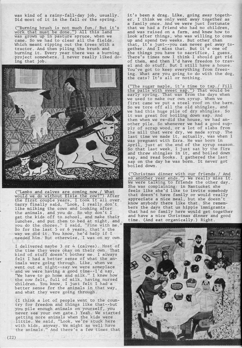 1 was kind of a rainy-fall-day job, usually. Did most of it in the fall or the spring. ("Burning brush is not much fun,/ But it's work that must be done.") All this land was grown up in pasture spruce, when we came. So we had to clear all the fields. Which meant ripping out the trees with a tractor. And then piling the brush and burning it. Every year there was a burning project somewhere, I never really liked do? ing that job. 'mi- U''b/K y''m''m'CMm'x'm in Wj MK 'm, ("Lambs and calves are coming now./ What would we do without Elsie the cow?") After the first couple years, I~took it all over Garry finally said, "Look, I really don't like milking the cows and looking after the animals, and you do. So why don't I get the kids off to school, and make their lunches, and put them to bed at night, and you do the chores," I said, "Fine with me So for the last 5 or 6 years, that's the way we did it. You know, he'd help if I needed him. But otherwise, I was on my own I delivered maybe 3 or 4 (calves), Most of the time they were okay on their own. That kind of stuff doesn't bother me. I always felt I had a better sense of what the an? imals were going through. Like, when we went out at night--say we were someplace and we were having a good time--I'd say, "We have to go home and milk." I knew how the cow felt, full of milk, having nursed children. You know, I just felt I had a better sense for the animals in that way, and what they were going through. (I think a lot of people went to the coun? try for freedom and things like that--but you pile enough animals on yourself, you never see your own gate.) Yeah. We started getting more animals when the kids were little. We said, "Look, we're stuck here with kids, an5rway. We might as well have the animals." And there's a few times that it's been a drag. Like, going away togeth? er. I think we only went away together as a family once. And we were just fortunate that we had a friend who had no children, and was raised on a farm, and knew how to look after things, who was willing to come up and spend two weeks. But other than that, it's just--you can never get away to? gether. And I miss that. But it's one of the things you have to sacrifice, I guess. There's times now I think I should get rid of them, and then I'd have freedom to trav? el and do stuff. But I still have a house. You've got to keep everything from freez? ing. What are you going to do with the dog, the cats? It's all or nothing. ("The sugar maple, it's time to tap,/ Fill the pails with sweet sap.") That would be early spring. That was from the days when we used to make our own syrup. When we first came we put a steel roof on the barn. So we tore off all the old shingles, and we had this huge pile of dry shingles. So it was great for boiling down sap. And then when we re-did the house, we had an? other pile. So whenever we had a good sup? ply of scrap wood, or a lot of slabs from the mill that were dry, we made syrup. The last time we made it, actually, was when I was pregnant with Ezra, He was born in April, just at the end of the syrup season. So that last week, I just sat by the fire and threw shingles in it, and boiled down sap, and read books. I gathered the last sap on the day he was born. It never got boiled down. ("Christmas dinner with our friends./ And so another year ends.'') We really miss it. We were talking to friends the other day. She was complaining: in Nantucket she feels like she'd like to invite somebody that doesn't have family or would really appreciate a nice meal, but she doesn't know anybody there like that. She remem? bers the days that us hippie immigrants that had no family here would get together and have a nice Christmas dinner and good time. (And eat organically.) Right. (22)
