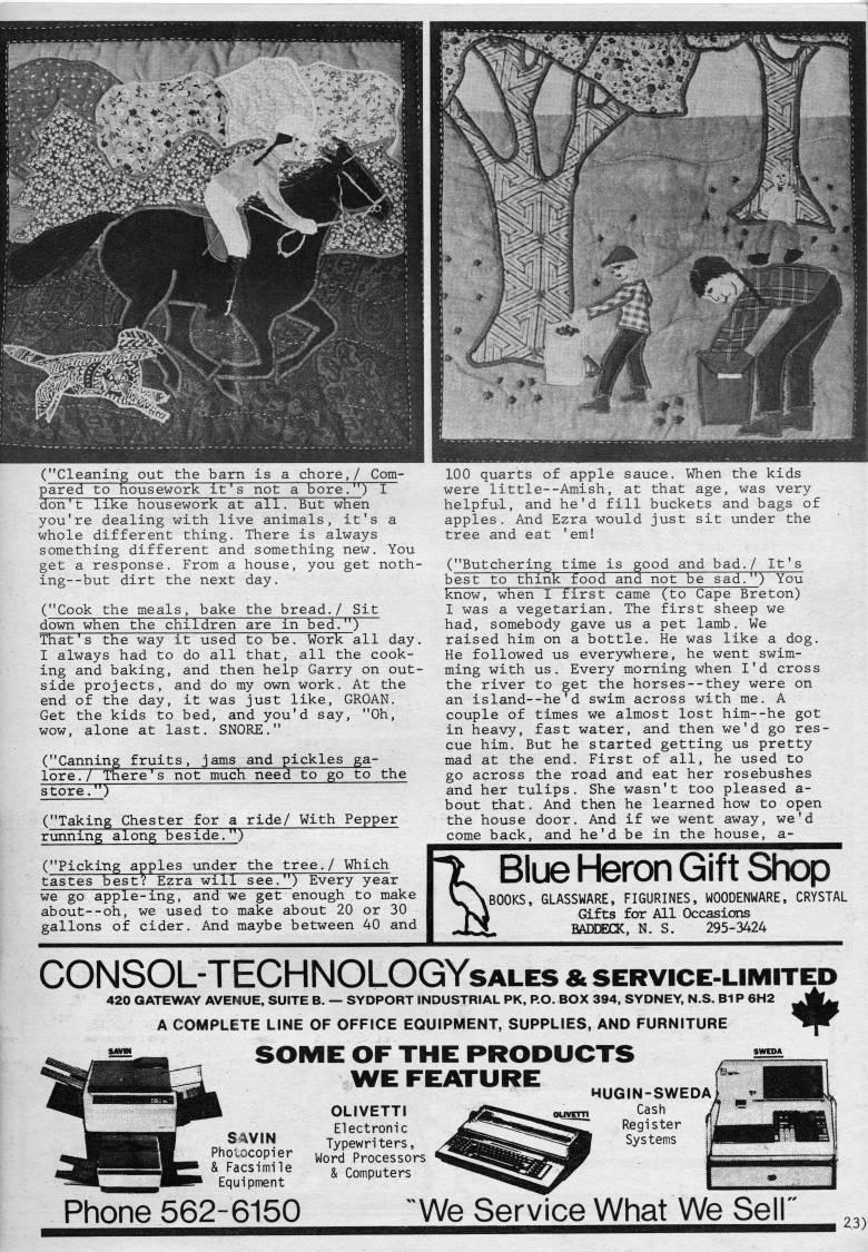 H'''ft ttfiHHI'' H' bl Wl'#i''*'''-#'J i|wft.;-lS$er;;:v': ' ?%Vil 'l''l ("Cleaning out the barn is a chore,/ Com? pared to housework it's not a bore.") I don't like housework at all. But when you're dealing with live animals, it's a whole different thing. There is always something different and something new. You get a response. From a house, you get noth? ing- -but dirt the next day. ("Cook the meals, bake the bread./Sit down when the children are in bed."") That's the way it used to be. Work all day. I always had to do all that, all the cook? ing and baking, and then help Garry on out? side projects, and do my own work. At the end of the day, it was just like, GROAN. Get the kids to bed, and you'd say, "Oh, wow, alone at last. SNORE." ("Canriing fruits, jams and pickles ga? lore./ There's not much need to go to the store. '') ("Taking Chester for a ride/ With Pepper running along beside.") ("Picking apples under the tree./ Which tastes best? Ezra will see.") Every year we go apple-ing, and we get enough to make about--oh, we used to make about 20 or 30 gallons of cider. And maybe between 40 and 100 quarts of apple sauce. When the kids were little--Amish, at that age, was very helpful, and he'd fill buckets and bags of apples. And Ezra would just sit under the tree and eat 'em! ("Butchering time is good and bad./ It's best to think food and not be sad.") You know, when I first came (to Cape Breton) I was a vegetarian. The first sheep we had, somebody gave us a pet lamb. We raised him on a bottle. He was like a dog. He followed us everywhere, he went swim? ming with us. Every morning when I'd cross the river to get the horses--they were on an island--he'd swim across with me. A couple of times we almost lost him--he got in heavy, fast water, and then we'd go res? cue him. But he started getting us pretty mad at the end. First of all, he used to go across the road and eat her rosebushes and her tulips. She wasn't too pleased a- bout that. And then he learned how to open the house door. And if we went away, we'd come back, and he'd be in the house, a- hL Blue Heron Gift Shop vTNBOOKS, GLASSWARE, FIGURINES, WOOOENWARE, CRYSTAL fw Gifts for All Occasions '_. BAMKCK, N. S. 295-3424 CONSOL-TECHNOLOGYsALEs & service-limited 420 GATEWAY AVENUE, SUITE B. • SYDPORT INDUSTRIAL PK, P.O. BOX 394, SYDNEY, N.S. B1P 6H2 A COMPLETE LINE OF OFFICE EQUIPMENT, SUPPLIES, AND FURNITURE SOME OF THE PRODUCTS WE FEATURE OLIVETTI Electronic Typewriters, Word Processors & Computers hugin-swedaI JHHL Cash A g ' -11 Phone 562-6150 'We Service What We Sell' 2.3)
