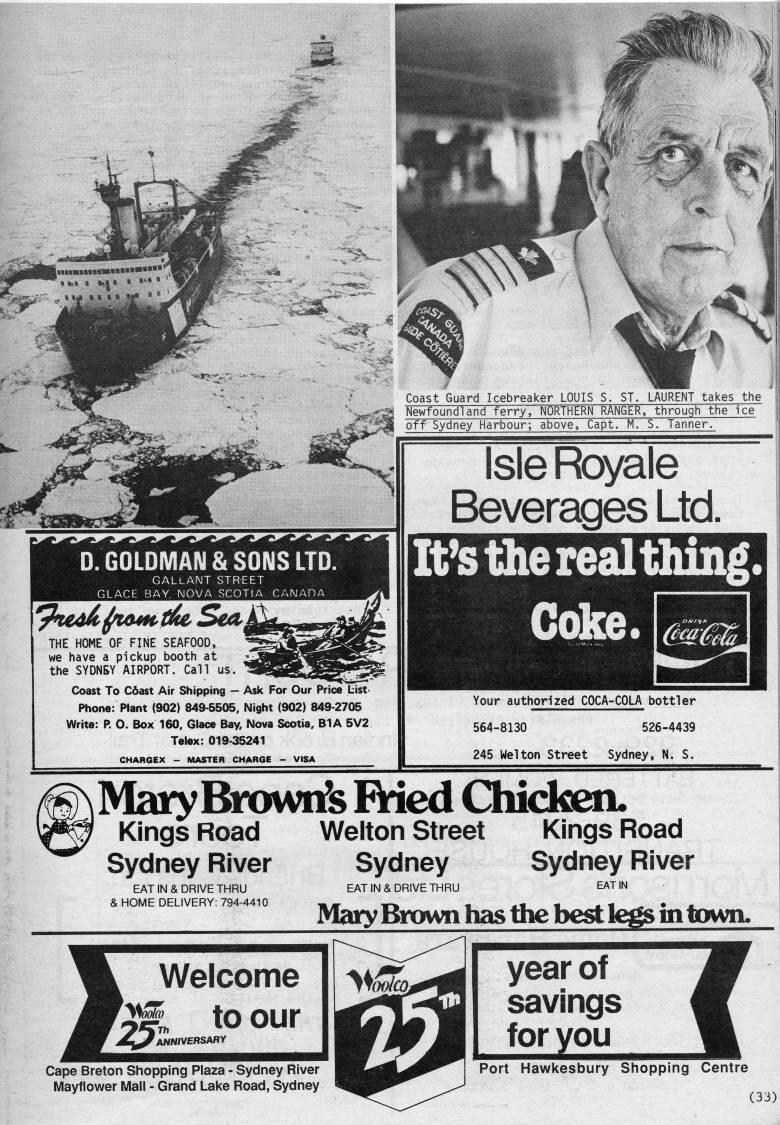 Published by Ronald Caplan on 1987/6/1 (275 reads)Coast Guard Icebreaker LOUIS S. ST. LAURENT takes the >r<"' Newfoundland ferry, NORTHERN RANGER, through the ice * *' off Sydney Harbour; above' Capt. M. S. Tanner. Isle Royale " Beverages Ltd. It's the realthmg. THE HOME OF FINE SEAFOOD, we have a pickup booth at the SYDN5Y AIRPORT. Call us. Coast To C6ast Air Shipping - Ask For Our Price llist- Phone: Plant (902) 849-5505, Night (902) 849-2705 Write: P. O. Box 160, Glace Bay, Nova Scotia, BlA 5V2 Telex: 019-35241 CHARGEX - MASTER CHARGE - VISA Cote. (SiS. Your authorized COCA-COLA bottler 564-8130 526-4439 245 Welton Street Sydney, N. S. Mairy Browifs FHed Chicken. Kings Road Welton Street Kings Road Sydney River EAT IN & DRIVE THRU & HOME DELIVERY: 794-4410 Sydney Sydney River EAT IN 8, DRIVE THRU EATIN Maify Brown has the bestirs in town. 1. WeIc JL' ANNIVERSARY Welcome to our Cape Breton Shopping Plaza - Sydney River Mayflower Mall - Grand Lake Road, Sydney year of savings for you I Port Hawkesbury Shopping Centre (33)