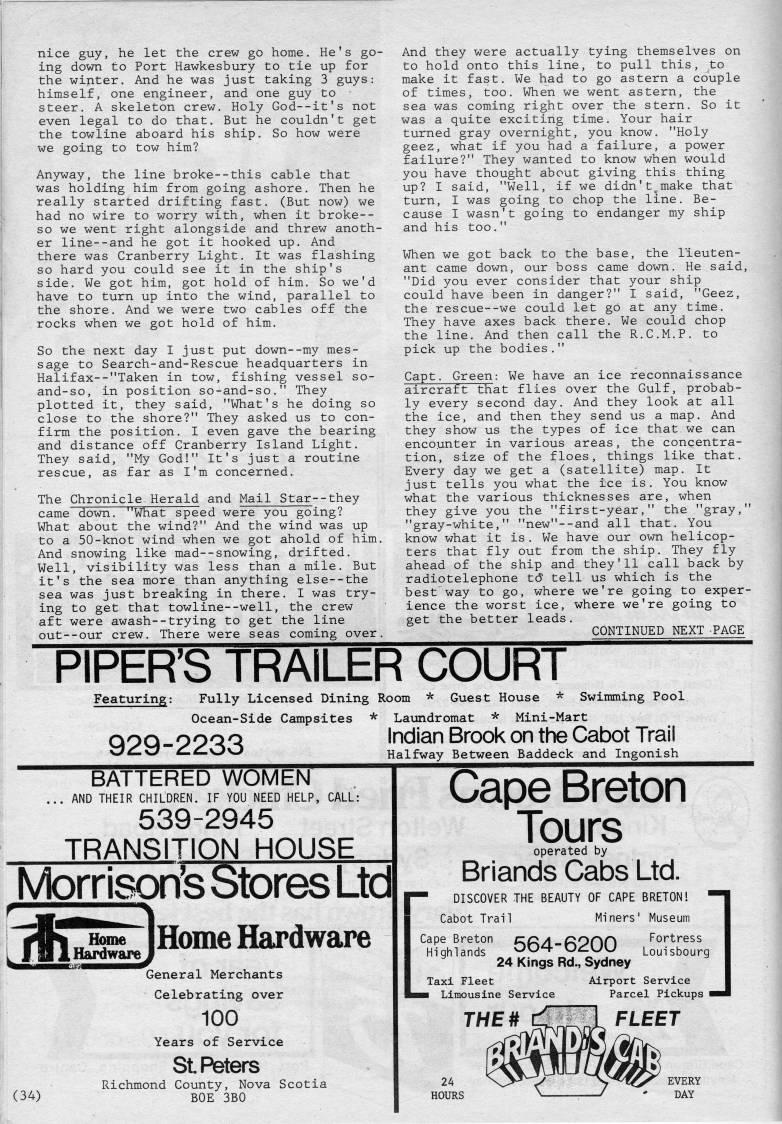Published by Ronald Caplan on 1987/6/1 (276 reads)nice guy, he let the crew go home. He's go? ing down to Port Hawkesbury to tie up for the winter. And he was just taking 3 guys: himself, one engineer, and one guy to steer. A skeleton crew. Holy God--it's not even legal to do that. But he couldn't get the towline aboard his ship. So how were we going to tow him? Anyway, the line broke--this cable that was holding him from going ashore. Then he really started drifting fast. (But now) we had no wire to worry with, when it broke-- so we went right alongside and threw anoth? er line--and he got it hooked up. And there was Cranberry Light. It was flashing so hard you could see it in the ship's side. We got him, got hold of him. So we'd have to turn up into the wind, parallel to the shore. And we were two cables off the rocks when we got hold of him. So the next day I just put down--my mes? sage to Search-and-Rescue headquarters in Halifax--"Taken in tow, fishing vessel so- and-so, in position so-and-so." They plotted it, they said, "What's he doing so close to the shore?" They asked us to con? firm the position. I even gave the bearing and distance off Cranberry Island Light. They said, "My God!" It's just a routine rescue, as far as I'm concerned. The Chronicle.Herald and Mail Star--they came down. "What speed were you going? What about the wind?" And the wind was up to a 50-knot wind when we got ahold of him. And snowing like mad--snowing, drifted. Well, visibility was less than a mile. But it's the sea more than anything else--the sea was just breaking in there. I was try? ing to get that towline--well, the crew aft were awash--trying to get the line out--our crew. There were seas coming over. And they were actually tying themselves on to hold onto this line, to pull this, to make it fast. We had to go astern a couple of times, too. When we went astern, the sea was coming right over the stern. So it was a quite exciting time. Your hair turned gray overnight, you know. "Holy geez, what if you had a failure, a power failure?" They wanted to know when would you have thought about giving this thing up? I said, "Well, if we didn't'make that turn, I was going to chop the line. Be? cause I wasn't going to endanger my ship and his too." When we got back to the base, the lieuten? ant came down, our boss came down. He said, "Did you ever consider that your ship could have been in danger?" I said, "Geez, the rescue--we could let go at any time. They have axes back there. We could chop the line. And then call the R.C.M.P. to pick up the bodies." Capt. Green: We have an ice reconnaissance aircraft that flies over the Gulf, probab? ly every second day. And they look at all the ice, and then they send us a map. And they show us the types of ice that we can encounter in various areas, the concentra? tion, size of the floes, things like that. Every day we get a (satellite) map. It just tells you what the ice is. You know what the various thicknesses are, when they give you the "first-year," the "gray," "gray-white," "new"--and all that. You know what it is. We have our own helicop? ters that fly out from the ship. They fly ahead of the ship and they'll call back by radiotelephone td tell us which is the best way to go, where we're going to exper? ience the worst ice, where we're going to get the better leads. CONTINUED NEXT -PAGE PIPER'S TRAILER COURT Featuring: Fully Licensed Dining Room * Guest House * Swimming Pool Ocean-Side Campsites * Laundromat * Mini-Mart 929-2233 Indian Brook on the Cabot Trail ''' ''OvJ Halfway Between Baddeck and Ingonish BATTERED WOMEN AND THEIR CHILDREN. IF YOU NEED HELP, CALL: 539-2945 TRANSITION HOUSE Morrison' Stores Ltc Home iHome Hardware Hardware r General Merchants Celebrating over 100 Years of Service St Peters Richmond County, Nova Scotia BOE 3B0 (34) Cape Breton Tours operated by Briands Cabs Ltd. DISCOVER THE BEAUTY OF CAPE BRETON! Cabot Trail Miners' Museum bri [?? DISCOV Cabot Tr: Cape Breton Highlands Taxi Fleet ?? Limousin 564-6200 24 Kings Rd., Sydney Taxi Fleet Airport Service Limousine Service Parcel Pickups BRETON! "Tj Museum I Fortress I Louisbourg I Service I d Pickups • • THE# 24 HOURS