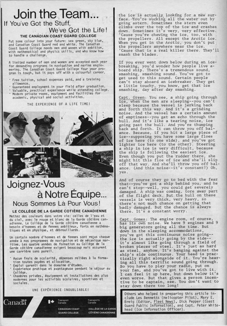 Published by Ronald Caplan on 1987/6/1 (268 reads)Join the Team... If You've Got the Stuff, We've Got the Life! THE CANADIAN COAST GUARD COLLEGE Put some colour into your future: sea green, sky blue, and Canadian Coast Guard red and white. The Canadian Coast Guard College needs men and women with ambition, with mathematical and physics skills, and who know how to handle a challenge. A limited number of men and women are accepted each year for demanding programs in navigation and'marine engin? eering. The Canadian Coast Guard College four year pro? gram is tough, but it pays off with a colourful career. • Free tuition, school expenses paid, and a training allowance. • Guaranteed employment in your field after graduation. • Valuable, practical experience while attending college. • Modern private rooms, equipment and facilities for academic, physical and social activities. THE EXPERIENCE OF A LIFE TIME! Joignez-Vous a Notre Equipe... Nous Sommes La Pour Vous! LE COLLEGE DE LA GARDE COTIERE CANADIENNE Mettez des couleurs dans votre vie: celles de I'eau et du ciel, avec le rouge et blanc de la Garde co-tiere can? adienne. Le College de la Garde cotiere canadienne a besoin d'hommes et de femmes ambitieux, forts en mathema- tiques et en physique, et d'brouillards. Un certain nombre d'hommes et de femmes sont re'us chaque annee a nos programmes de navigation et de mecanique mar? itime. Les quatre annees de formation au College de la Garde cotiere canadienne exigent beaucoup mais assurent une carriere sans pareil. * Aucun frais de scolarite, depenses reliees a la forma? tion toutes payees et allocation. * Emploi garanti dans le domaine d'etudes. • Experience pratique et avantageuse pendant le sejour au College. • Chambres privees, equipement et installations des plus modernes pour les activites scolaires, sportives et sociales. UNE EXPERIENCE INOUBLIABLE! the ice'is actually looking for a new sur? face. You're sucking all the water out by going astern. Sometimes the stern even climbs over the top of the ice and crashes down. Sometimes it's very, very effective. 'Cause you're chewing the ice, too, with the propellers. All except the Arctic ice. When you get in the Arctic, you don't put the propellers anywhere near the ice. 'Cause that is a real killer there. They'll smash the blades. If you ever went down below during an ice? breaking, you'd wonder how people live a- board ship. There's a tremendous sound, smashing, smashing sound. You've got to get used to this sound. Certain people can't stay aboard an icebreaker. They get a little touchy, you know, get that ice smashing, day after day smashing. Capt. Green: You see, a ship going through ice, when the men are sleeping--you can't sleep because the vessel is jerking back and forth this way. And it's a grinding noise. And the vessel has a certain amount of emptiness--you get an echo through the hull. And it's like a tearing noise, ice going past the hull. And you're thumping back and forth. It can throw you off bal? ance. Because, if you hit a large piece of ice--supposing you have some large floes of ice here (to one side), and you've got lighter ice here (to the other). Steering a ship in ice is very difficult, because the ship is following the easiest ice. Even though you put the'rudder there, she might hit this floe of ice and she'll slip off that way. And she'll throw you off bal? ance. (And this noise--it's constant?) Oh, yes . And of course they go to bed with the fear that--you've got a ship behind you, and he can't stop--well, you could get severely damaged. A ship was coming, tore away part of the flight deck. But the hull on these vessels is very thick, very heavy, so there's not much chance on getting that badly damaged. But the chance is always there. It's a constant worry. Capt. Gomes: The engine room, of course, has its own noise. We have 9 engines and 9 big generators going all the time. But down in the sleeping accommodations, you've got this continuous noise going-- the ice is actually going by the side-- it's almost like going through a field of broken pieces of steel. It's just as hard as steel, anyhow. It's banging against the ship's side continuous. Your head is prac? tically right alongside of it. You're hear? ing all this terrific sound going through. So you have to play your radio, put on your fan, and you've got to live with it. I can feel it up here, but down below it's even worse. But that gives a person incen? tive to be captain, see. You don't want to stay down there too long! Others who helped in preparing this article in? clude Les Bennetts (Helicopter Pilot), Mary E. Breig (Editor, Fleet News), Dick Pepper (Coast Guard Public Information), and Capt. Peter White? head (Ice Information Officer).