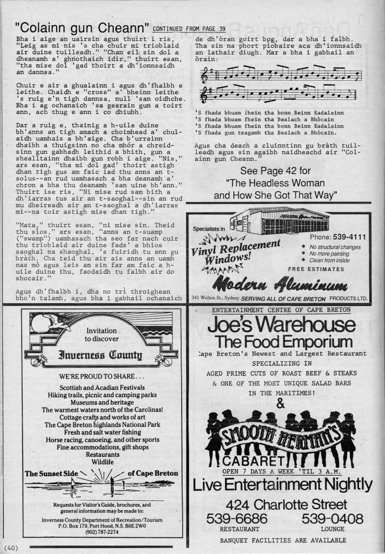 Published by Ronald Caplan on 1987/6/1 (377 reads)Colainn gun Cheann continued from page 39 Bha i aige an uairsin agus thuirt i ris, "Leig as mi nis 's cha chuir mi trioblaid air duine tuilleadh." "Chan eil sin dol a dheanamh a' ghriothaich idir," thuirt esan, "tha mise dol 'gad thoirt a dh'ionnsaidh an dannsa." Chuir e air a ghualainn i agus dh'fhalbh e leithe. Chaidh e "cross" a' bheinn leithe 's ruig e'n tigh dannsa, null 'san oidhche. Bha i ag ochanaich 'sa gearain gun a toirt ann, ach thug e ann i co dhiubh. Dar a ruig e, thainig a h-uile duine bh'anns an tigh amach a choimhead a' chul- aidh uamhais a bh'aige. Cha b'urrainn dhaibh a thuigsinn no cha mhor a chreid- sinn gun gabhadh leithid a bhith, gun a shealltainn dhaibh gun robh i aige. "Nis," ars esan, "tha mi dol gad' thoirt astigh dhan tigh gus am faic iad thu anns an t- solus--an rud uamhasach a bha deanamh a' chron a bha thu deanamh 'san uine bh'ann." Thuirt ise ris, "Ni mise rud sam bith a dh'iarras tus air an t-saoghal--sin an rud mu dheireadh air an t-saoghal a dh'iarras mi--na toir astigh mise dhan tigh." "Mata'," thuirt esan, "ni mise sin. Theid thu sios," ars esan, "anns an t-suamp ("swamp") uamhasach tha seo far nach cuir thu trioblaid air duine fads' a bhios saoghal na shaoghal, 's fuiridh tu ann gu brath. Cha teid thu air ais anns an uamh nas mo agus leis an sin far am faic a h- uile duine thu, faodaidh tu falbh air do shocair." Agus dh'fhalbh i, dha no tri throighean bho'n talamh, agus bha i gabhail ochanaich de dh'oran goirt bog, dar a bha i falbh. Tha sin na phort piobaire aca dh'ionnsaidh an lathair diugh. Mar a bha i gabhail an orain: 'S fhada bhuam fhein tha bonn Beinn Eadalainn 'S fhada bhuam fhein tha Bealach a Bhocain 'S fhada bhuam fhein tha bonn Beinn Eadalainn 'S fhada gun teagamh tha Bealach a Bhocain. Agus cha deach a cluinntinn gu brath tuil? leadh agus sin agaibh naidheachd air "Col? ainn gun Cheann." See Page 42 for "The Headless Woman and How She Got That Way" Specialists in _______ ''A''W''''" "'"-"??y''' Phone: 539-4111 f/' • I' H-eol'CCIt'''*' ?? • No structural changes ytny* -*j .,cf • No more painting "fyiriaOW • ? • Clean from inside >:''yA'sf>V """'' ESTIMATES 341 Welton St., Sydney SERVING ALL OF CAPE BRETON PRODUCTS LTD. WE'RE PROUD TO SHARE... Scottish and Acadian Festivals Hiking trails, picnic and camping parks Museums and heritage The warmest waters north of the Carolinas! Cottage crafts and works of art The C;ape Breton fiighlands National Park Fresh and salt water fishing Horse racing, canoeing, and other sports Fine accommodations, gift shops Restaurants Wildlife The Sunset Side ' I / '' of Cape Breton Requests for Visitor's Guide, brochures, and general information may be made to: Inverness County Department of Recreation/Tourism P.O. Box 179, Port Hood, N.S. BOE 2W0 (902)787-2274 ENTERTAINMENT CENTRE OF CAPE BRETON Joe's Vfeirehouse The Food Emporium ]ape Breton's Newest and Largest Restaurant SPECIALIZING IN AGED PRIME CUTS OF ROAST BEEF & STEAKS & ONE OF THE MOST UNIQUE SALAD BARS IN THE MARITIMES! OPEN 7 DAYS A WEEK 'TIL 3 A.M. Live Entertainment Nightly 424 Charlotte Street 539-6686 539-0408 RESTAURANT LOUNGE (40) BANQUET FACILITIES ARE AVAILABLE