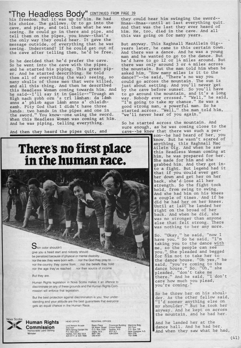 Published by Ronald Caplan on 1987/6/1 (377 reads)The Headless Body continued from page 39 his freedom. But it was up to him But it was up to him. He had his choice. The gallows. Or to go into the cave, and pipe, and tell them what he was seeing. He could go in there and pipe, and tell them on the pipes, you know--that's the only way they could hear. It gave the message outside, of everything that he was seeing. Understand? If he could get out of the cave after telling them, he'd be free. So he decided that he'd prefer the cave. So he went into the cave with the pipes, and he started his piping. This great pip? er. And he started describing. He told them all of everything (he was) seeing, so many skulls of those men that were killed, and all this thing. And then he described this Headless Woman coming towards him. And he said--I'll say it in Gaelic--"Truagh an Righ nach robh orm 's tri lamhan: da lamh anns a' phiob agus lamh anns a' chlaidh- eamh. Pity God that I didn't have three hands: two hands in the pipes and one in the sword." You know--one using the sword. When this Headless Woman was coming at him. And he was piping, telling everything. And then they heard the pipes quit, and There s no first place in the human race. give you a head start and nobody shou.