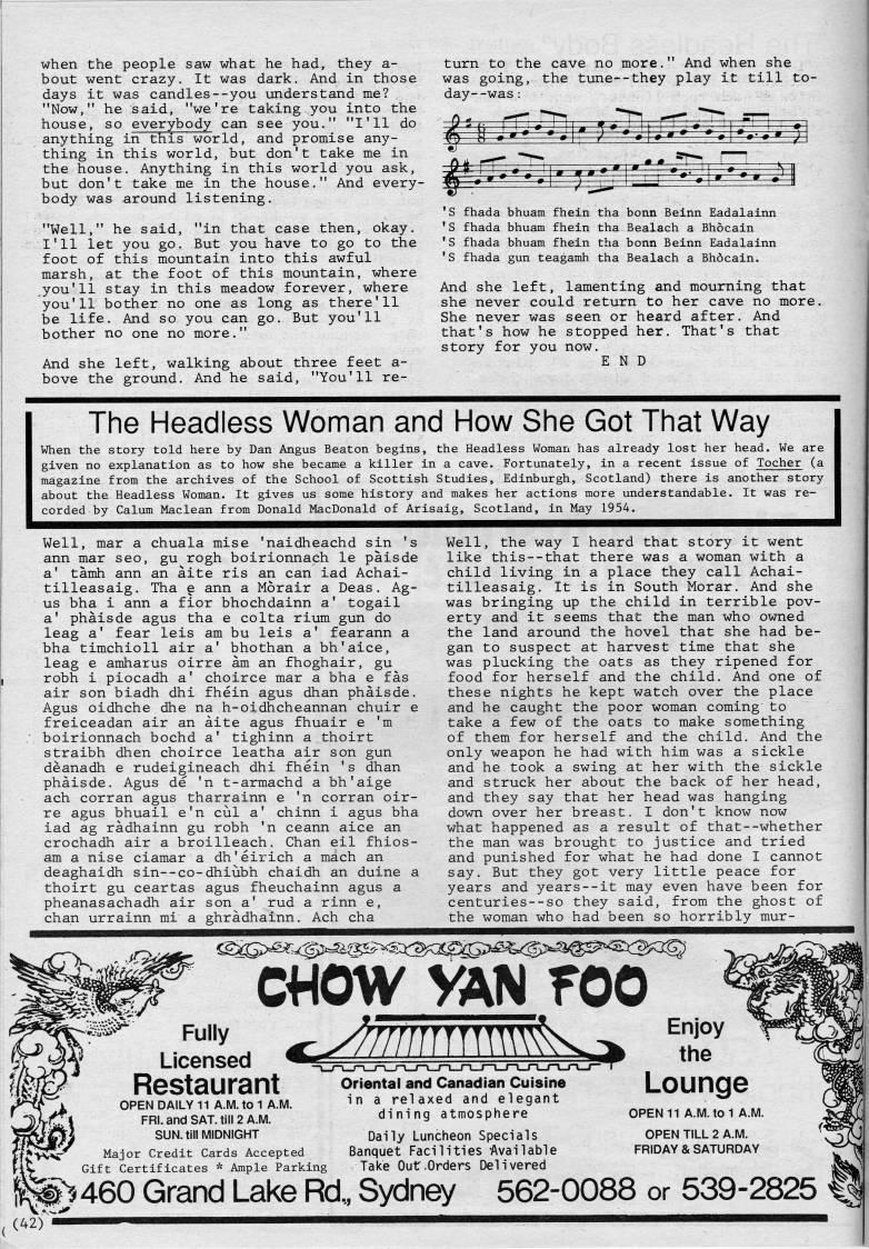 Published by Ronald Caplan on 1987/6/1 (404 reads)when the people saw what he had, they a- bout went crazy. It was dark. And in those days it was candles--you understand me? "Now," he said, "we're taking you into the house, so everybody can see you." "I'll do anything in this world, and promise any? thing in this world, but don't take me in the house. Anything in this world you ask, but don't take me in the house." And every? body was around listening. "Well," he said, "in that case then, okay. I'll let you go. But you have to go to the foot of this mountain into this awful marsh, at the foot of this mountain, where you'll stay in this meadow forever, where you'll bother no one as long as there'll be life. And so you can go. But you'll bother no one no more." And she left, walking about three feet a- bove the ground. And he said, "You'll re? turn to the cave no more." And when she was going, the tune--they play it till to? day- -was: fhada bhuam fhein tha bonn Beinn Eadalainn 'S fhada bhuam fhein tha Bealach a Bhocain 'S fhada bhuam fhein tha bonn Beinn Eadalainn 'S fhada gun teagamh tha Bealach a Bhocain. And she left, lamenting and mourning that she never could return to her cave no more. She never was seen or heard after. And that's how he stopped her. That's that story for you now. END The Headless Woman and How She Got That Way When the story told here by Dan Angus Beaton begins, the Headless Woman has already lost her head. We are given no explanation as to how she became a killer in a cave. Fortunately, in a recent issue of Tocher (a magazine from the archives of the School of Scottish Studies, Edinburgh, Scotland) there is another story about the Headless Woman. It gives us some history and makes her actions more understandable. It was re? corded by Calum Maclean from Donald MacDonald of Arisaig, Scotland, in May 1954. Well, mar a chuala mise 'naidheachd sin 's ann mar seo, gu rogh boirionnach le paisde a' tamh ann an aite ris an can iad Achai- tilleasaig. Tha e ann a Morair a Deas. Ag? us bha i ann a fior bhochdainn a' togail a' phaisde agus tha e colta rium gun do leag a' fear leis am bu leis a' fearann a bha timchioll air a' bhothan a bh'aice, leag e amharus oirre am an fhoghair, gu robh i piocadh a' choirce mar a bha e fas air son biadh dhi fhein agus dhan phaisde. Agus oidhche dhe na h-oidhcheannan chuir e freiceadan air an aite agus fhuair e 'm boirionnach bochd a' tighinn a thoirt straibh dhen choirce leatha air son gun deanadh e rudeigineach dhi fhein 's dhan phaisde. Agus de 'n t-armachd a bh'aige ach corran agus tharrainn e 'n corran oir? re agus bhuail e'n cul a' chinn i agus bha iad ag radhainn gu robh 'n ceann aice an crochadh air a broilleach. Chan eil fhios? am a nise ciamar a dh'eirich a mach an deaghaidh sin--co-dhiubh chaidh an duine a thoirt gu ceartas agus fheuchainn agus a pheanasachadh air son a' rud a rinn e, chan urrainn mi a ghradhainn. Ach cha Well, the way I heard that story it went like this--that there was a woman with a child living in a place they call Achai- tilleasaig. It is in South Morar. And she was bringing up the child in terrible pov? erty and it seems that the man who owned the land around the hovel that she had be? gan to suspect at harvest time that she was plucking the oats as they ripened for food for herself and the child. And one of these nights he kept watch over the place and he caught the poor woman coming to take a few of the oats to make something of them for herself and the child. And the only weapon he had with him was a sickle and he took a swing at her with the sickle and struck her about the back of her head, and they say that her head was hanging down over her breast. I don't know now what happened as a result of that--whether the man was brought to justice and tried and punished for what he had done I cannot say. But they got very little peace for years and years--it may even have been for centuries--so they said, from the ghost of the woman who had been so horribly mur- Fully Licensed cfiow Van f00 Restaurant OPEN DAILY 11 A.M. to 1 A.M. FRI. and SAT. till 2 A.M. SUN. till MIDNIGHT Major Credit Cards Accepted Gift Certificates * Ample Parking Oriental and Canadian Cuisine in a relaxed and elegant dining atmosphere Daily Luncheon Specials Banquet Facilities Available Take Out .Orders Delivered s'M60 Grand Lake Rd,, Sydney 562-0088 or 539-2825 (42) Lounge OPEN 11 A.M.tOl A.M. OPEN TILL 2 A.M. FRIDAY & SATURDAY