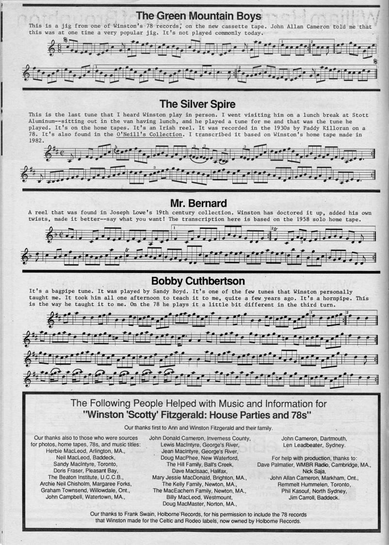 Published by Ronald Caplan on 1987/8/1 (710 reads)The Green Mountain Boys This is a jig from one of Winston's 78 records,' on the new cassette tape. John Allan Cameron told me that this was at one time a very popular jig. It's not played commonly today. The Silver Spire This is the last tune that I heard Winston play in person. I went visiting him on a lunch break at Stott Aluminum • sitting out in the van having lunch, and he played a tune for me and that was the tune he played. It's on the home tapes. It's an Irish reel. It was recorded in the 1930s by Paddy Killoran on a 78. It's also found in the O'Neill's Collection. I transcribed it based on Winston's home tape made in 1982. $%''' 1 n rr'L' Q''' ' _ , 1 . rrn 9 ill 3'_y, * • - 3 A p-, _n 1 • -*-zf' 3 rTTl • 1 1J L '' ' ' M 1 ' *' ?? 11II r ' # • qg:*- '' Mr. Bernard A reel that was found in Joseph Lowe's 19th century collection. Winston has doctored it up, added his own twists, made it better • say what you want! The transcription here is based on the 1958 solo home tape. 1' ' ' ' II I I , II,, r' I I I "T . I , , ,. ' ' rr r' 'IJ JJ' J J JIJJ'JjJJJIJ JJ ' J J Jl'' *-'vjj J 'II J jJ''fJJ. il'lJIJI'll'l '' ' ' dd 'L-LJ • i MM I L'i Liiiiiii il-'=i=H • Bobby Cuthbertson It's a bagpipe tune. It was played by Sandy Boyd. It's one of the few tunes that Winston personally taught me. It took him all one afternoon to teach it to me, quite a few years ago. It's a hornpipe. This is the way he taught it to me. On the 78 he plays it a little bit different in the third turn. The Following People Helped with Music and Information for "Winston 'Scotty' Fitzgerald: House Parties and 78s" Our thanks first to Ann and Winston Fitzgerald and their family. Our thanks also to those who were sources for photos, home tapes, 78s, and music titles: Herbie MacLeod, Arlington, MA., Neil MacLeod, Baddeck, Sandy Maclntyre, Toronto, Doris Fraser, Pleasant Bay, The Beaton Institute, U.C.C.B., Archie Neil Chisholm, Margaree Forks, Graham Townsend, Willowdale, Ont., John Campbell, Watertown, MA., John Donald Cameron, Inverness County, Lewis Maclntyre, George's River, Jean Maclntyre, George's River, Doug MacPhee, New Waterford, The Hill Family, Ball's Creek, Dave Maclsaac, Halifax, Mary Jessie MacDonald, Brighton, MA., The Kelly Family, Newton, MA., The MacEachern Family, Newton, MA., Billy MacLeod, Westmount, Doug MacMaster, Norton, MA., John Cameron, Dartmouth, Len Leadbeater, Sydney. For help with production, thanks to: Dave Palmatier, WMBR Radio, Cambridge, MA., Nick Saja, John Allan Cameron, Markham, Ont., Remmelt Hummelen, Toronto, Phil Kasouf, North Sydney, Jim Can-oil, Baddeck. Our thanks to Frank Swain, Holborne Records, for his permission to include the 78 records that Winston made for the Celtic and Rodeo labels, now owned by Holborne Records.